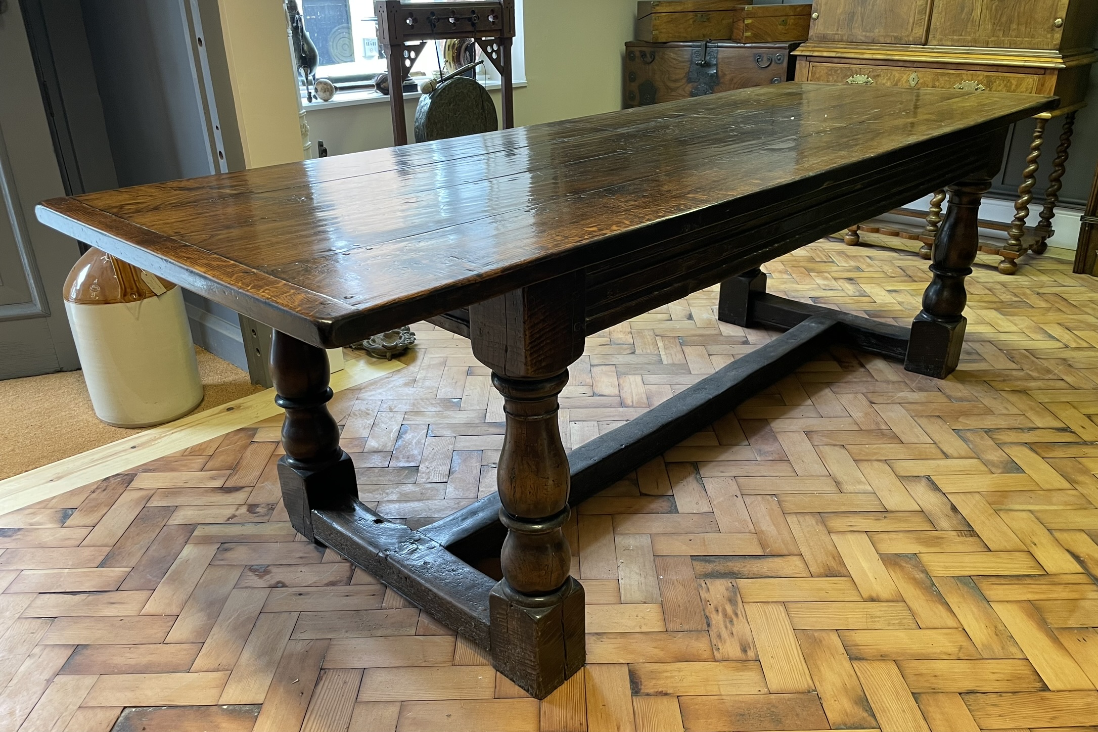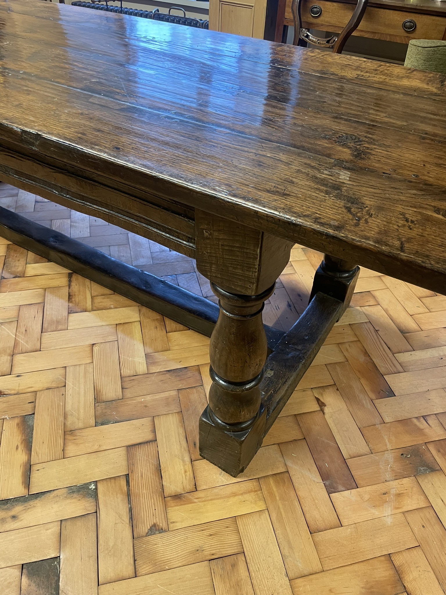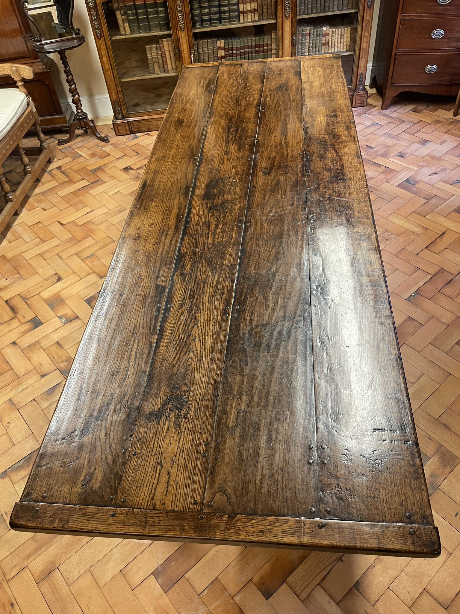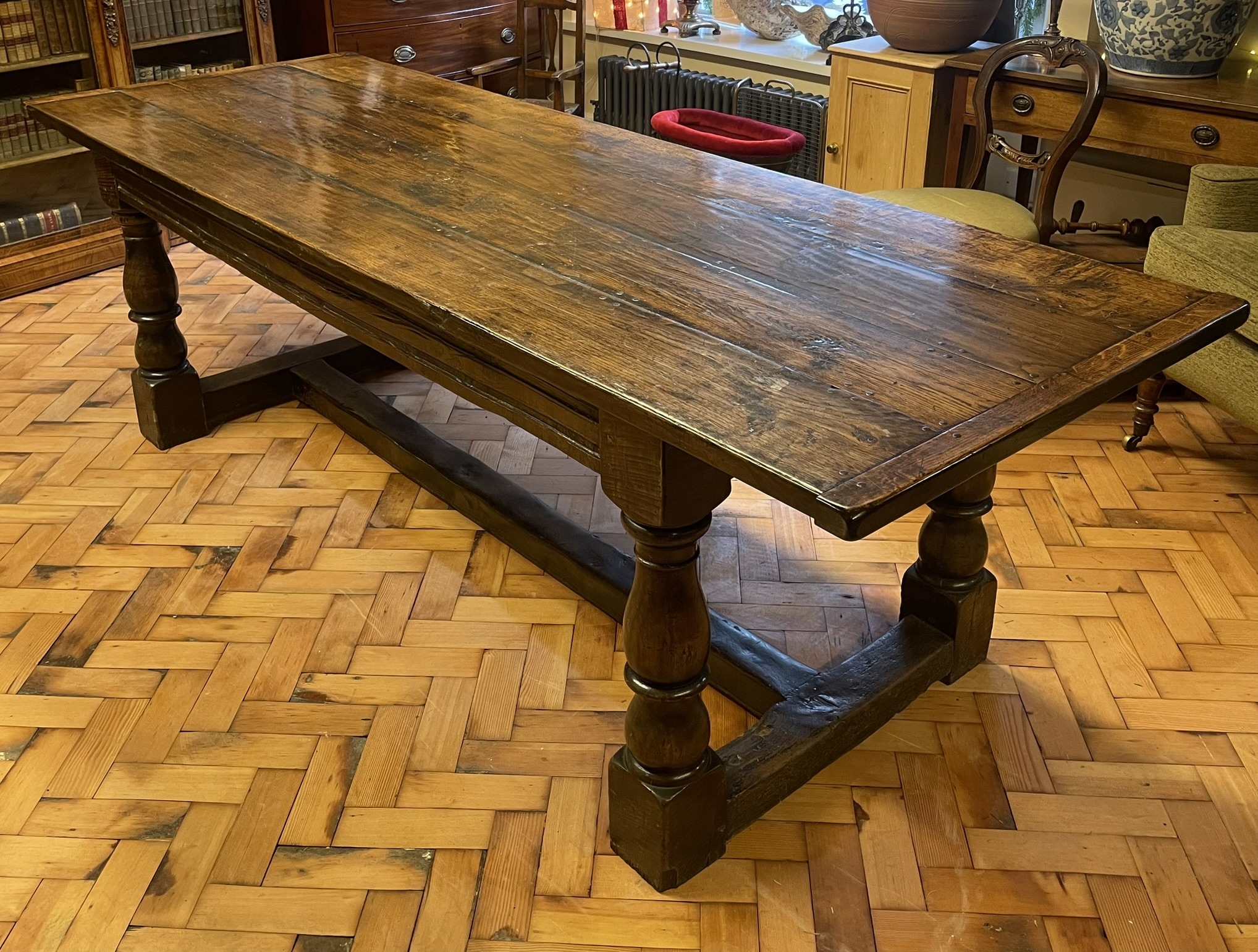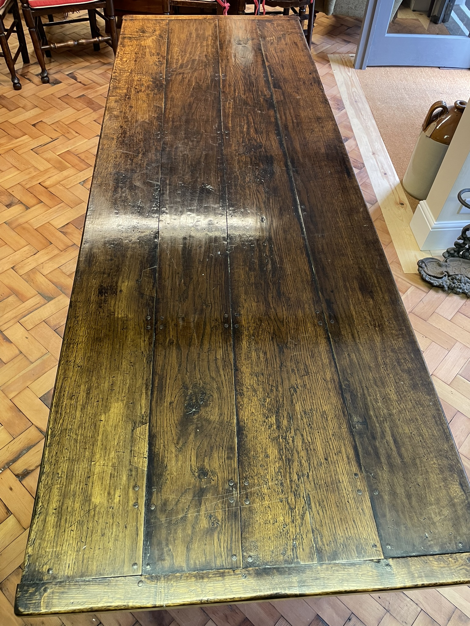 A Large Oak 4 Plank Dining Table With Central Floor Stretcher. 243.5cm length, 83.5cm wide, 76cm high