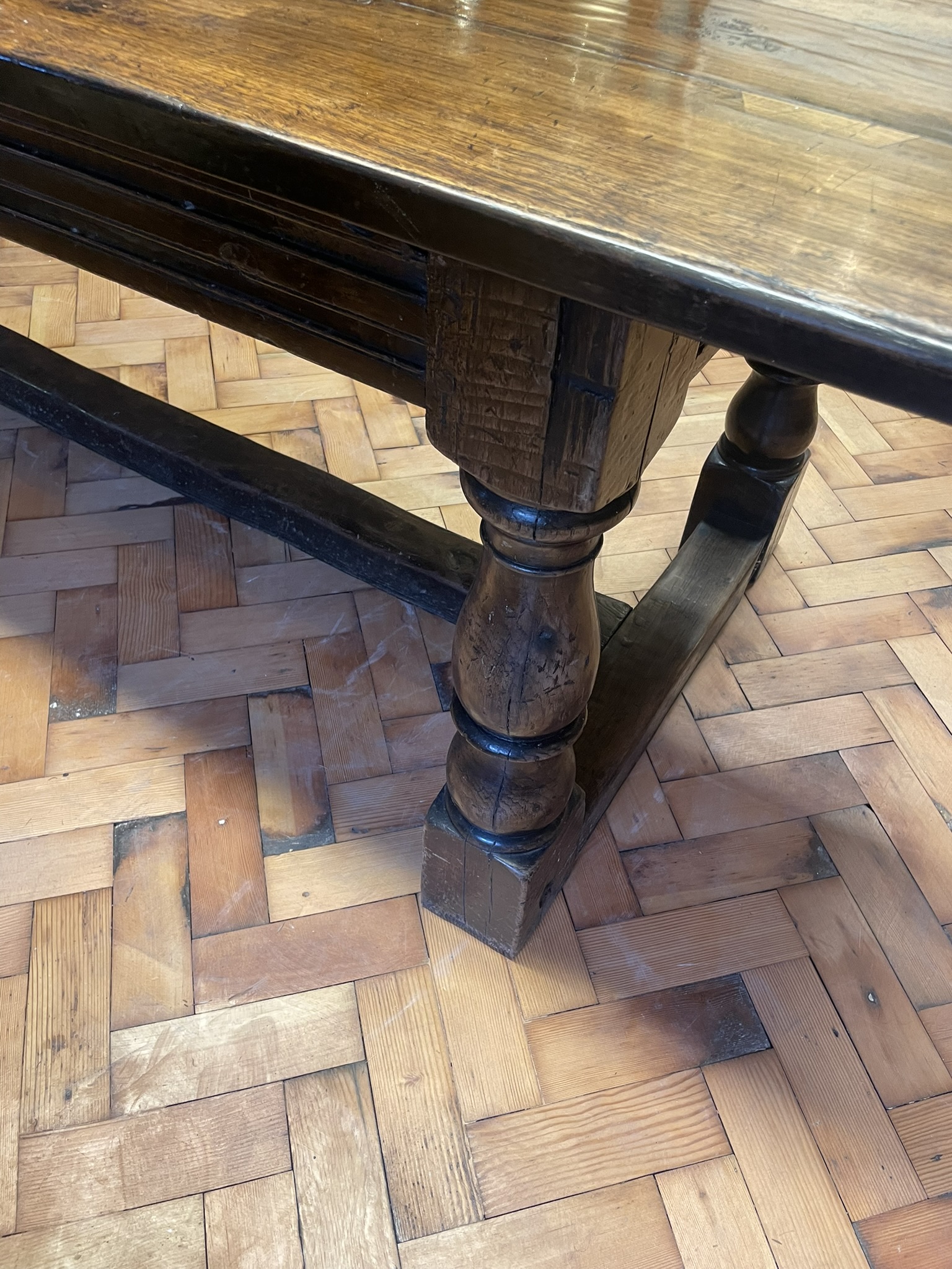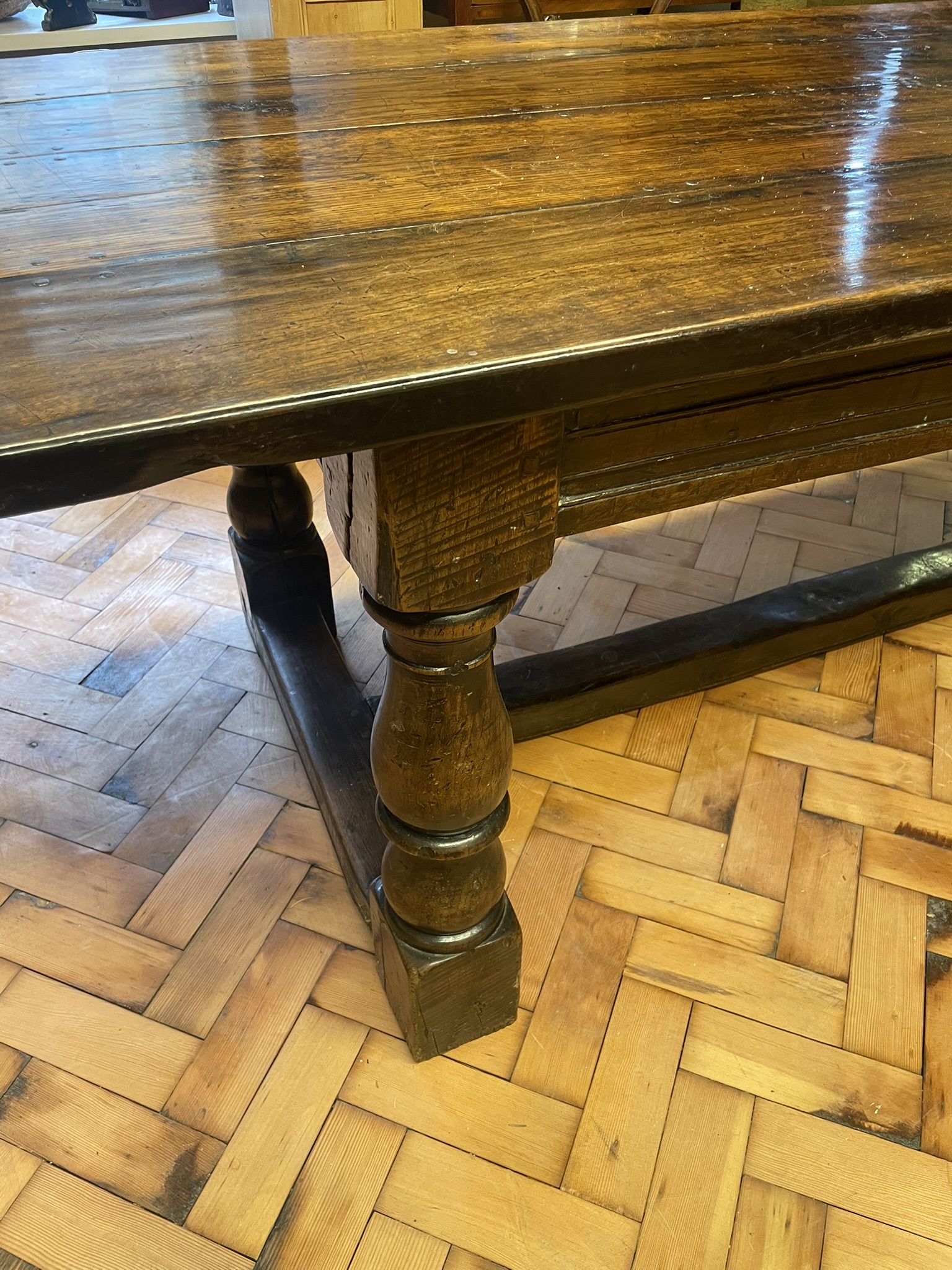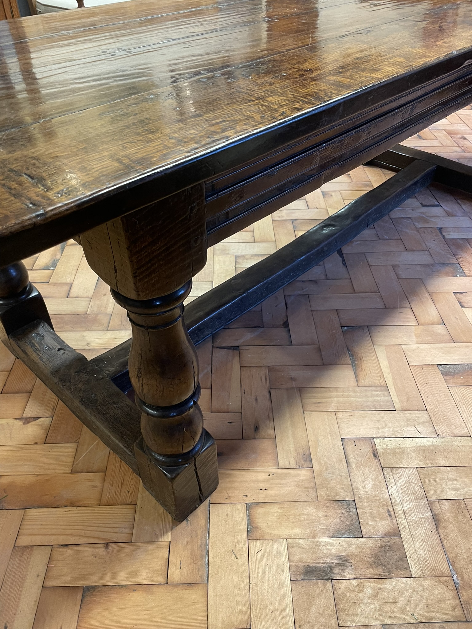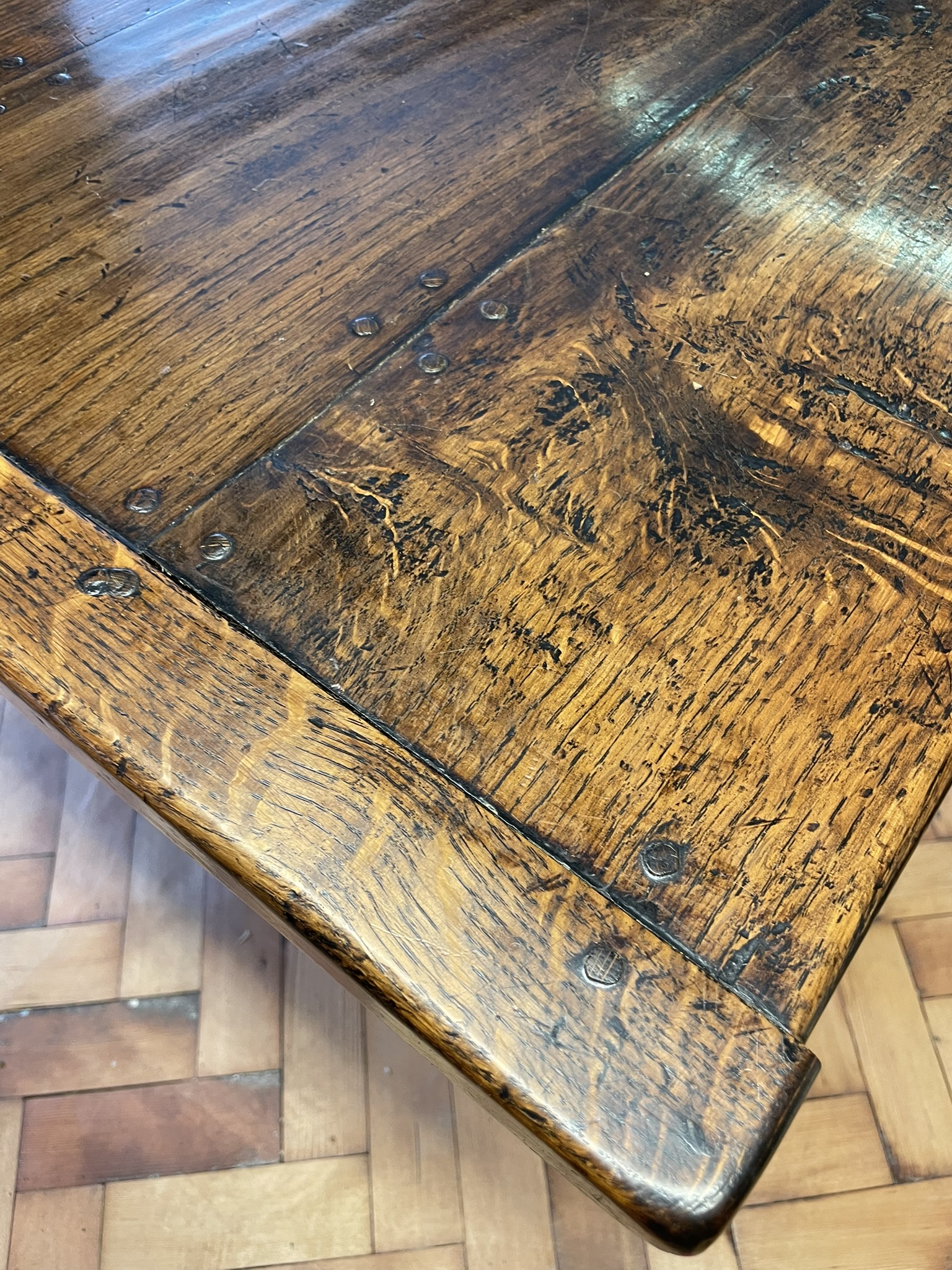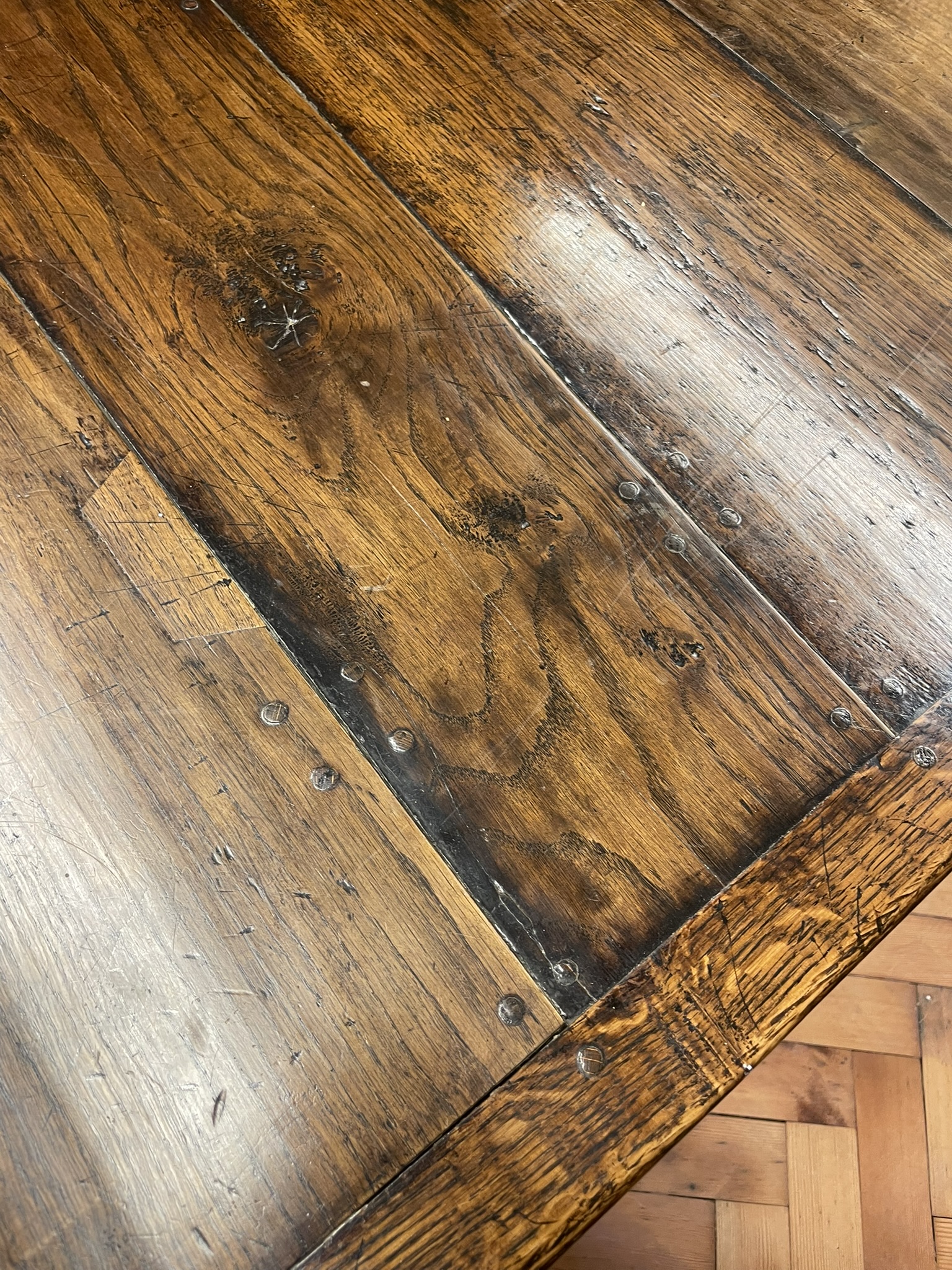 A Large Oak 4 Plank Dining Table With Central Floor Stretcher. 243.5cm length, 83.5cm wide, 76cm high