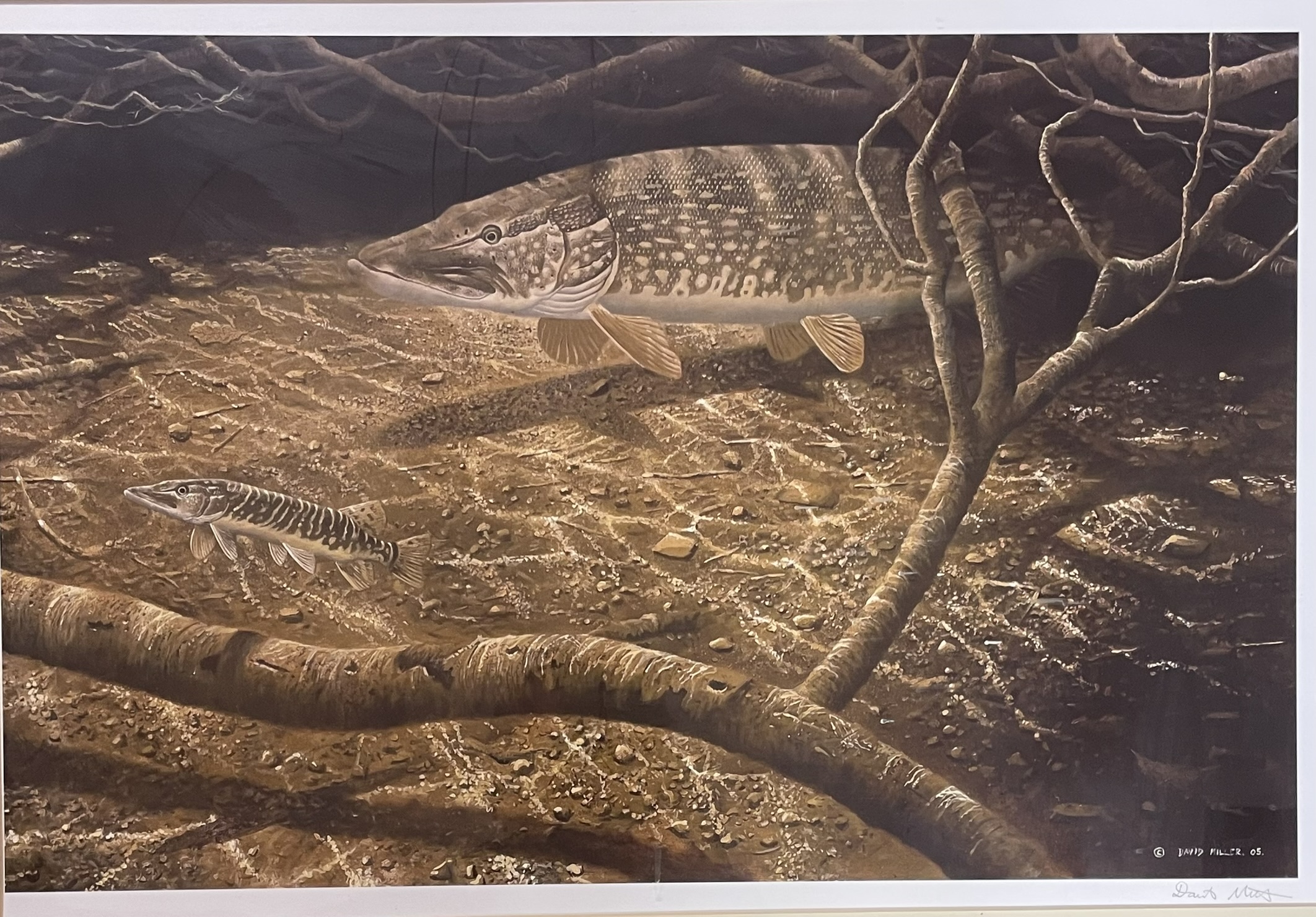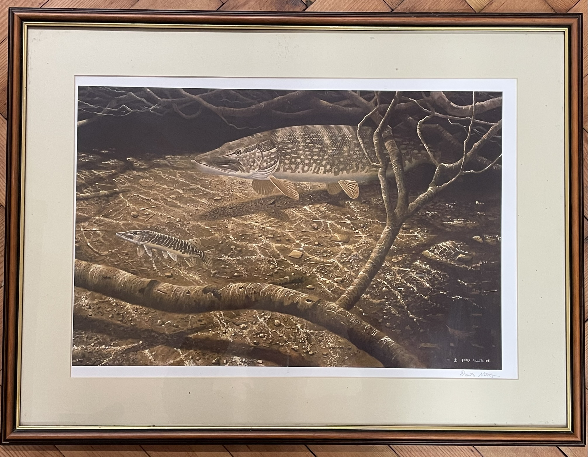A large signed David Miller print of a Pike. Approx 73cm x 55cm