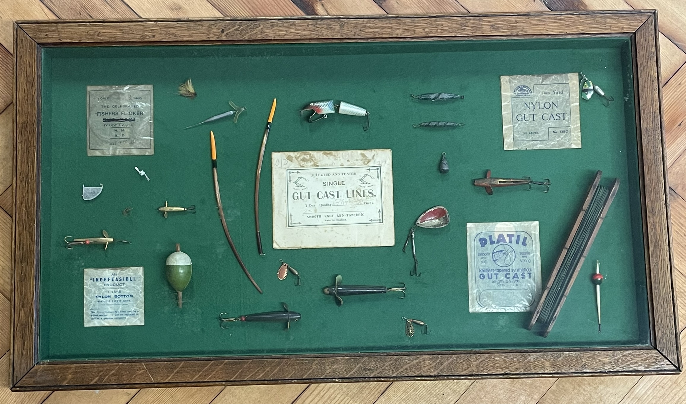 A Large Oak Framed Wall Display Case With Vintage Fishing Tackle And Equipment. Approx 83cm x 47cm