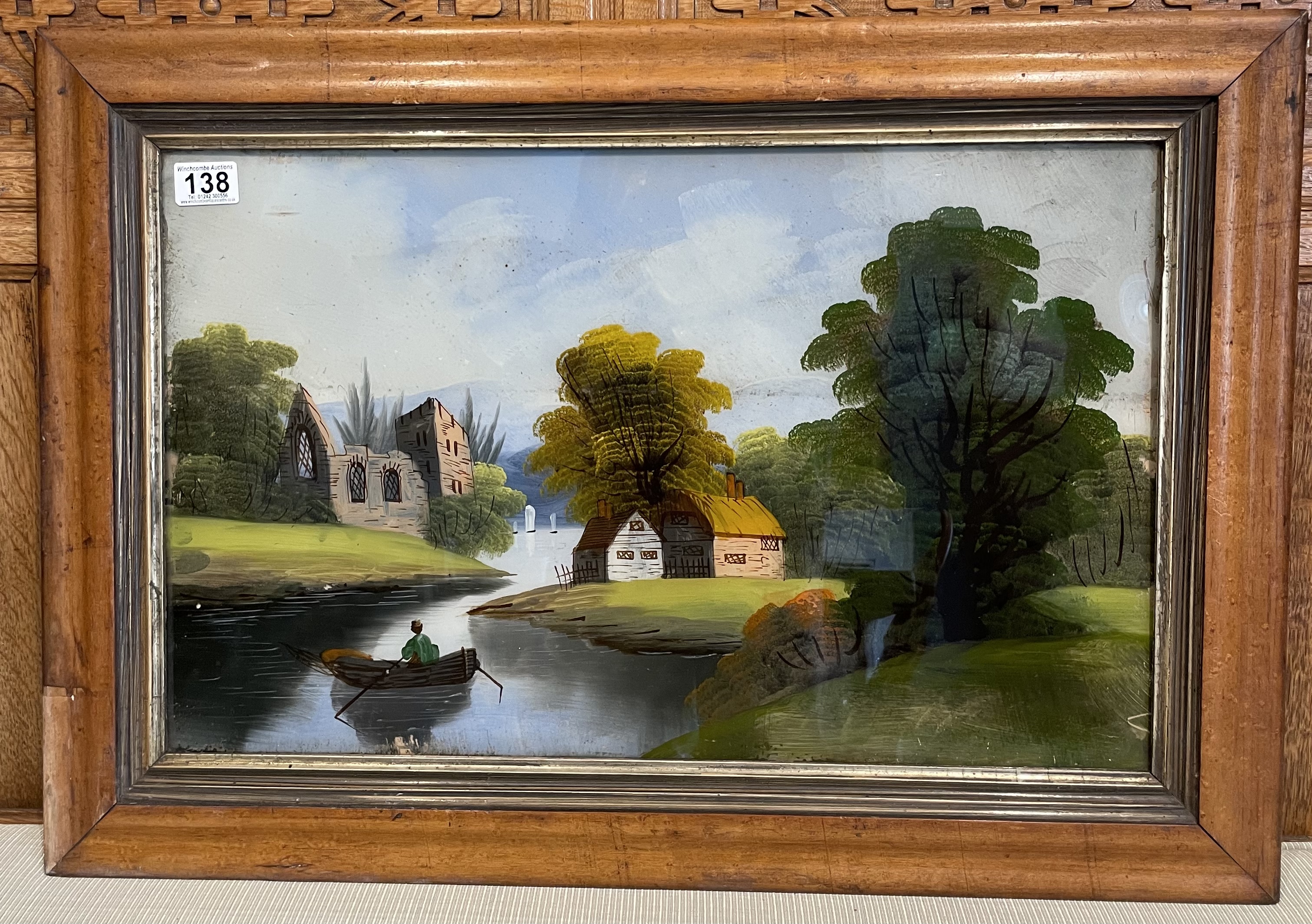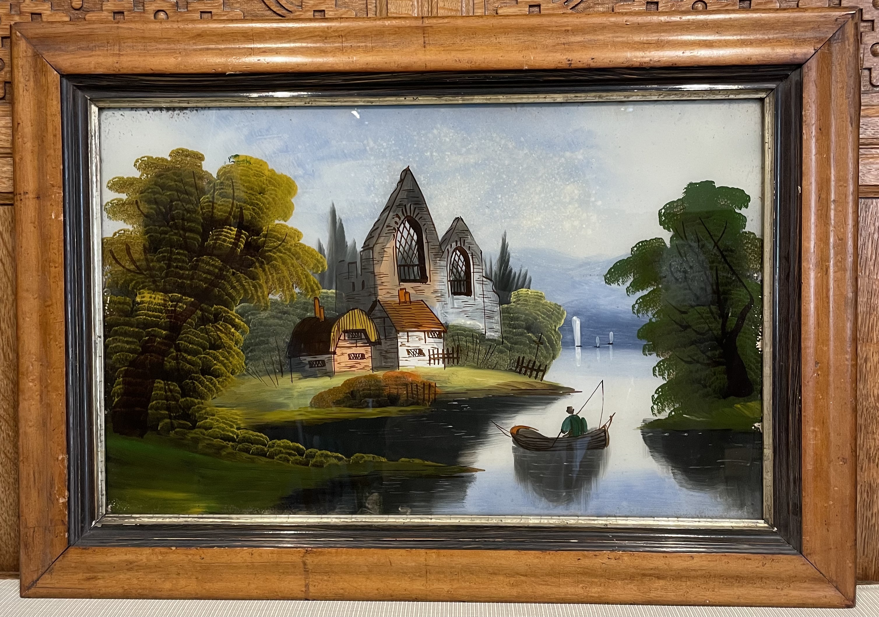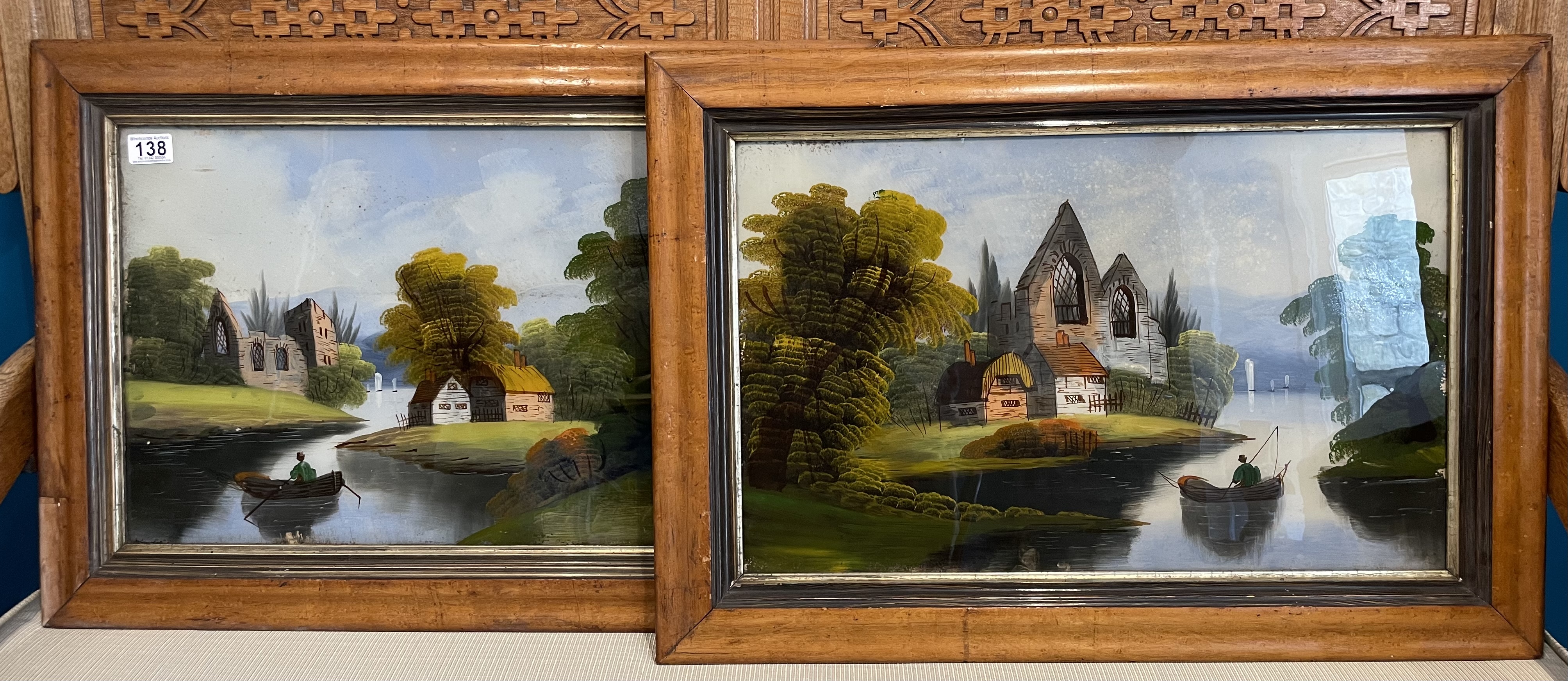 Two Victorian Reverse Painted On Glass Painting In Maple Frames