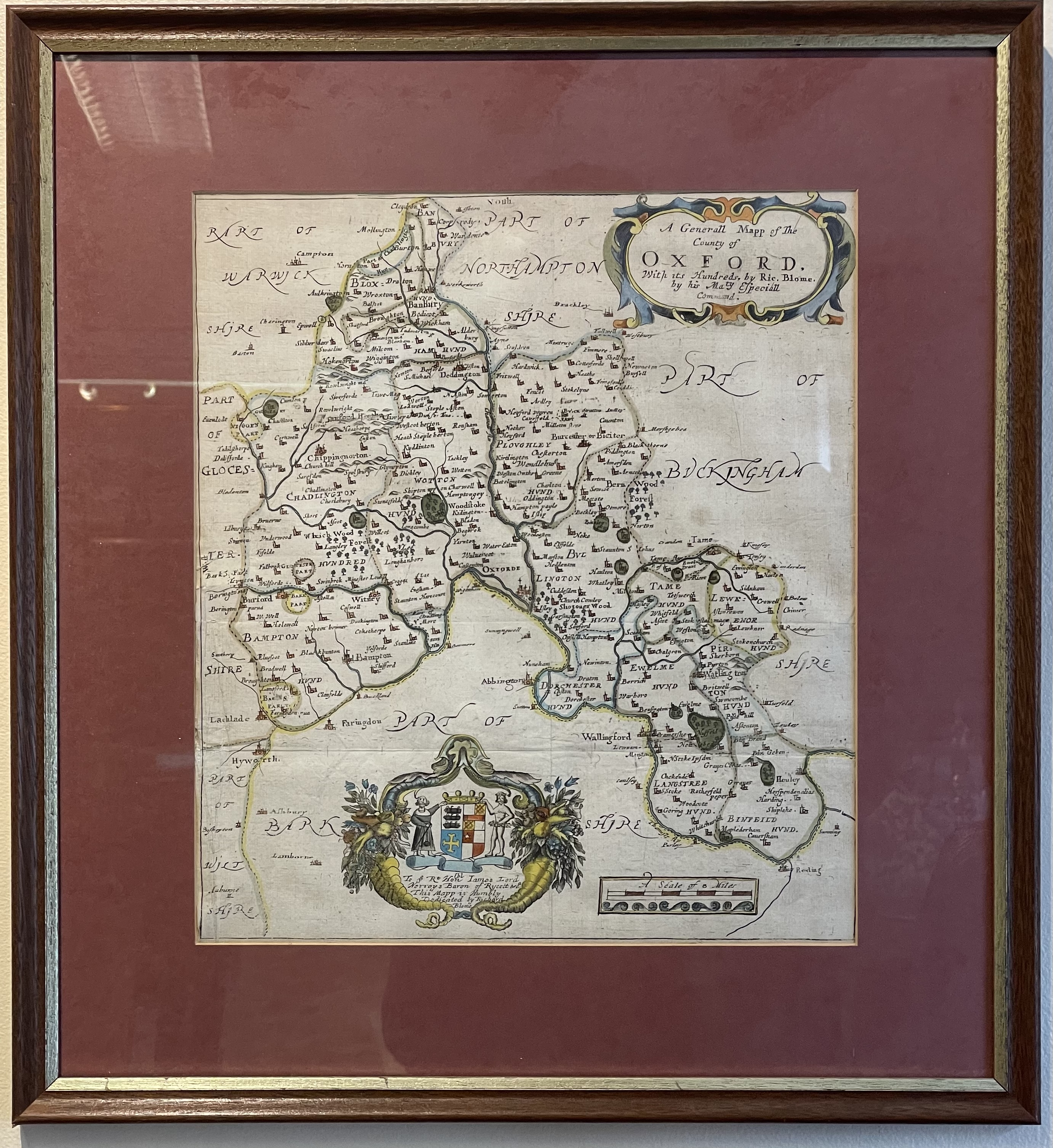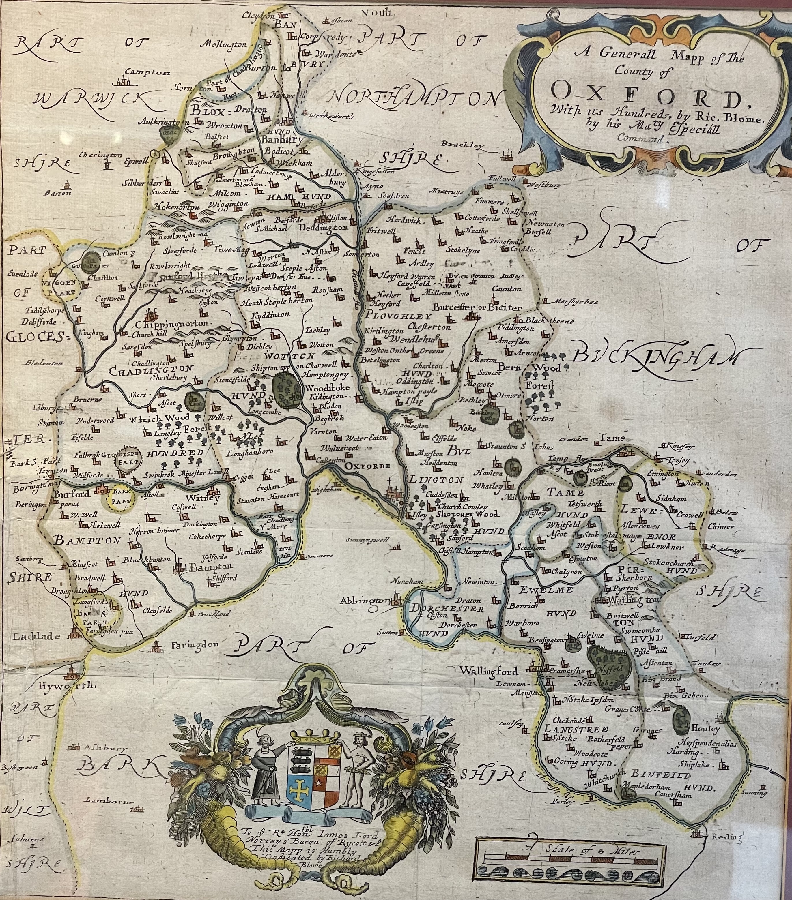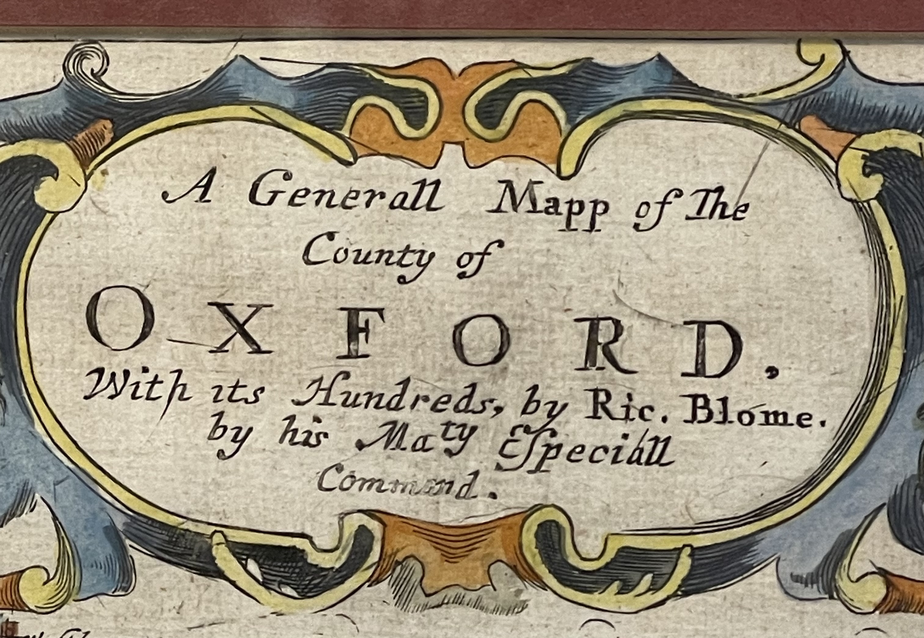 This hand-colored copperplate engraved map is titled A Generall Mapp of The County of OXFORD and was produced by cartographer Richard Blome. The map features an ornate title cartouche in the upper right corner stating it was created by his Maty Especiall Command. A decorative dedication cartouche is located at the bottom center addressed to the Rt Hon James Lord Norreys Baron of Rycott which includes a hand-colored coat of arms flanked by two supporters. The cartography delineates the county hundreds, various towns, and topographical features. Bordering regions are identified as Bark Shire, Buckingham Shire, and Northampton Shire. The work includes a scale of miles at the bottom right. The map is presented in a wooden frame with a burgundy mat.