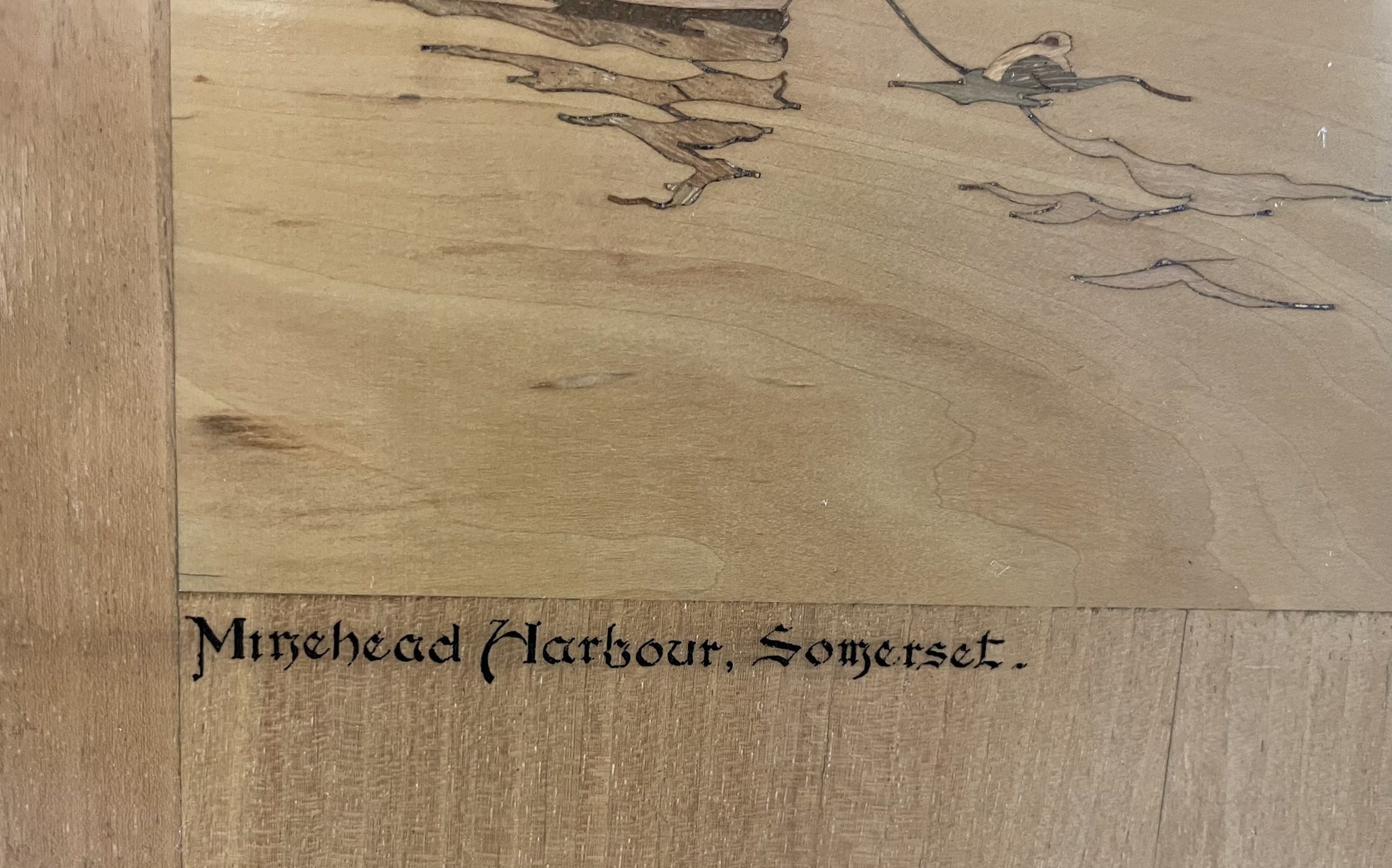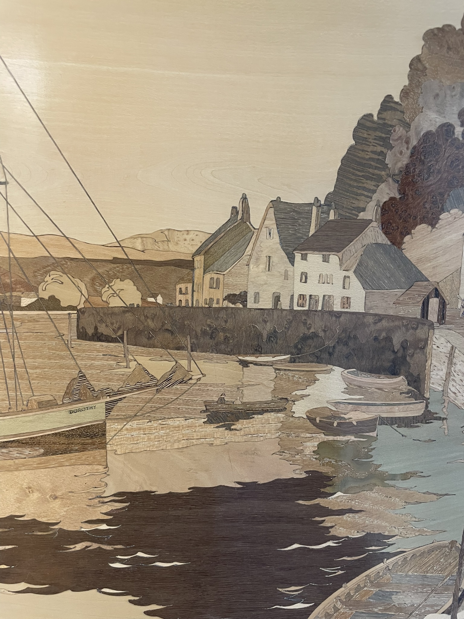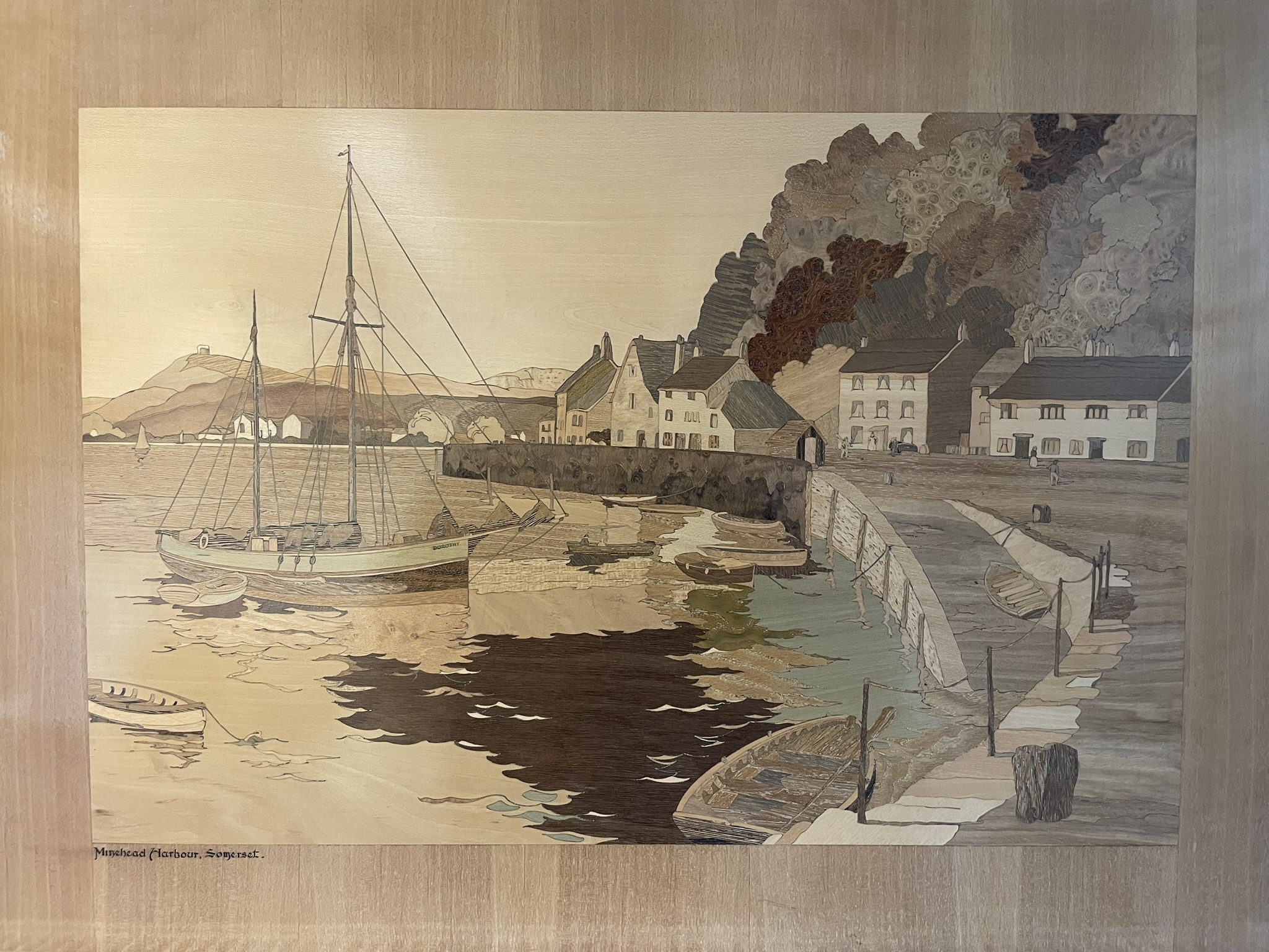 A Marquetry Picture Of Minehead Harbour, Somerset. Approx 65.7cm x 48cm