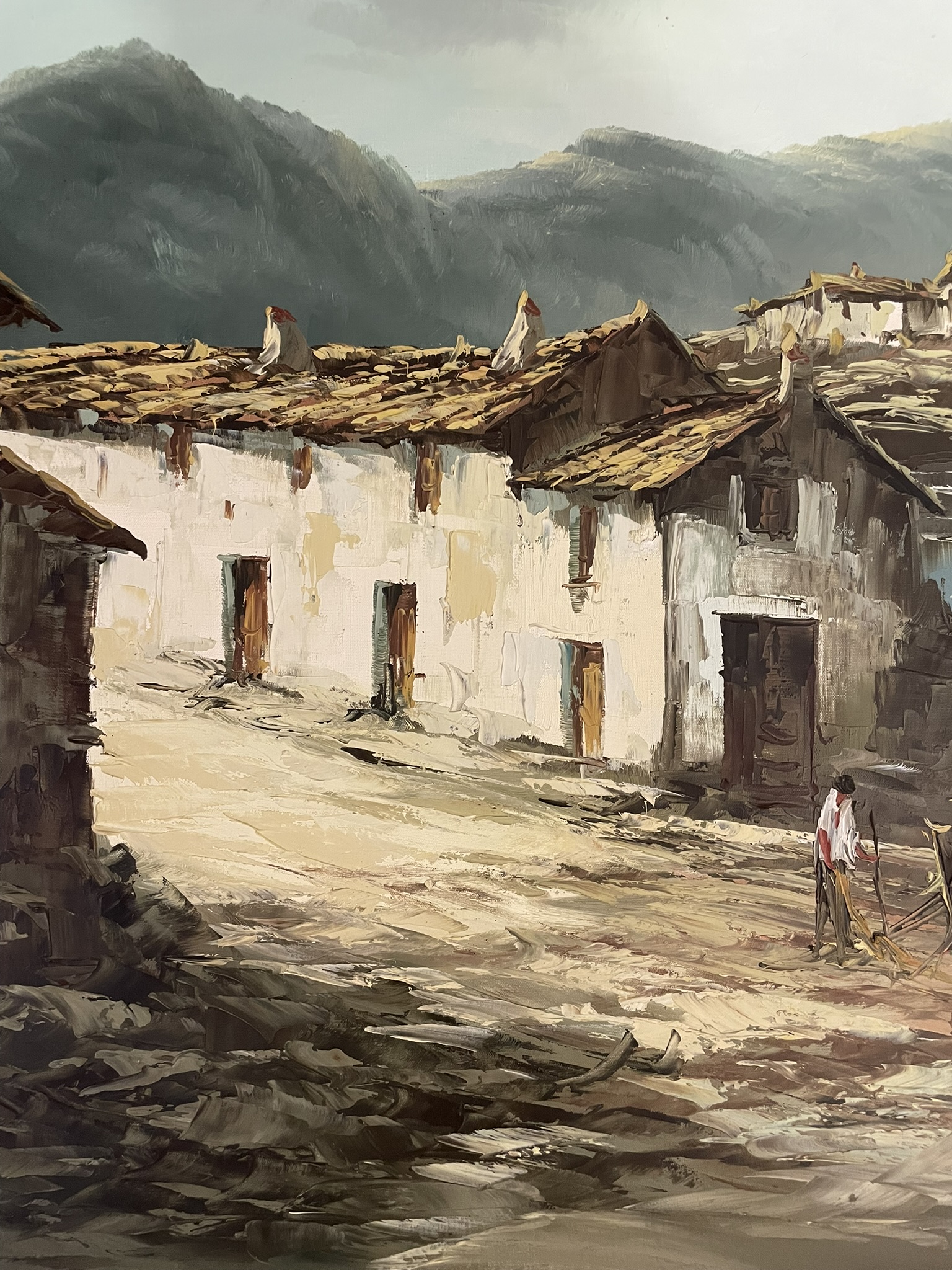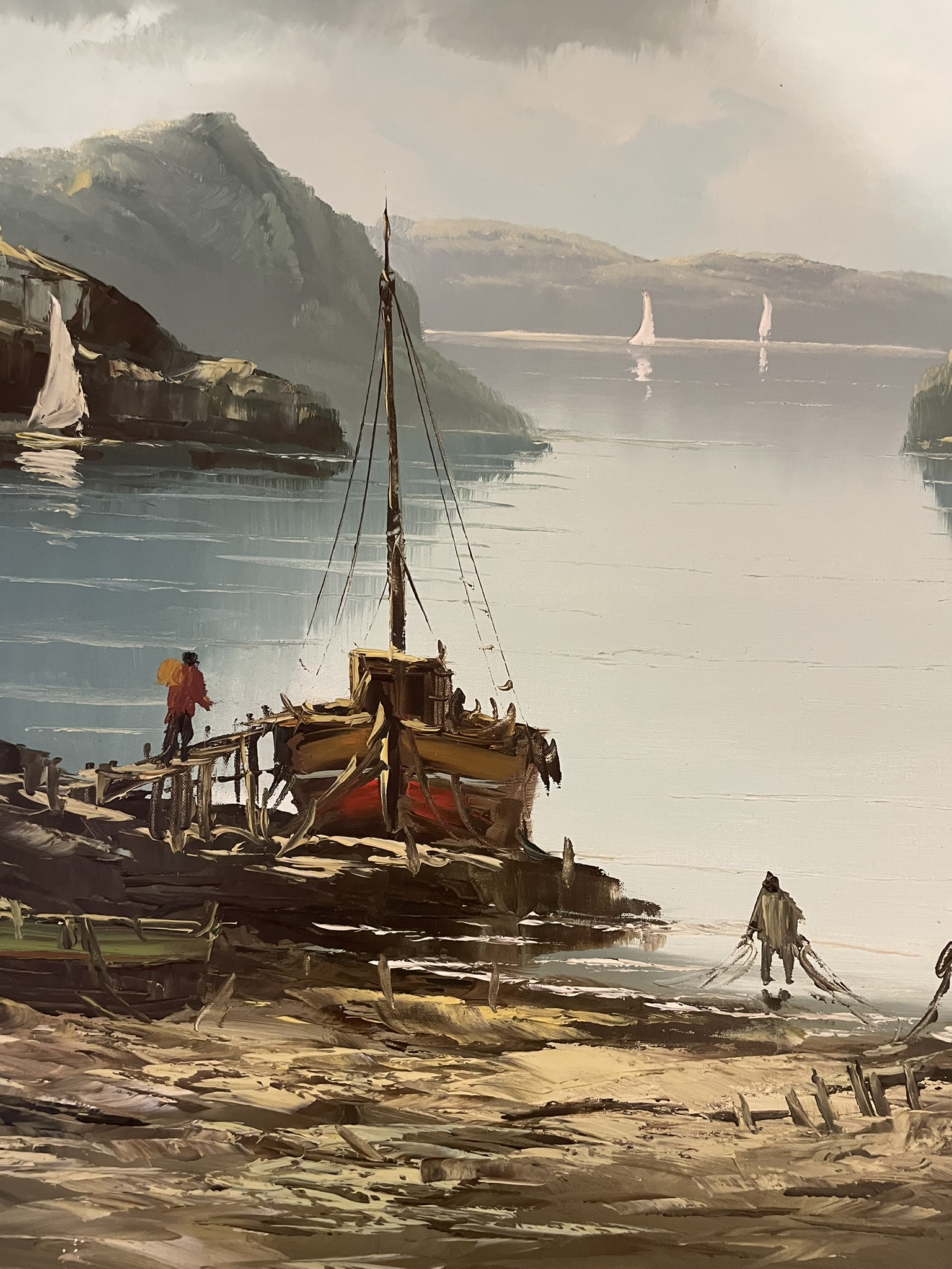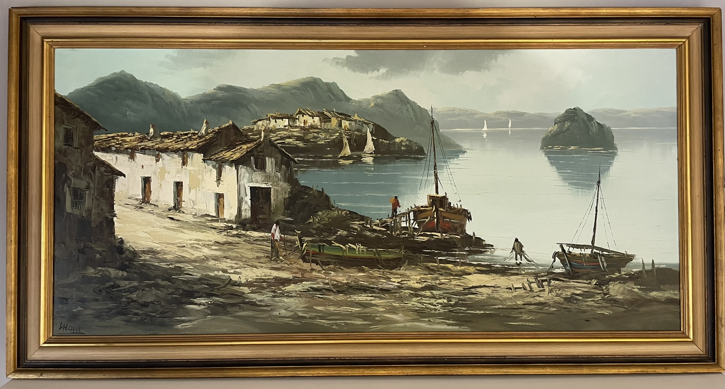 A Large Oil On Canvas Of A Fishing Village, Signed Thayut. Approx 144cm x 74cm