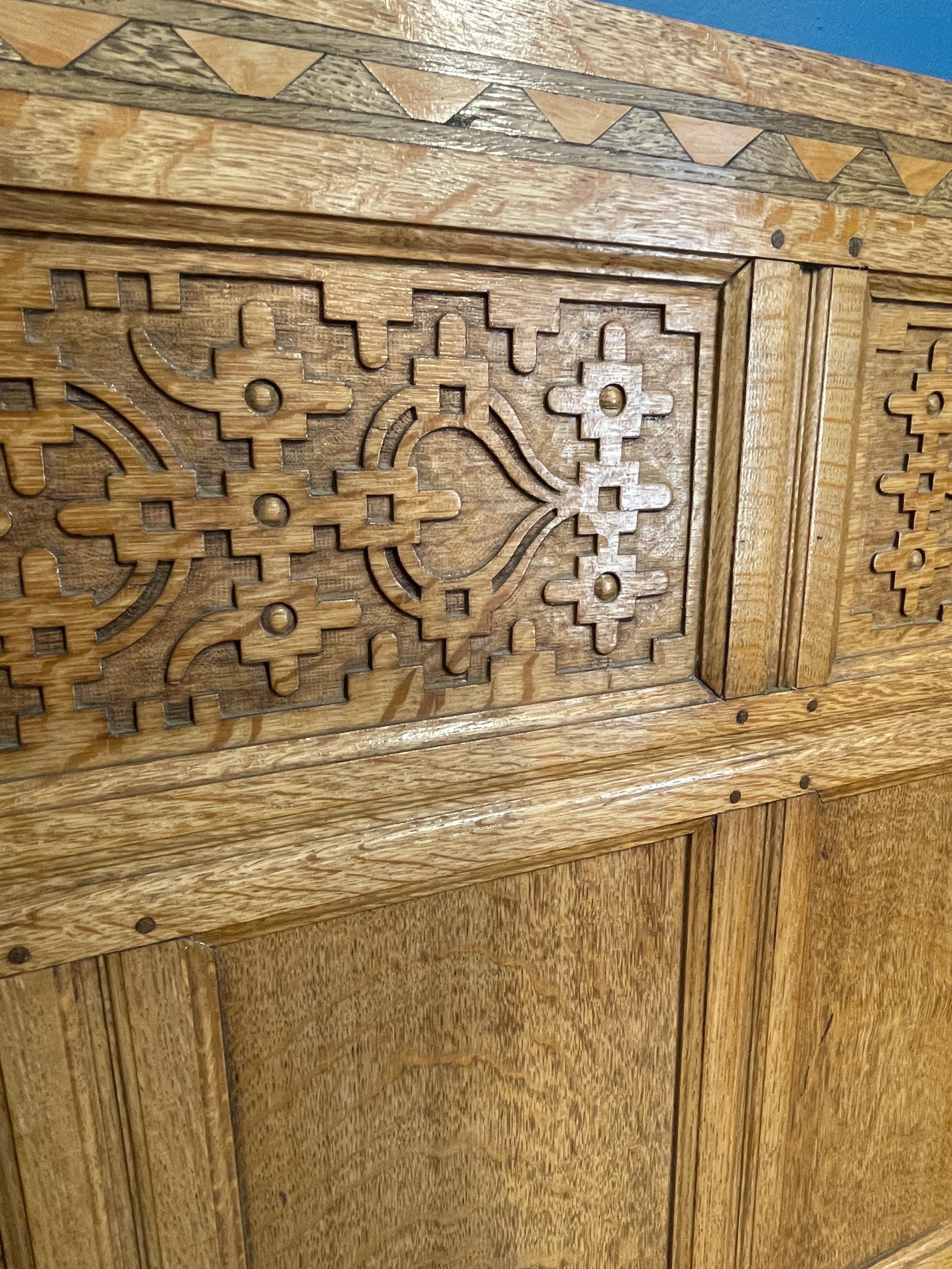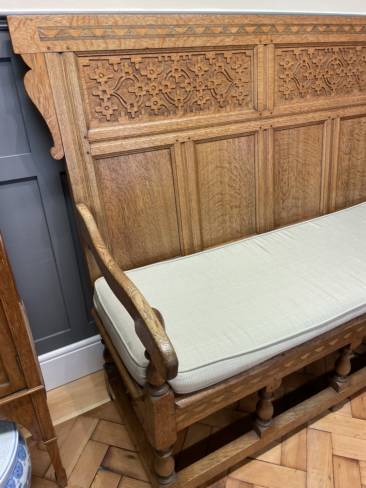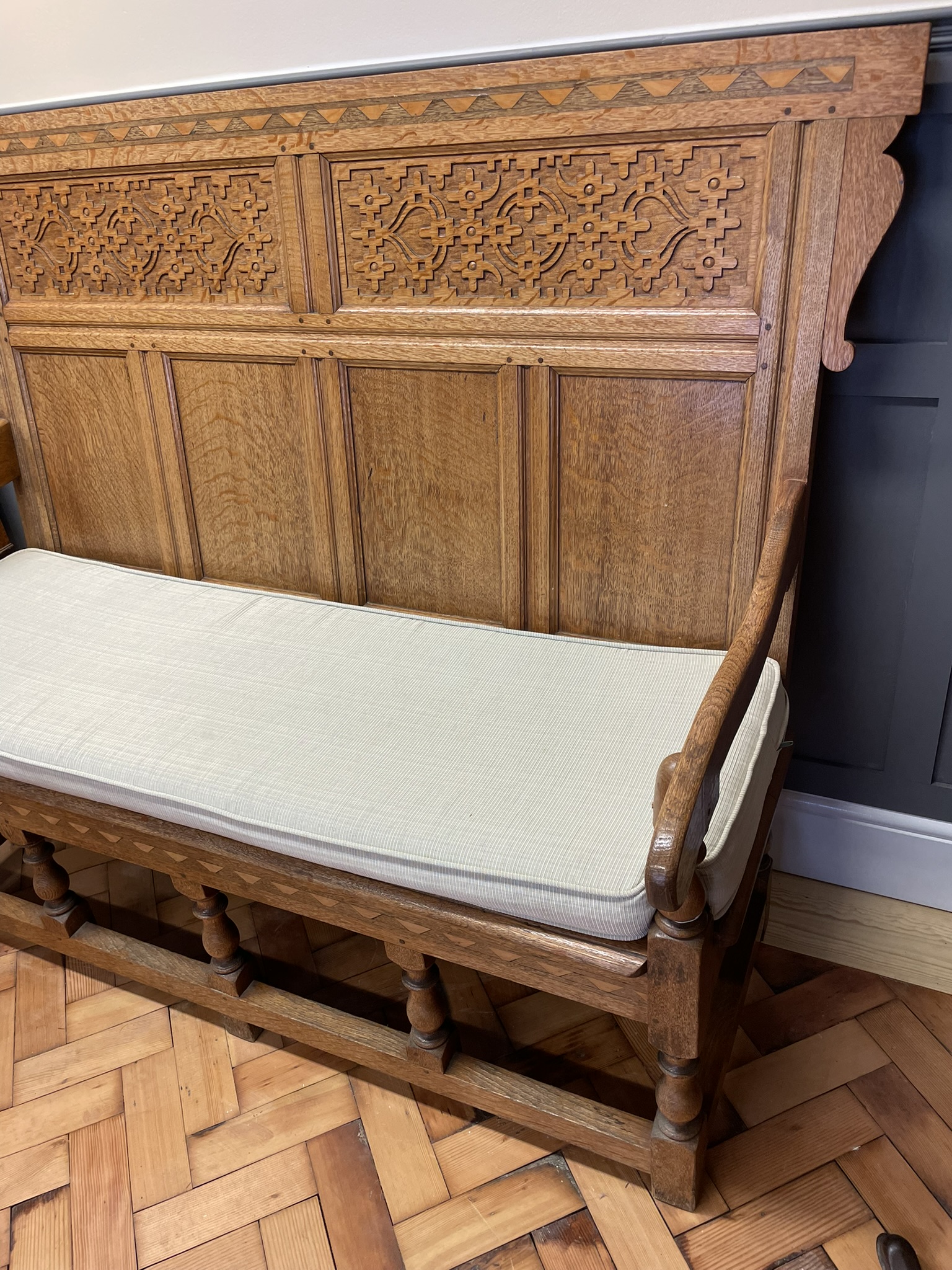 An Arts And Craft Carved Oak Settle With Cushion Seat Approx 150.5cm wide x 120cm high