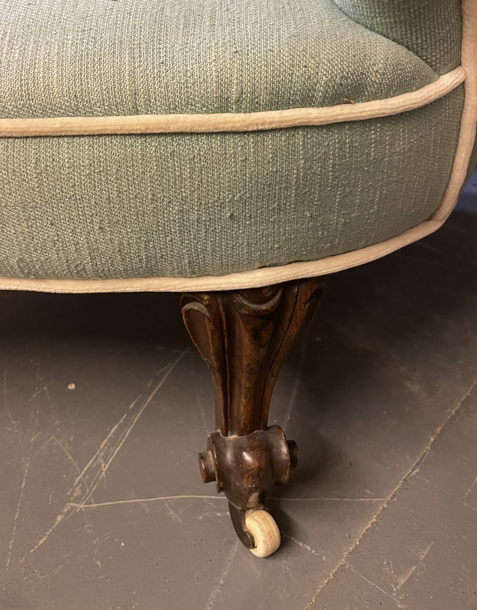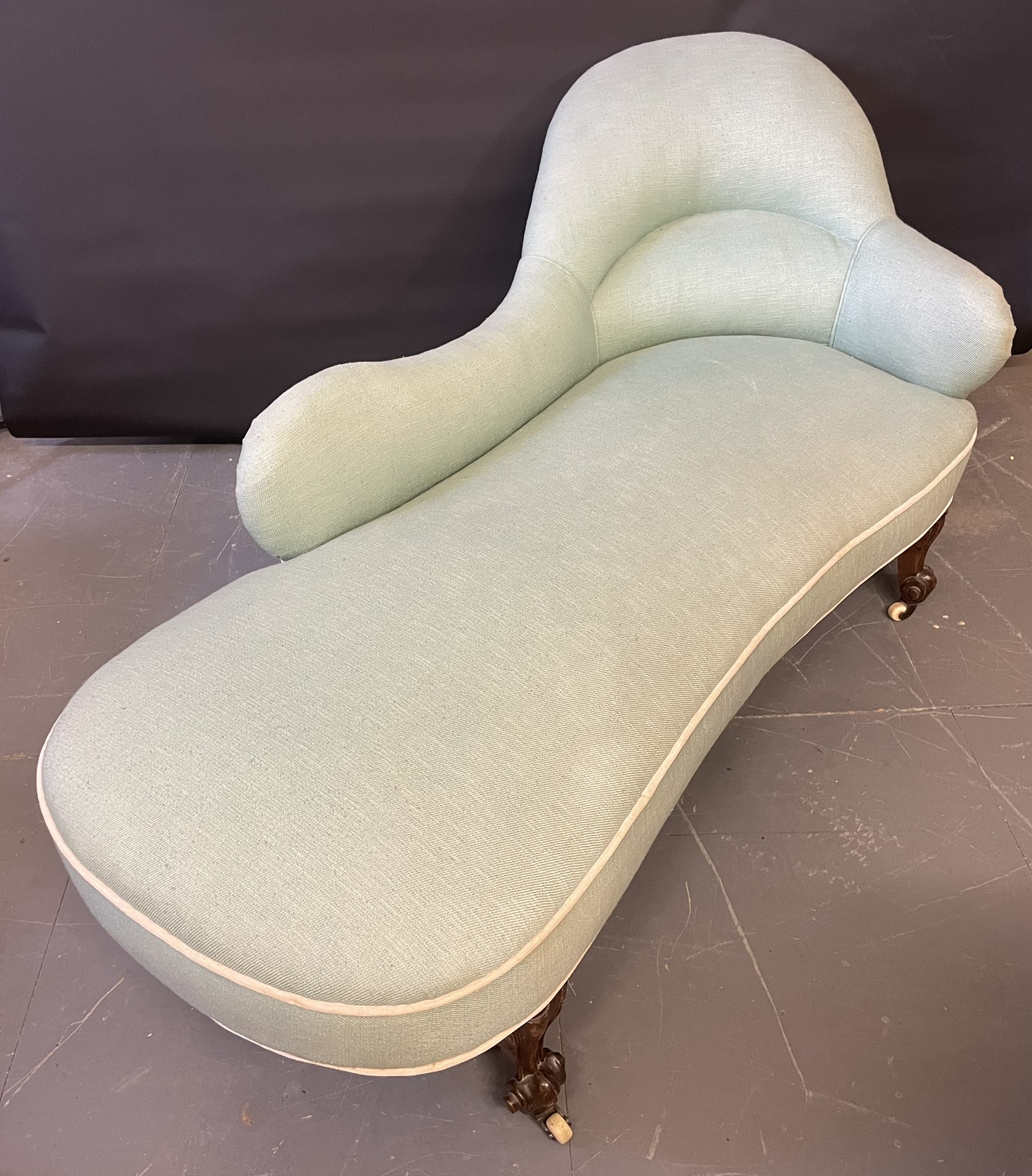 A Victorian chaise lounge on porcelain casters. Condition: Sound frame. No rips or major marks on fabric