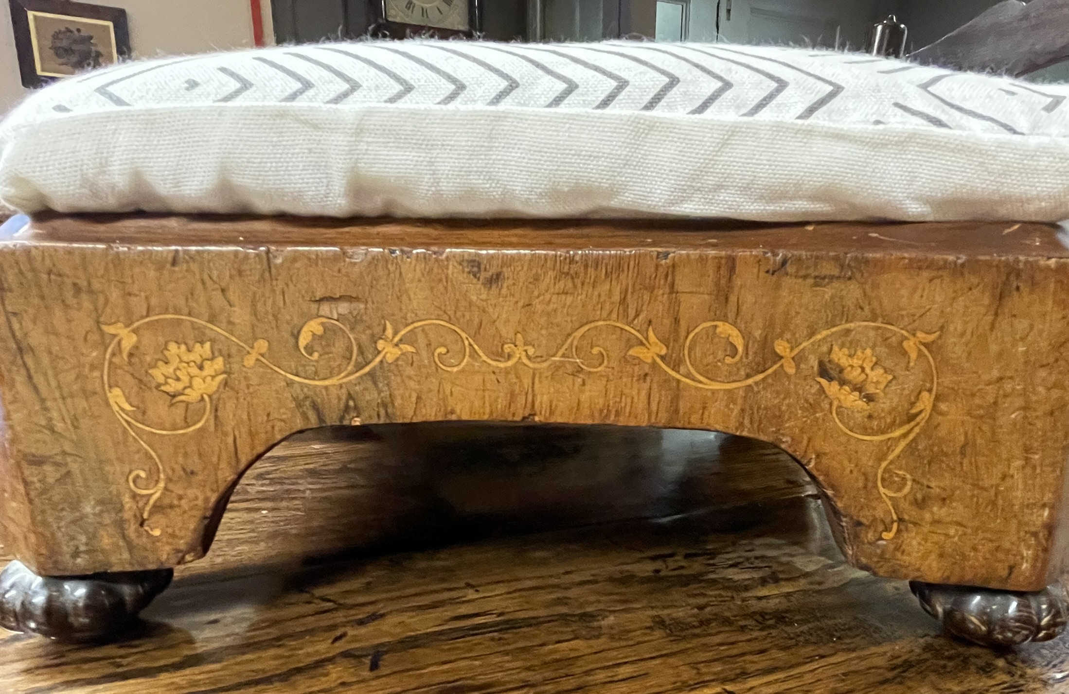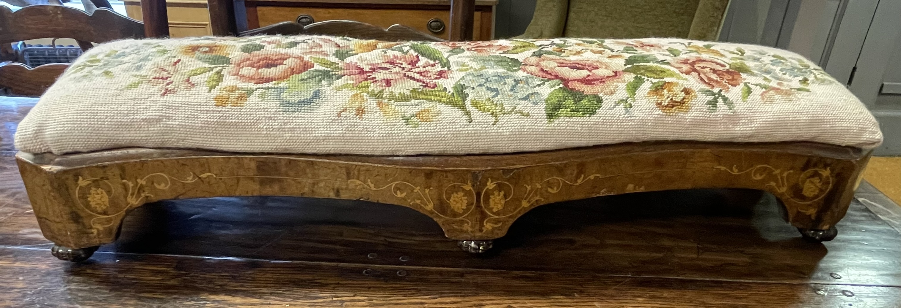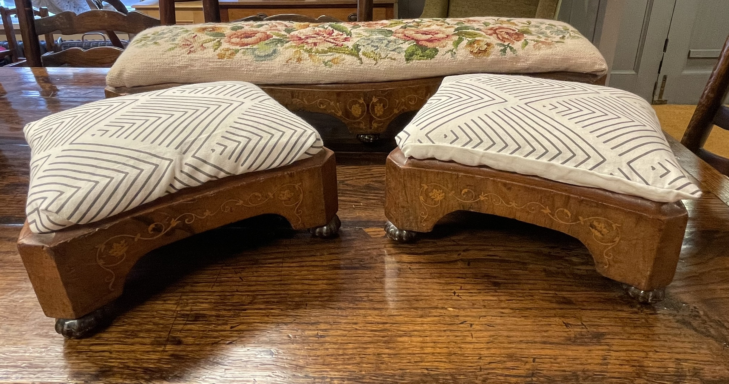 Three Marquetry Stools Believed To Be From Chichester Cathedral. The current owner informs us that his farther bought the stools in the late 1960’s from Chichister Cathedral
