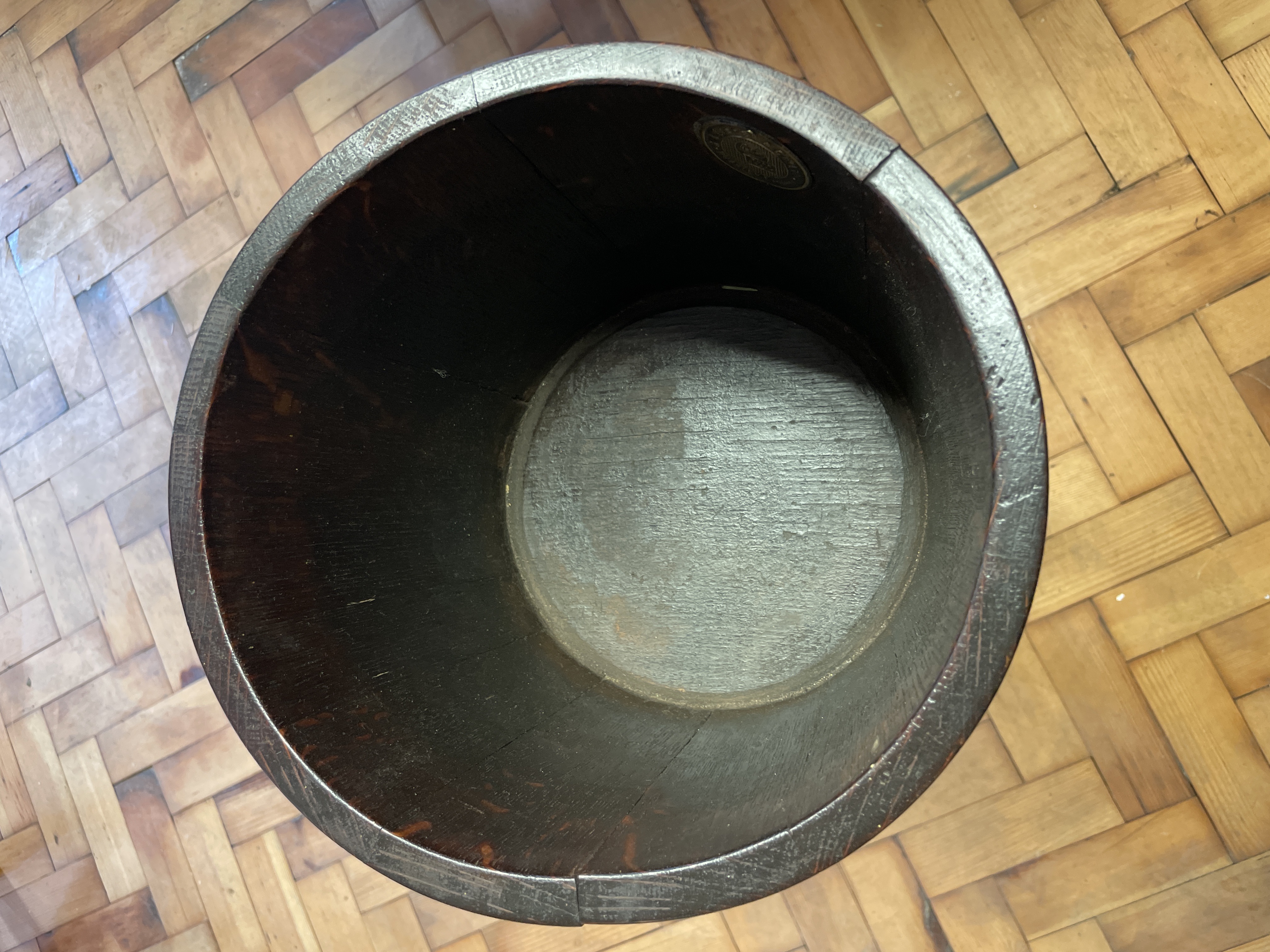 This R.A. Lister & Co. Ltd. Wood Craft jardiniere is an Arts and crafts planter of coopered oak construction. The barrel-shaped vessel is formed from dark-stained oak staves secured by two wide brass bands featuring decorative rivets. The structure is supported by three out-swept legs joined by a central triangular shelf. A circular brass maker’s plaque is affixed to both the exterior and the interior rim, identifying the manufacturer as R.A. Lister & Co. Ltd. Dursley England Wood Craft.