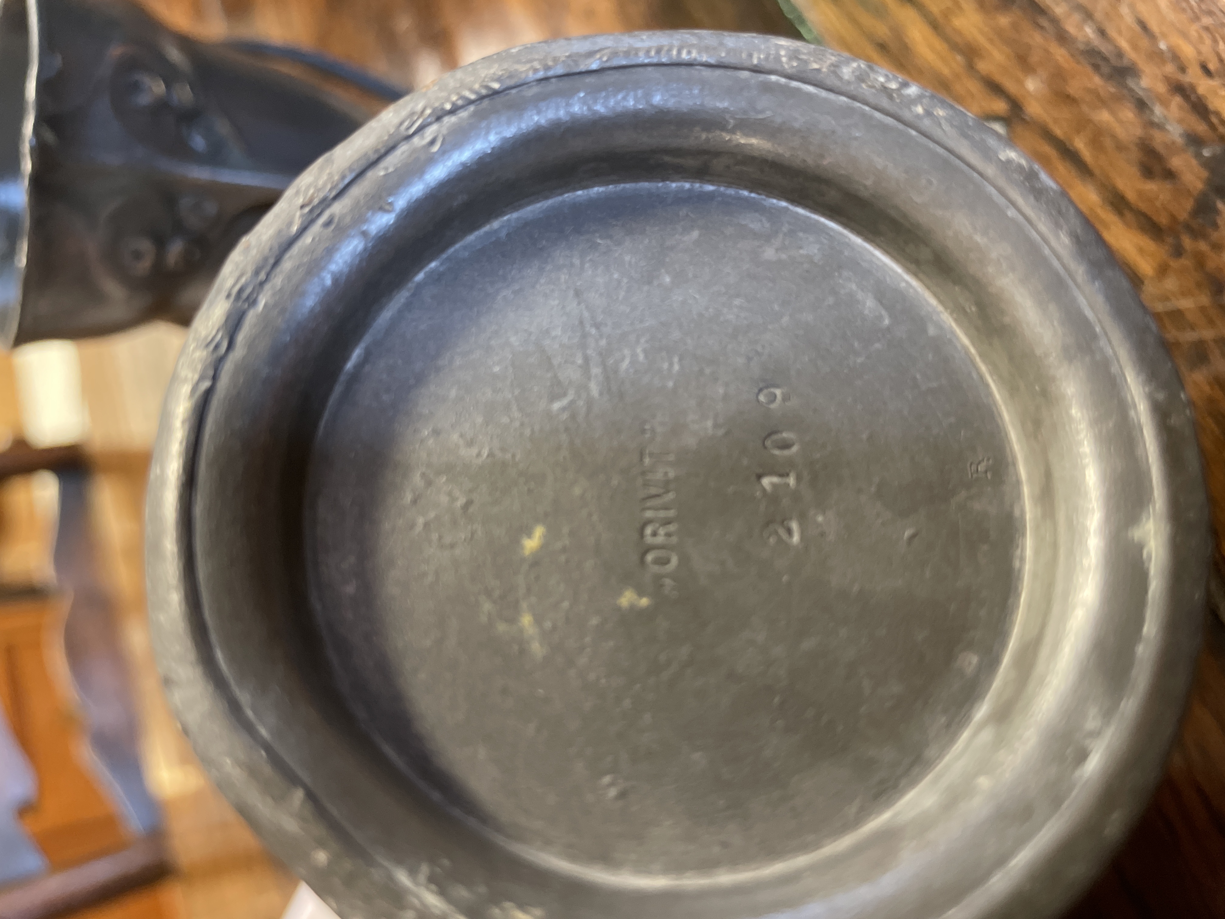 This collection consists of three Art Nouveau period pewter vessels from notable European manufacturers. The first item is a Tudric pewter cup holder designed by Archibold Knox for Liberty and Co., featuring an openwork handle and a copper boss with turquoise enamel. It houses a cylindrical green glass liner. The base is stamped MADE IN ENGLAND TUDRIC 0358 SOLKETS. The second piece is an Orivit pewter beaker, model 2109, showcasing relief-molded stylized floral motifs and characteristic whiplash lines. The underside is marked ORIVIT 2109. The third item is a Kayserzinn three-handled cup, model 4489, displaying an organic form with embossed berry and leaf decorations. The base is stamped with the Kayserzinn oval mark and model number 4489.