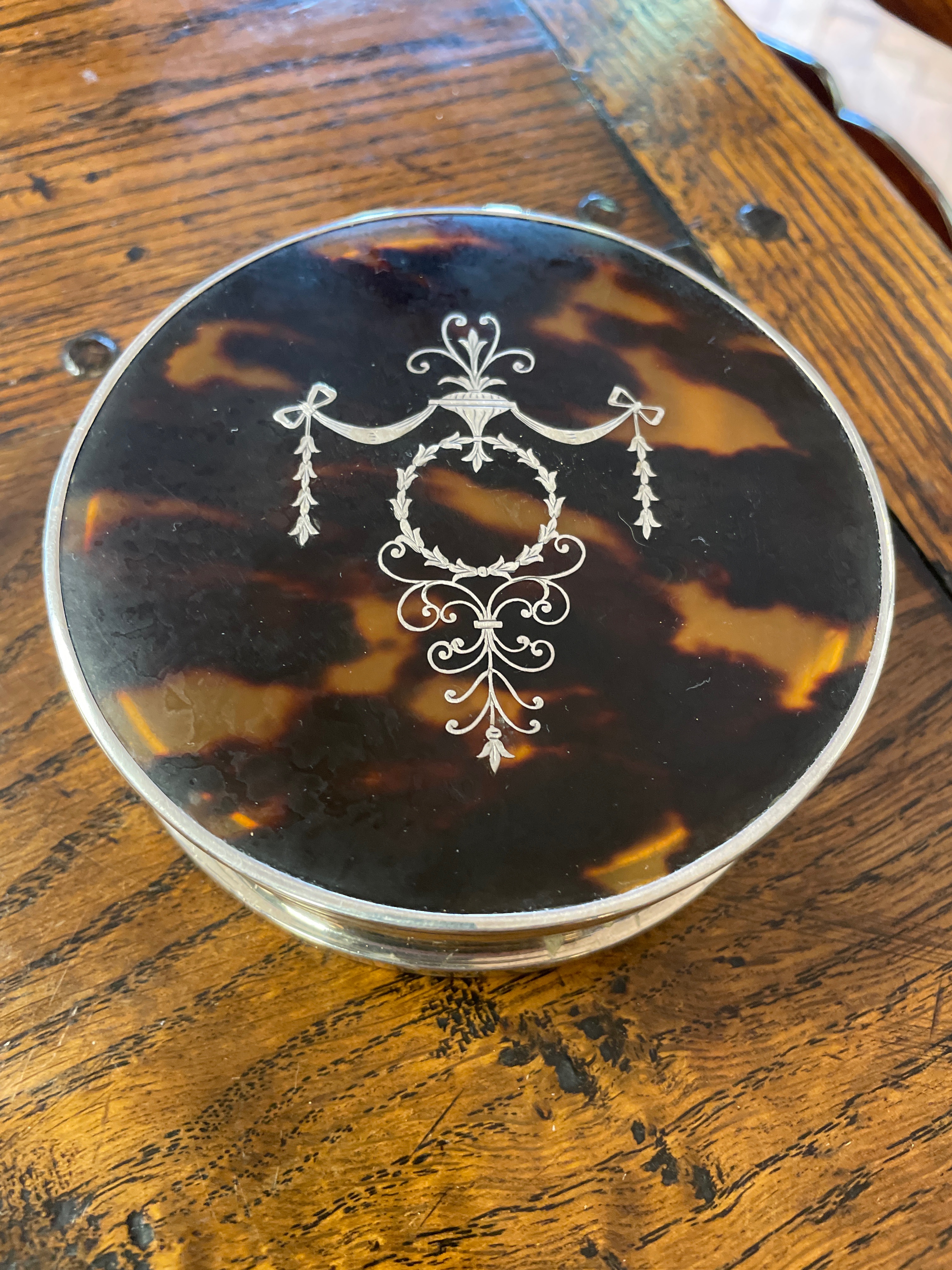 This circular jewelry box is crafted from silver and tortoise shell. The lid features silver pique inlay in a neoclassical design including a central wreath, scrolls, and swags. The silver rim and body are struck with London assay office hallmarks, the lion passant for sterling silver, and the date letter u for 1919. The interior is finished with a light-colored lining.