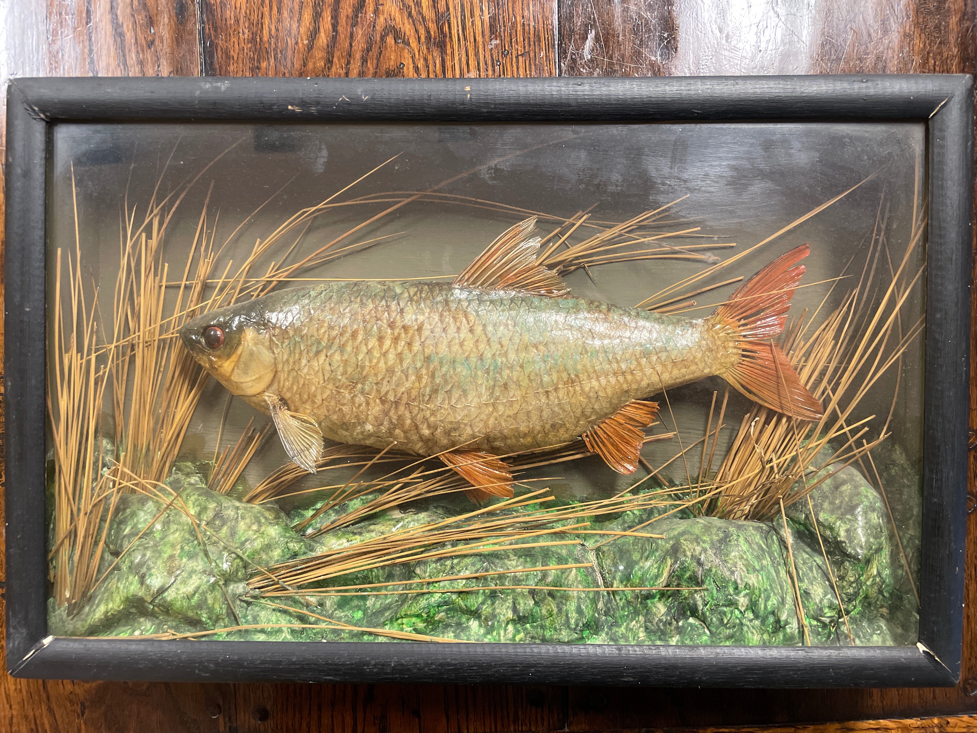 A taxidermy specimen fish presented within a rectangular black-painted wooden shadowbox display case. The specimen is set against a diorama background featuring a neutral-toned backdrop, green-tinted textured faux rockwork, and dried reeds. The fish displays silver and gold-toned scales with reddish-orange fins and a glass eye. The case is enclosed by a glass front. The reverse is finished with green felt and a single brass wall-mounting bracket.