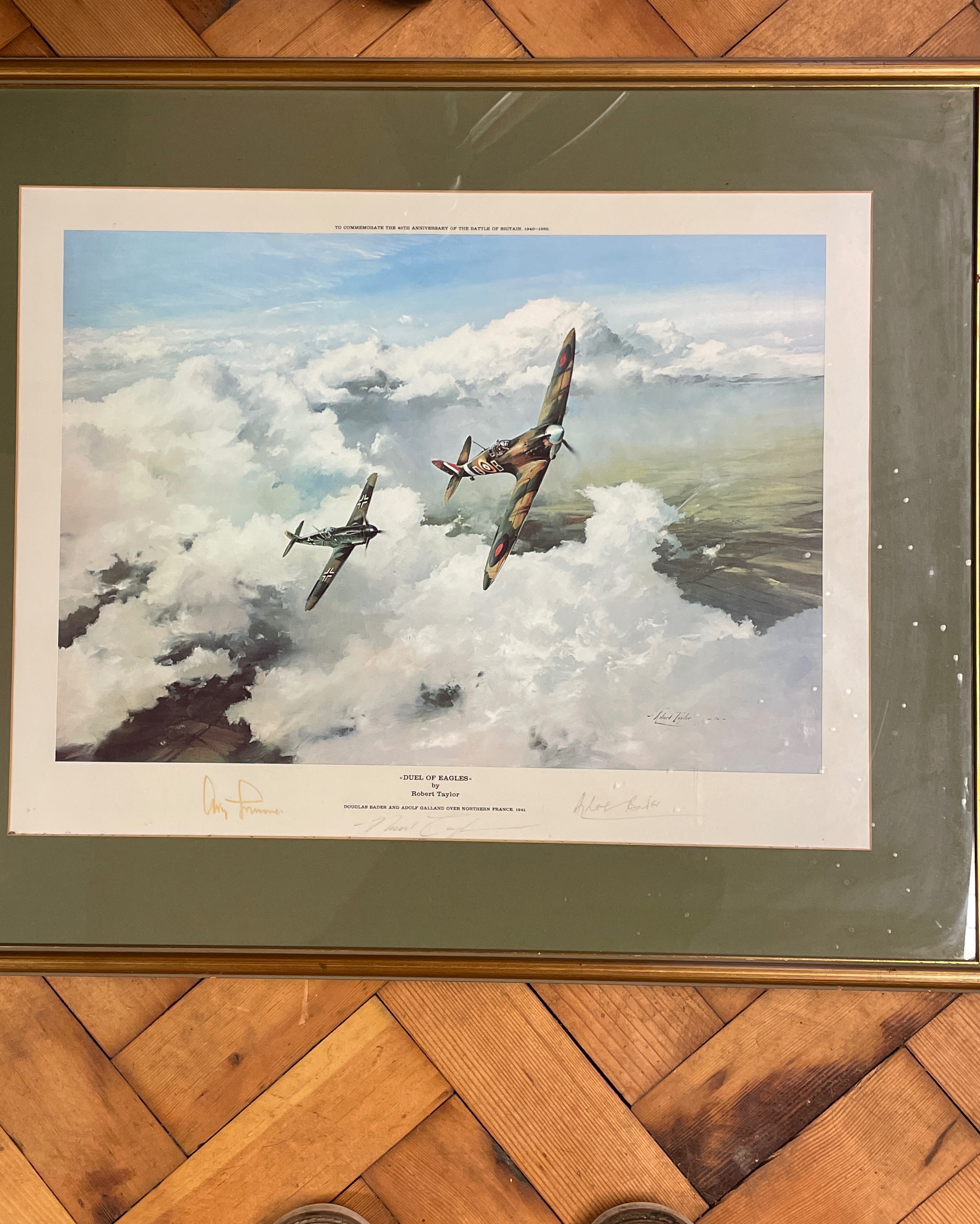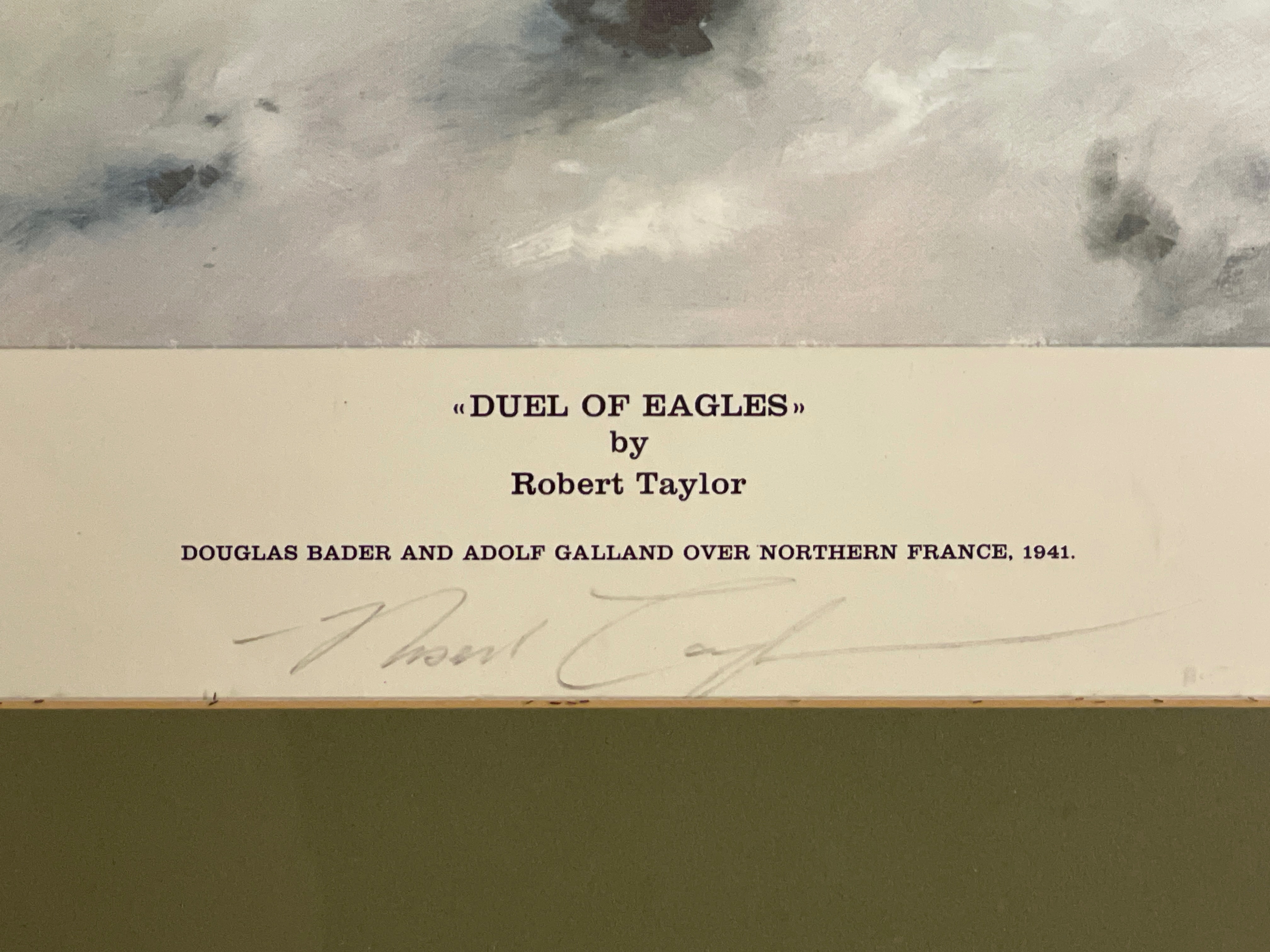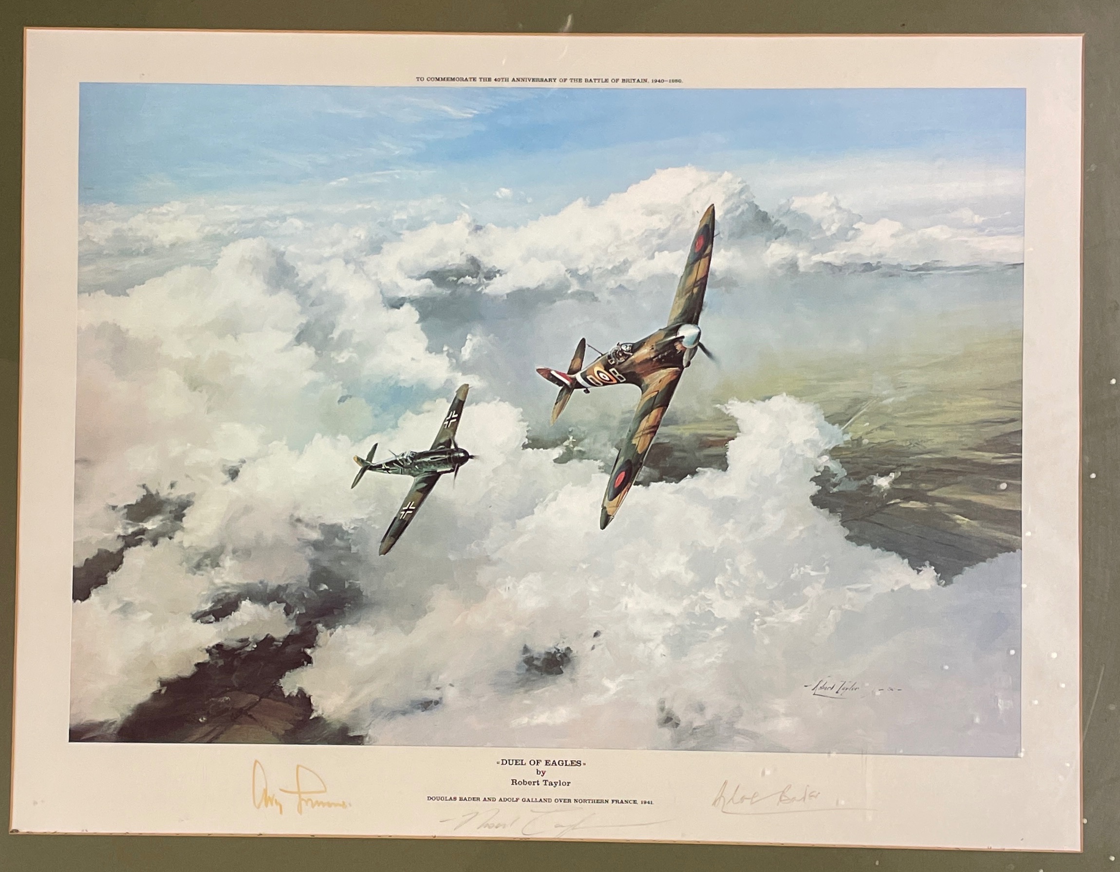 This color aviation print, titled Duel of Eagles by artist Robert Taylor, was released to commemorate the 40th anniversary of the Battle of Britain (1940-1980). The artwork depicts an aerial engagement between a British Supermarine Spitfire and a German Messerschmitt Bf 109 over Northern France in 1941, representing the aircraft of pilots Douglas Bader and Adolf Galland. The print is hand-signed in pencil by the artist in the lower margin. It is further distinguished by the original pencil signatures of Group Captain Sir Douglas Bader and Generalleutnant Adolf Galland. The piece is housed in a gilt-finished frame with a dark green mat under glass.