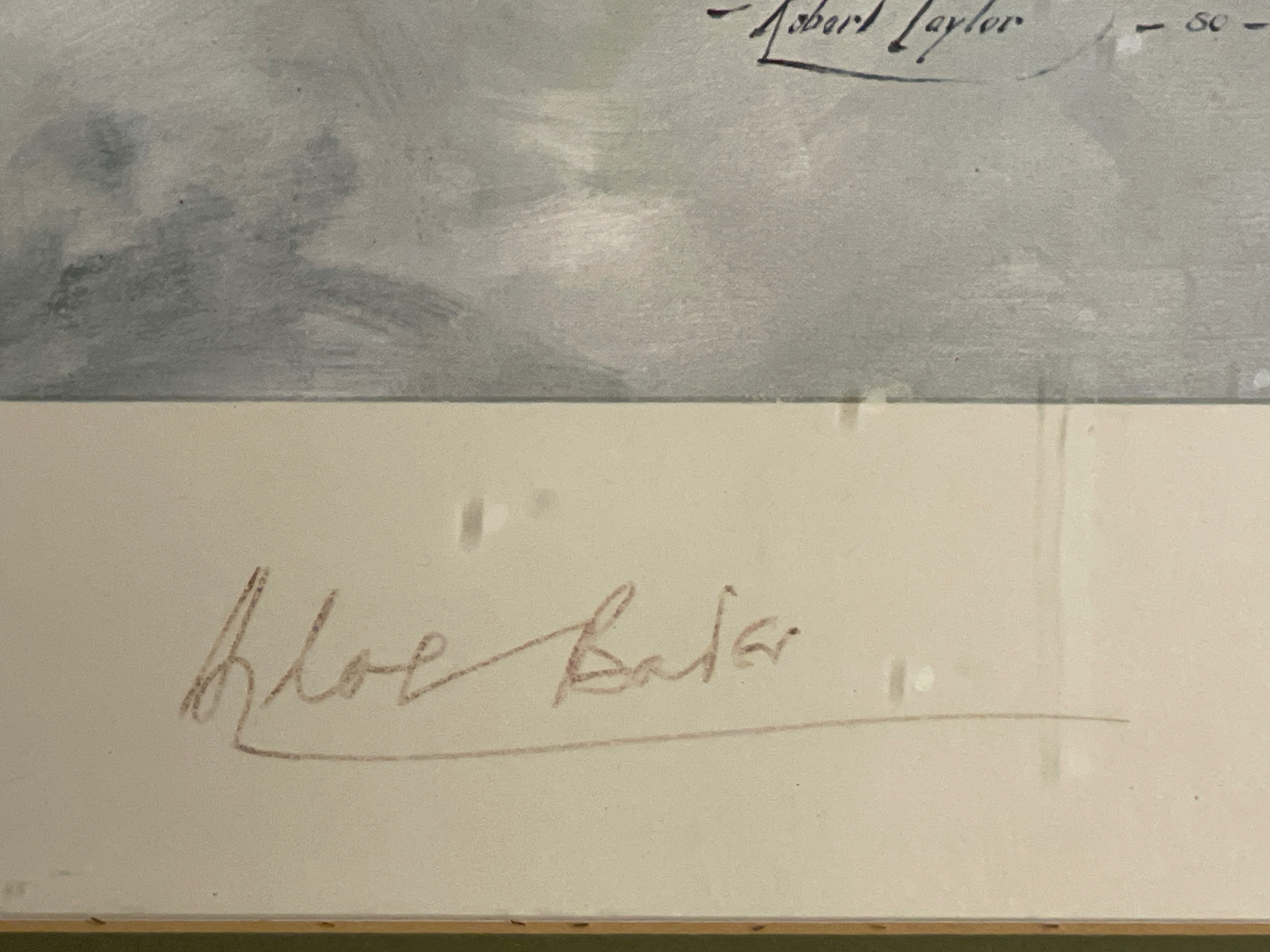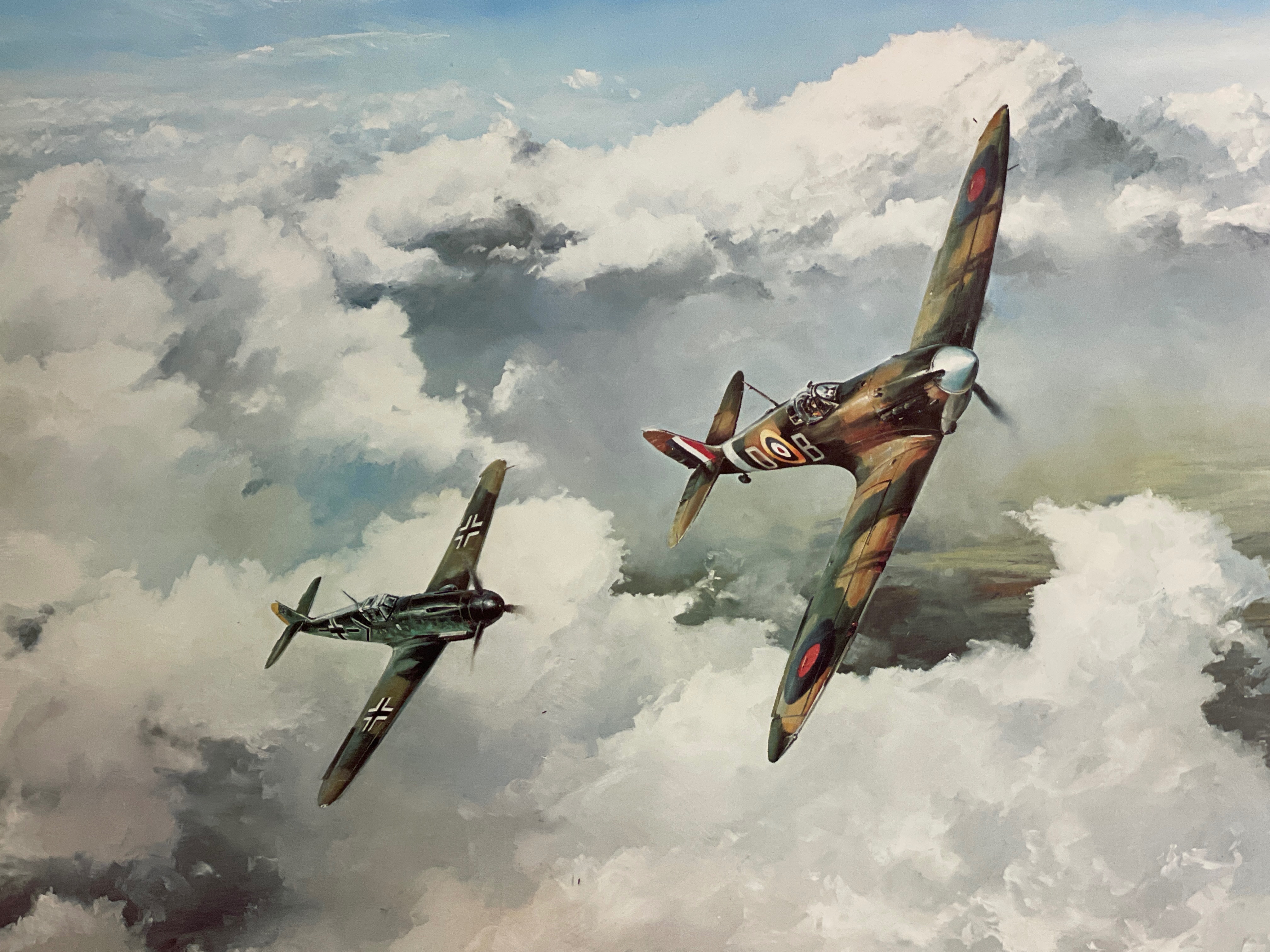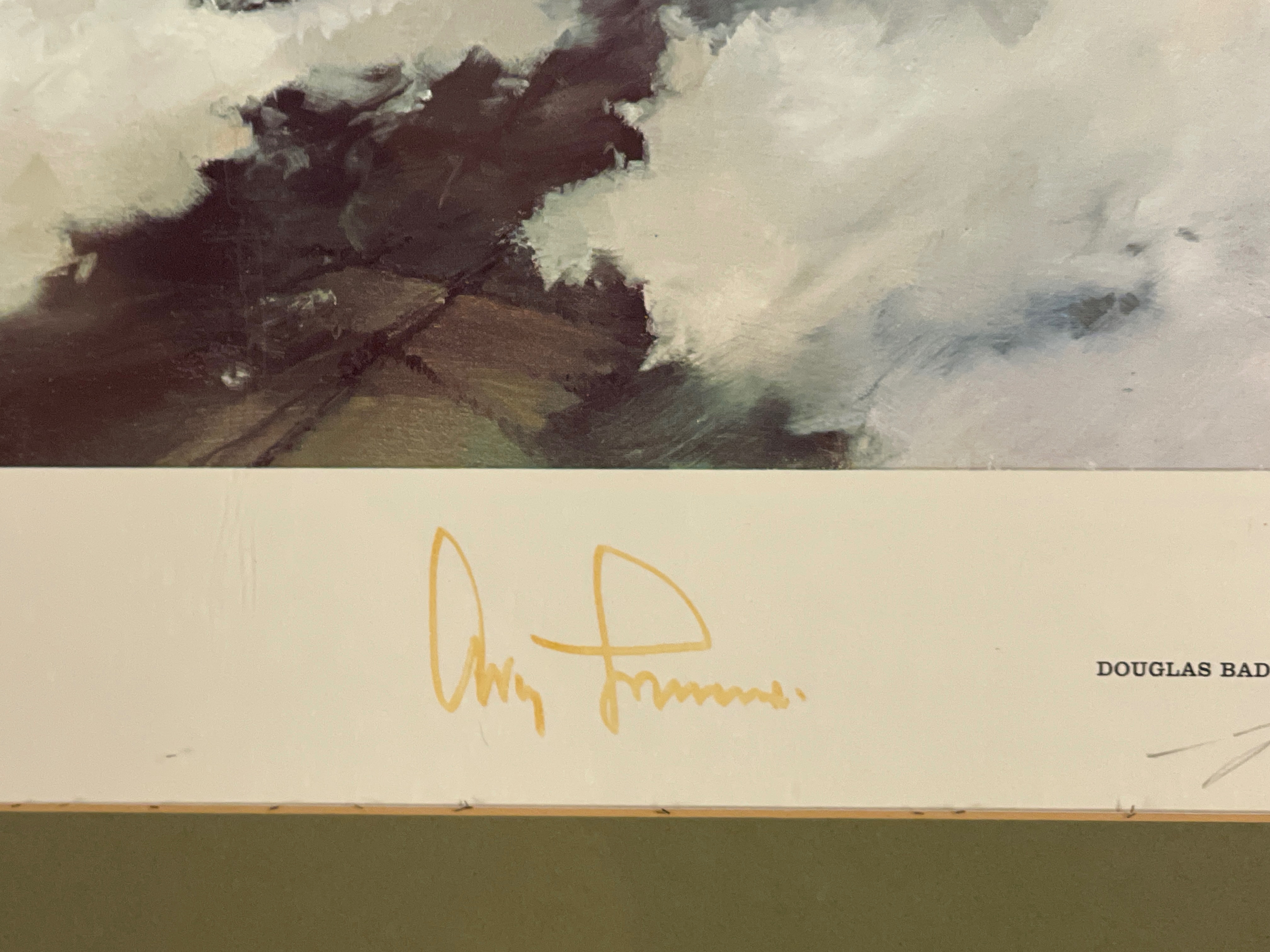 This color aviation print, titled Duel of Eagles by artist Robert Taylor, was released to commemorate the 40th anniversary of the Battle of Britain (1940-1980). The artwork depicts an aerial engagement between a British Supermarine Spitfire and a German Messerschmitt Bf 109 over Northern France in 1941, representing the aircraft of pilots Douglas Bader and Adolf Galland. The print is hand-signed in pencil by the artist in the lower margin. It is further distinguished by the original pencil signatures of Group Captain Sir Douglas Bader and Generalleutnant Adolf Galland. The piece is housed in a gilt-finished frame with a dark green mat under glass.