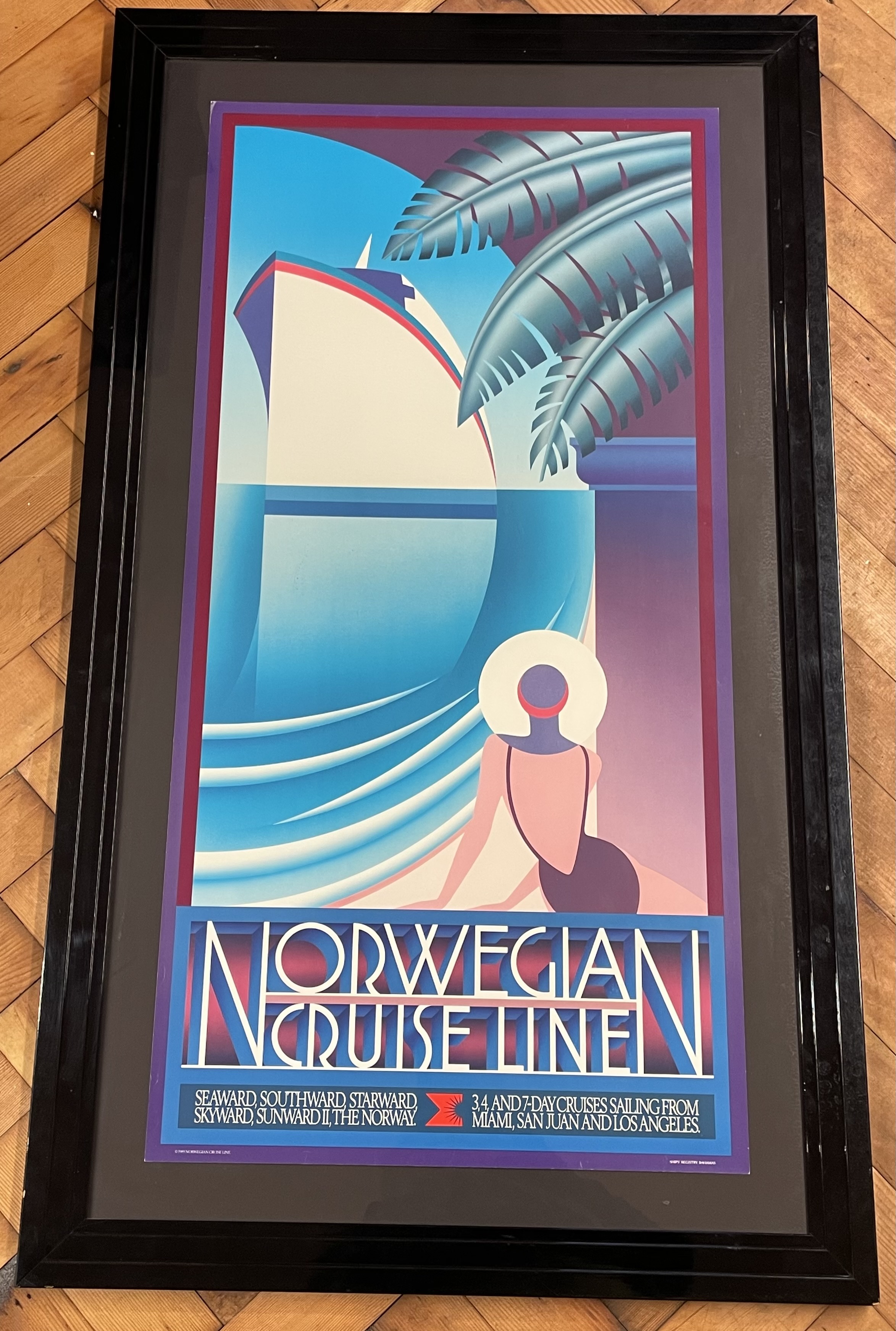 This advertising poster for Norwegian Cruise Line was designed by artist Dennis Ziemienski and is dated 1989. The graphic illustration is executed in a late 20th-century Art Deco revival style, featuring saturated colors and stylized forms. The composition depicts the bow of a cruise ship alongside palm fronds and a woman in a sun hat looking toward the ocean. The lower portion of the poster displays the company name in a stylized typeface above a list of fleet vessels including the Seaward, Southward, Starward, Skyward, Sunward II, and The Norway. Additional text specifies 3, 4, and 7-day cruises departing from Miami, San Juan, and Los Angeles. The poster is presented with a dark mat and housed in a contemporary black frame.