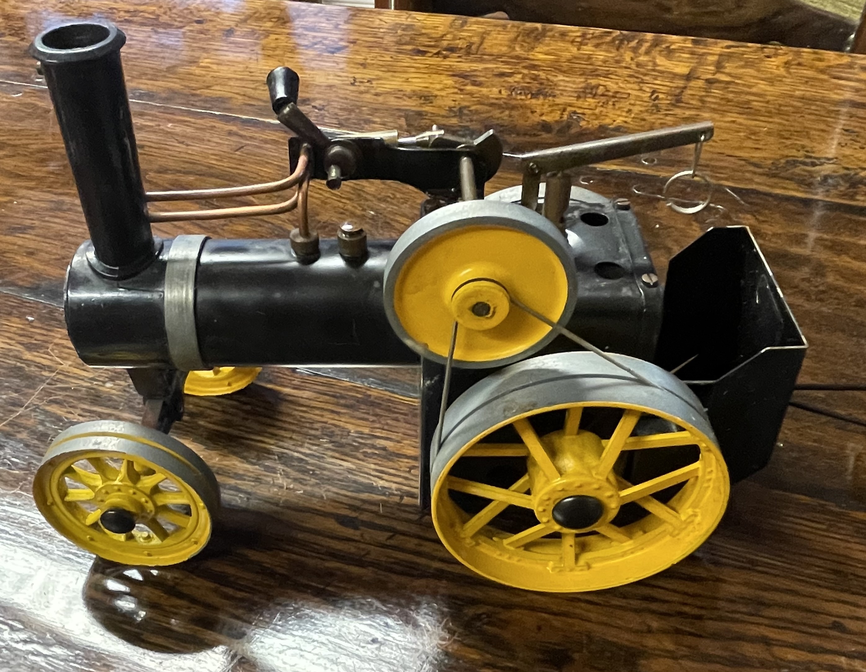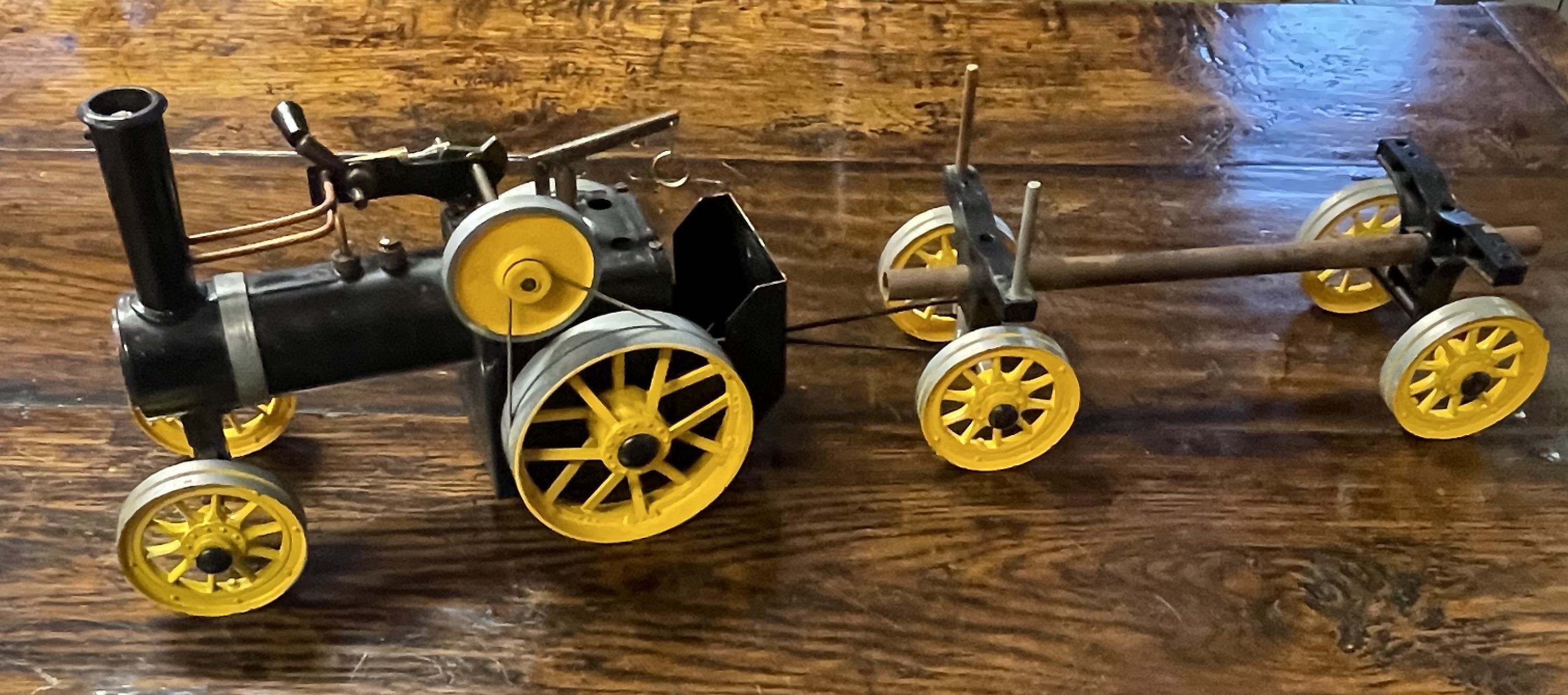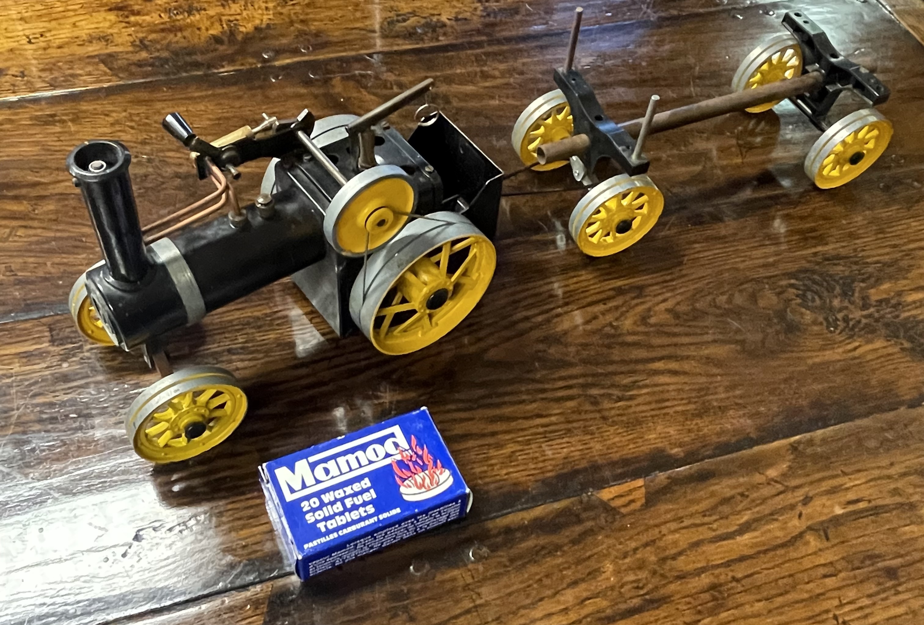 A Mamod live steam traction engine and associated log wagon. The model tractor features a black-finished boiler with copper piping, a vertical smokestack, and gray and yellow-painted metal components, including spoked wheels. It is paired with a matching log trailer consisting of yellow-wheeled bogies connected by a central metal beam. The collection is accompanied by a box of Mamod 20 Waxed Solid Fuel Tablets, which includes the French translation Pastilles Carburant Solide. The items are constructed of painted metal and copper components.