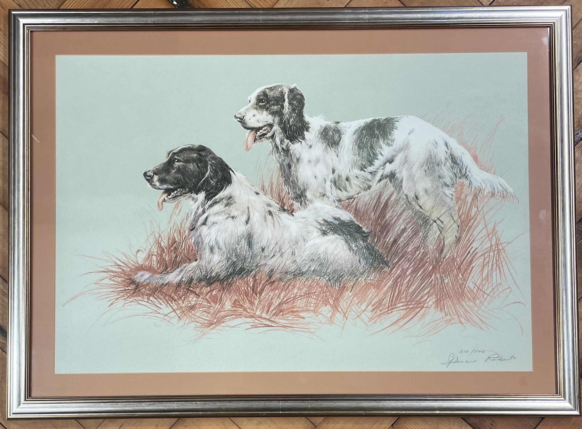 A limited edition print by artist Spencer Roberts depicting a pair of English Setters set within a field of tall reddish grass. The composition features line work on a light-green ground with a muted color palette. The work is hand-signed by the artist in pencil in the lower right corner and is numbered 212/500. The piece is presented under glass with a tan-colored mat and is housed in a silver-toned frame.