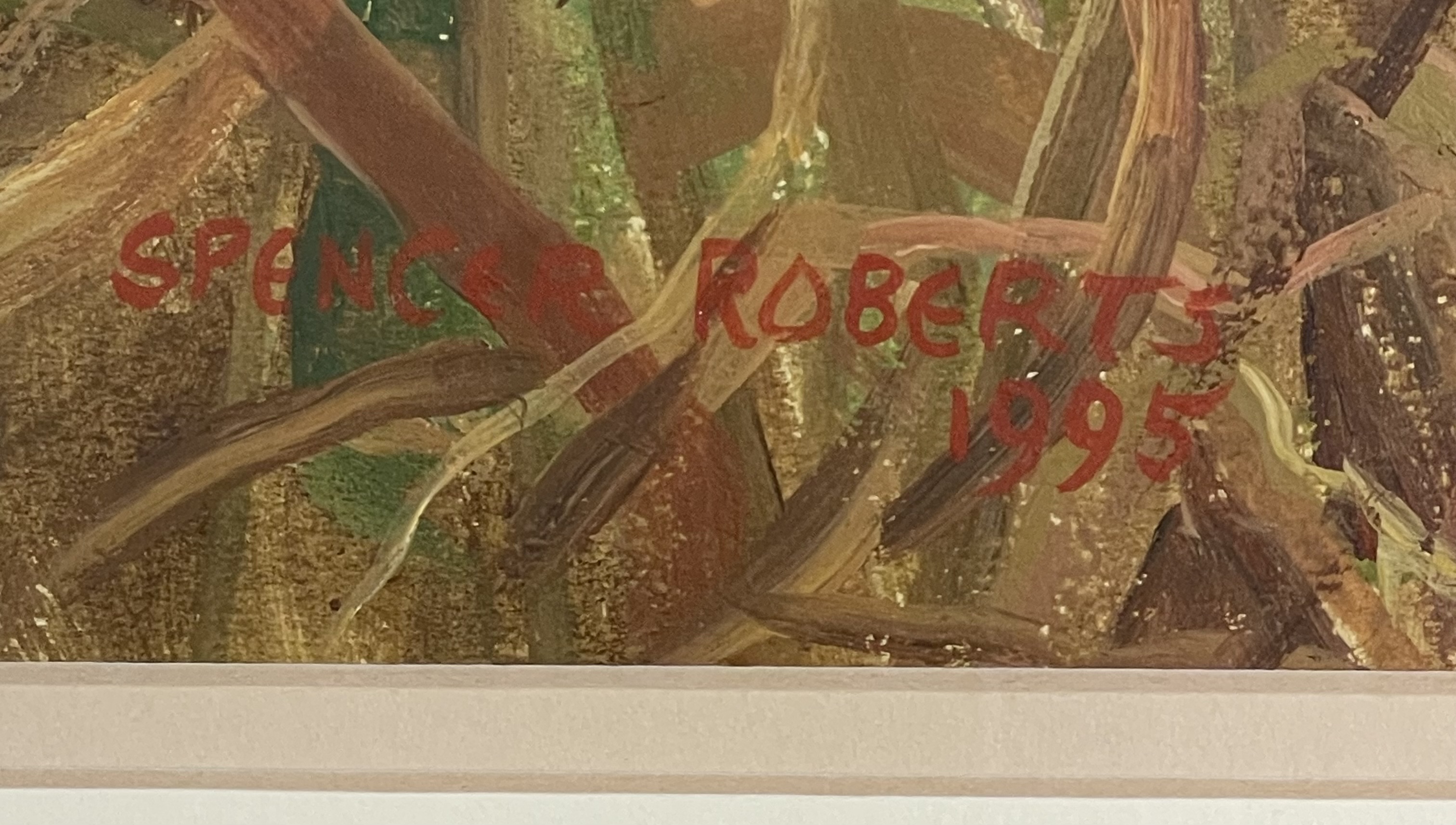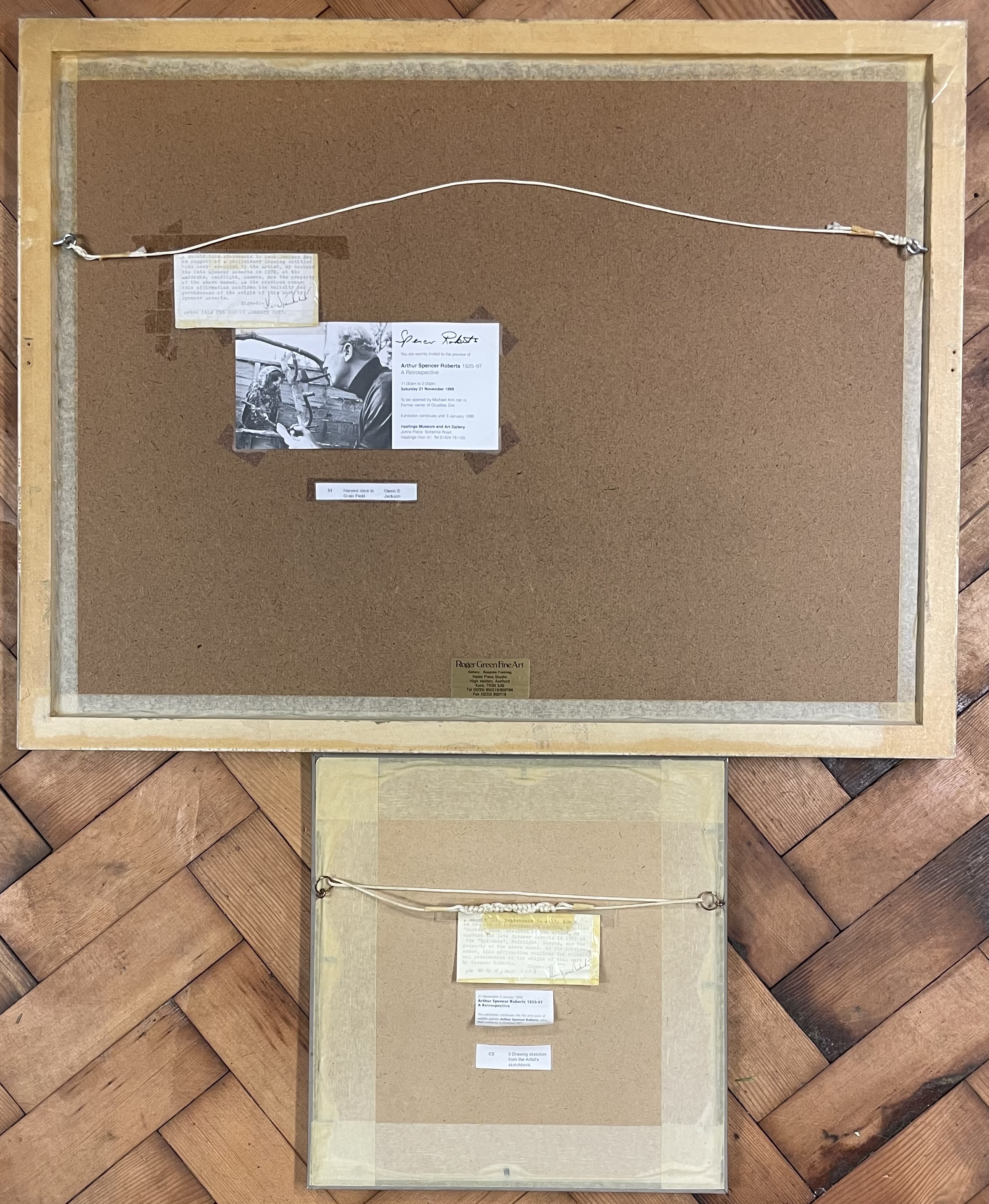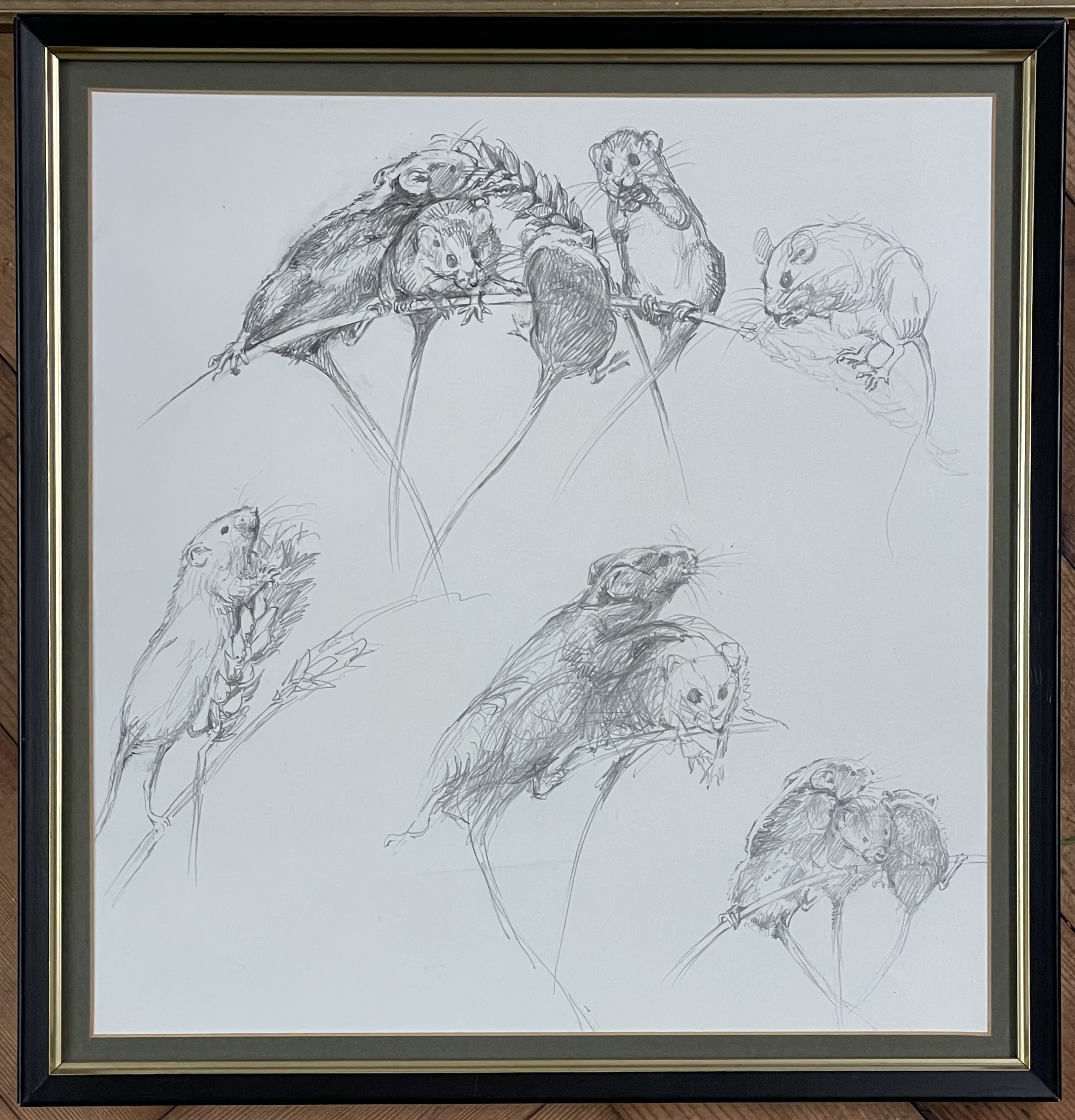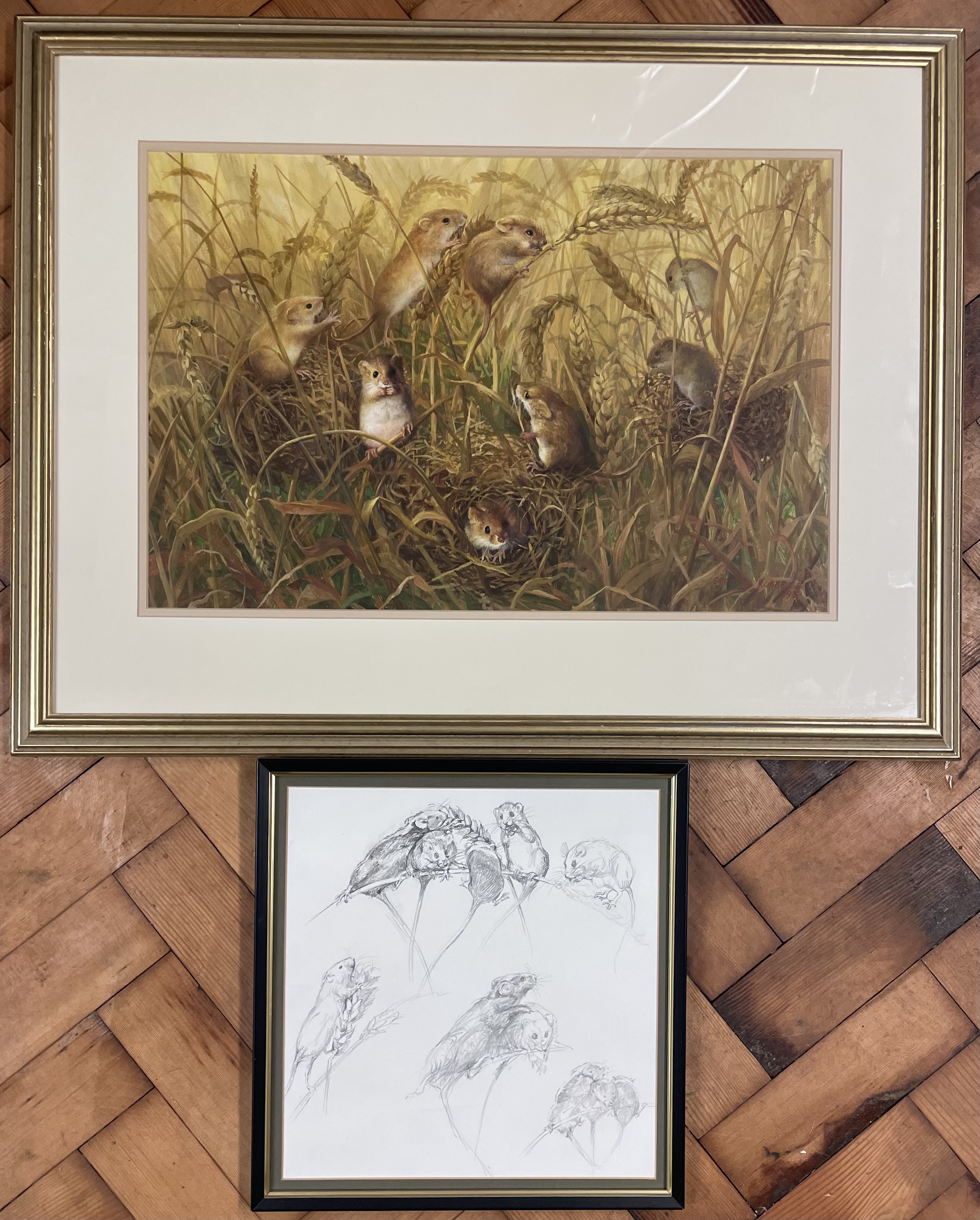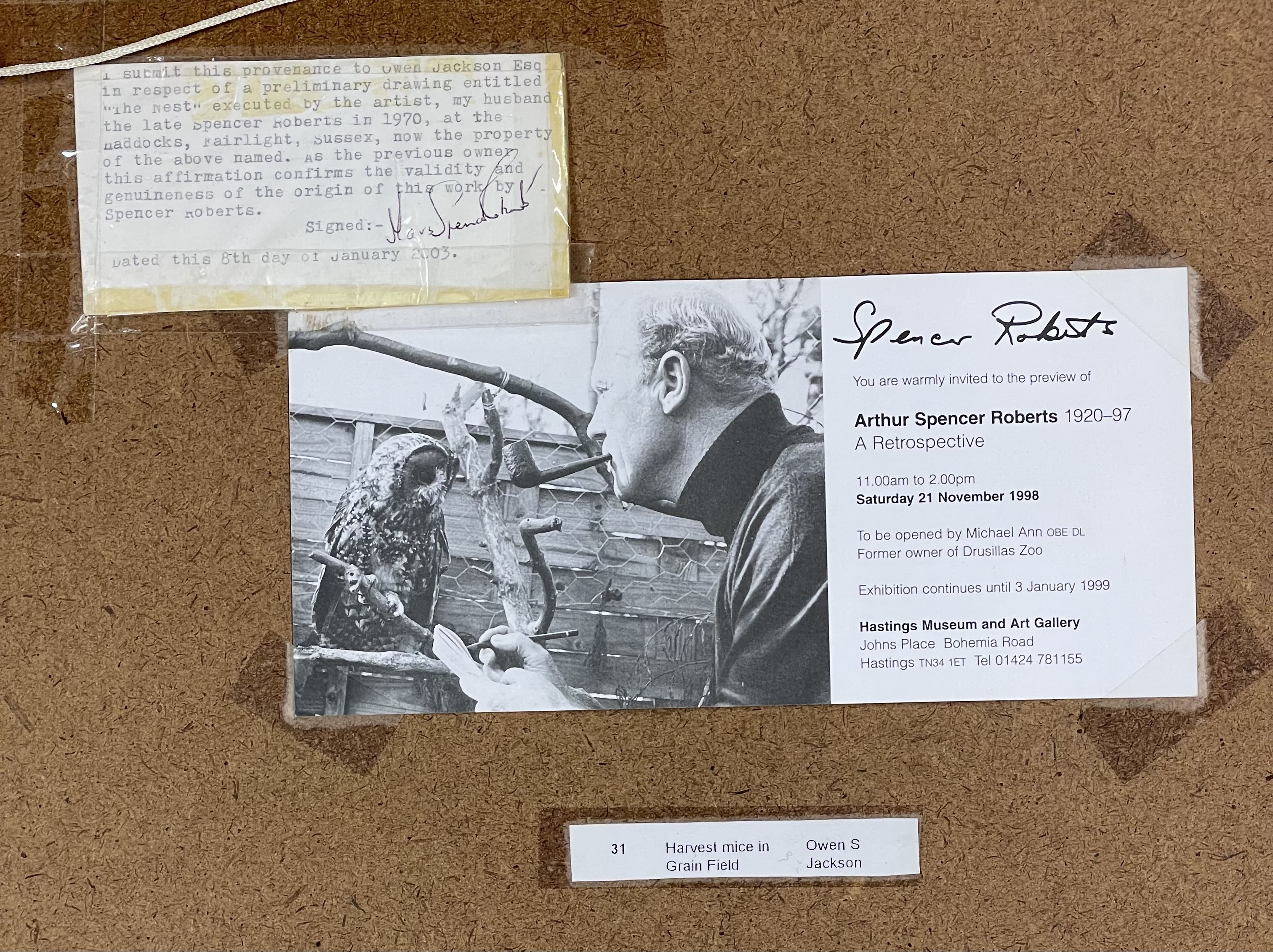 Arthur Spencer Roberts (British, 1920-1997). This lot features two framed original works. The primary piece is a painting on board depicting a group of harvest mice among stalks of wheat, executed in a golden palette. The work is signed and dated SPENCER ROBERTS 1995 in the lower right corner. The second piece is a graphite study on paper containing multiple sketches of mice, identified by a reverse label as being from the artist sketchbook. The reverse of the painting includes a label for the title Harvest mice in Grain Field and an invitation to the 1998 retrospective exhibition Arthur Spencer Roberts 1920-97 at the Hastings Museum and Art Gallery. Both items bear handwritten provenance notes signed by the artist widow, dated January 8, 2003, which reference dates of 1970 and 1972 for the execution of related works. The painting is housed in a gilt-finished frame with a light-toned mat, and the study is presented in a black and gold frame with a dark mat.