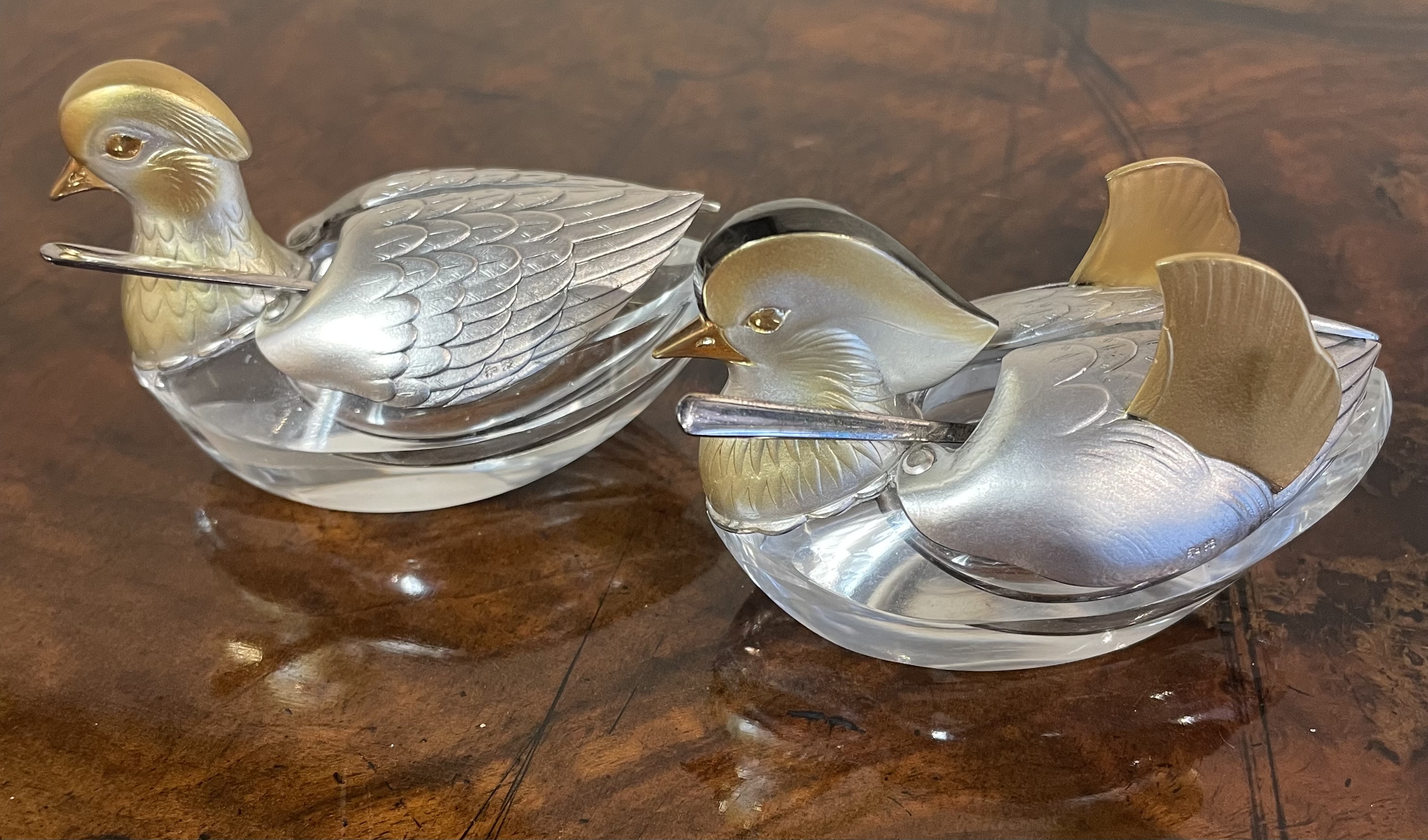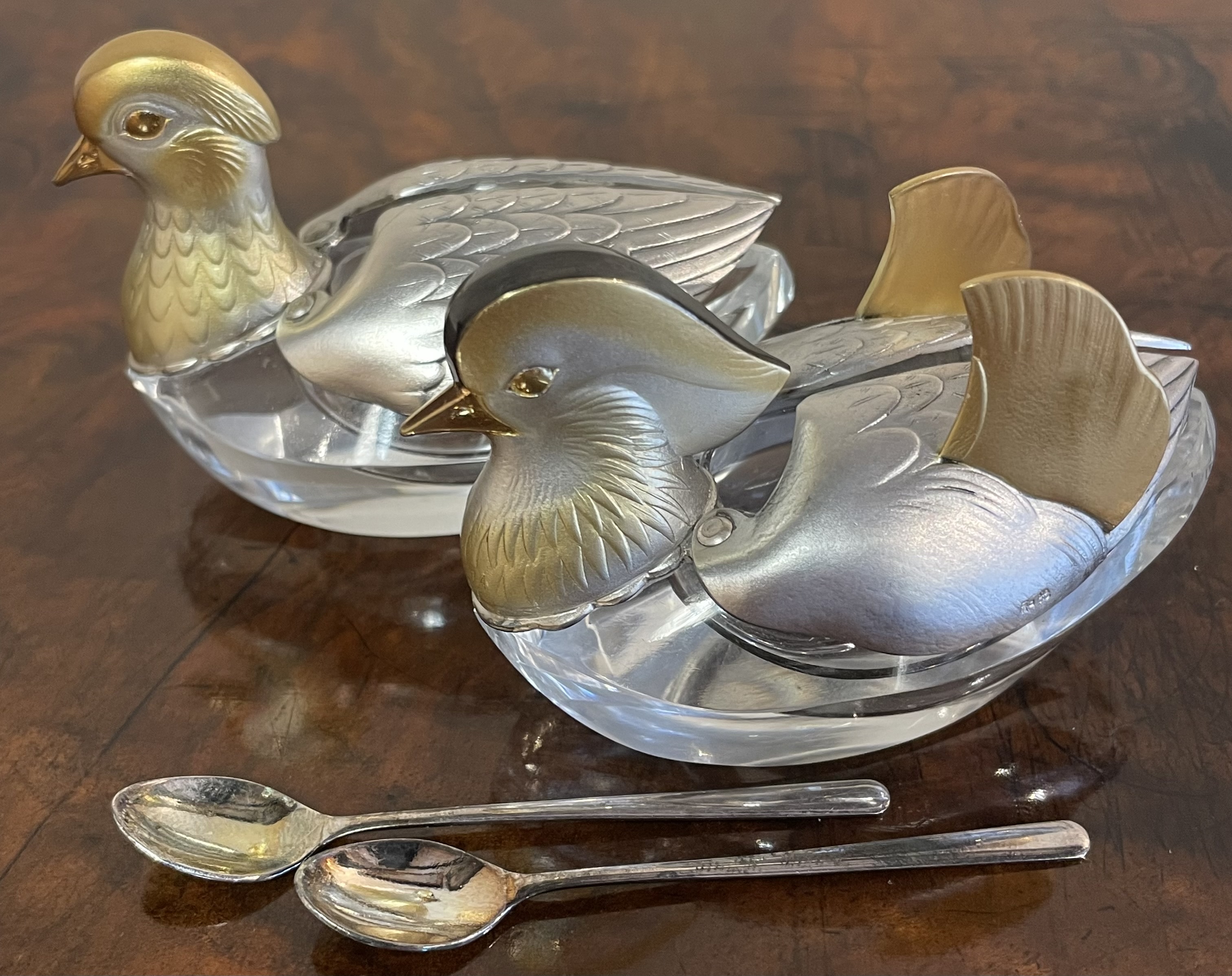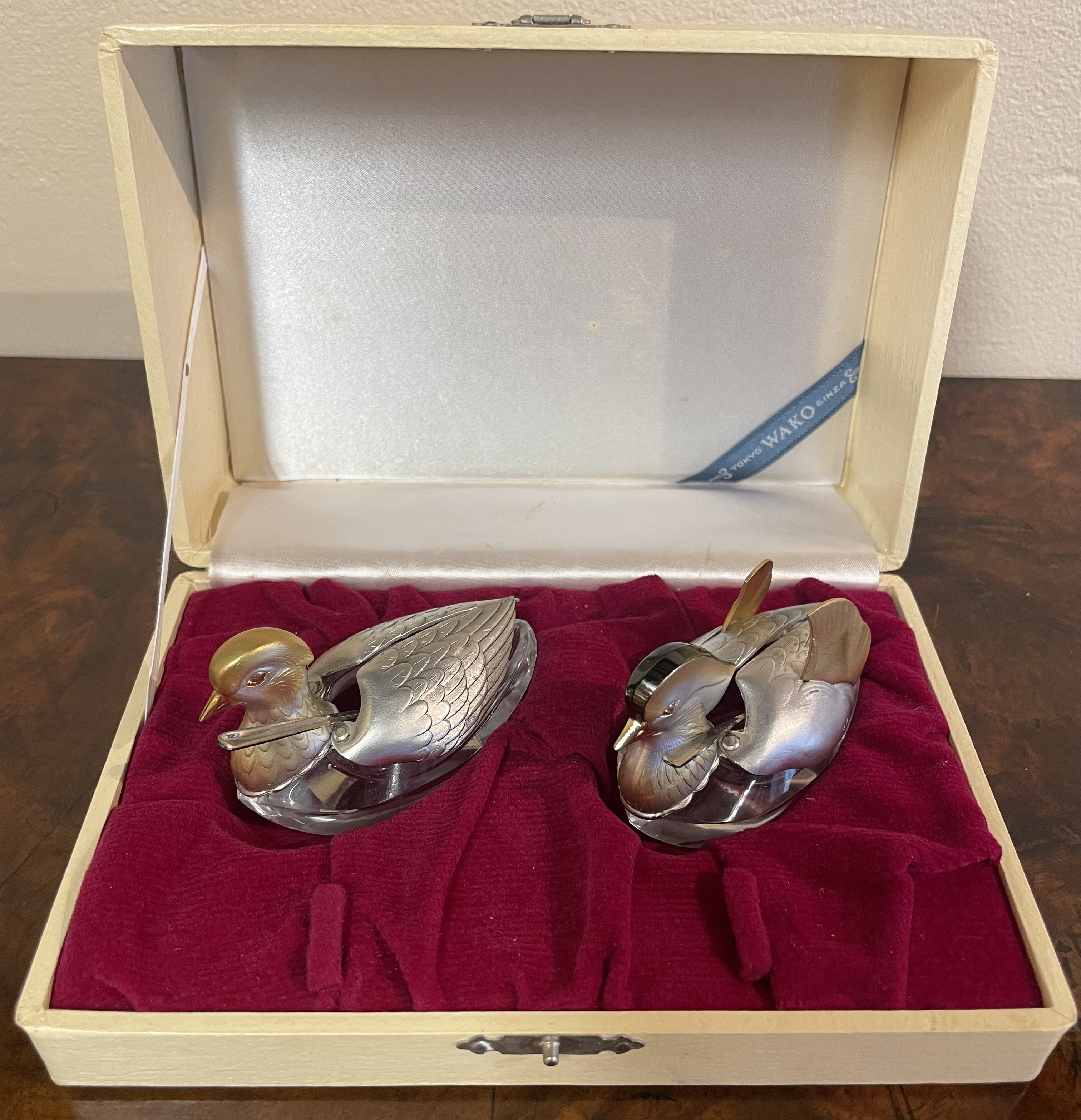 A pair of Japanese salt cellars or condiment containers by Wako, modeled as mandarin ducks. Each piece is constructed with a clear glass boat-shaped base and a hinged metal lid forming the upper body, head, and wings of the bird. The metal lids feature a combination of silver and gold-toned finishes with chased feather textures. The set includes two coordinated metal condiment spoons. A stamped Wako mark is present on the metalwork. The items are presented in the original fabric-lined box with a labeled Wako Ginza ribbon.