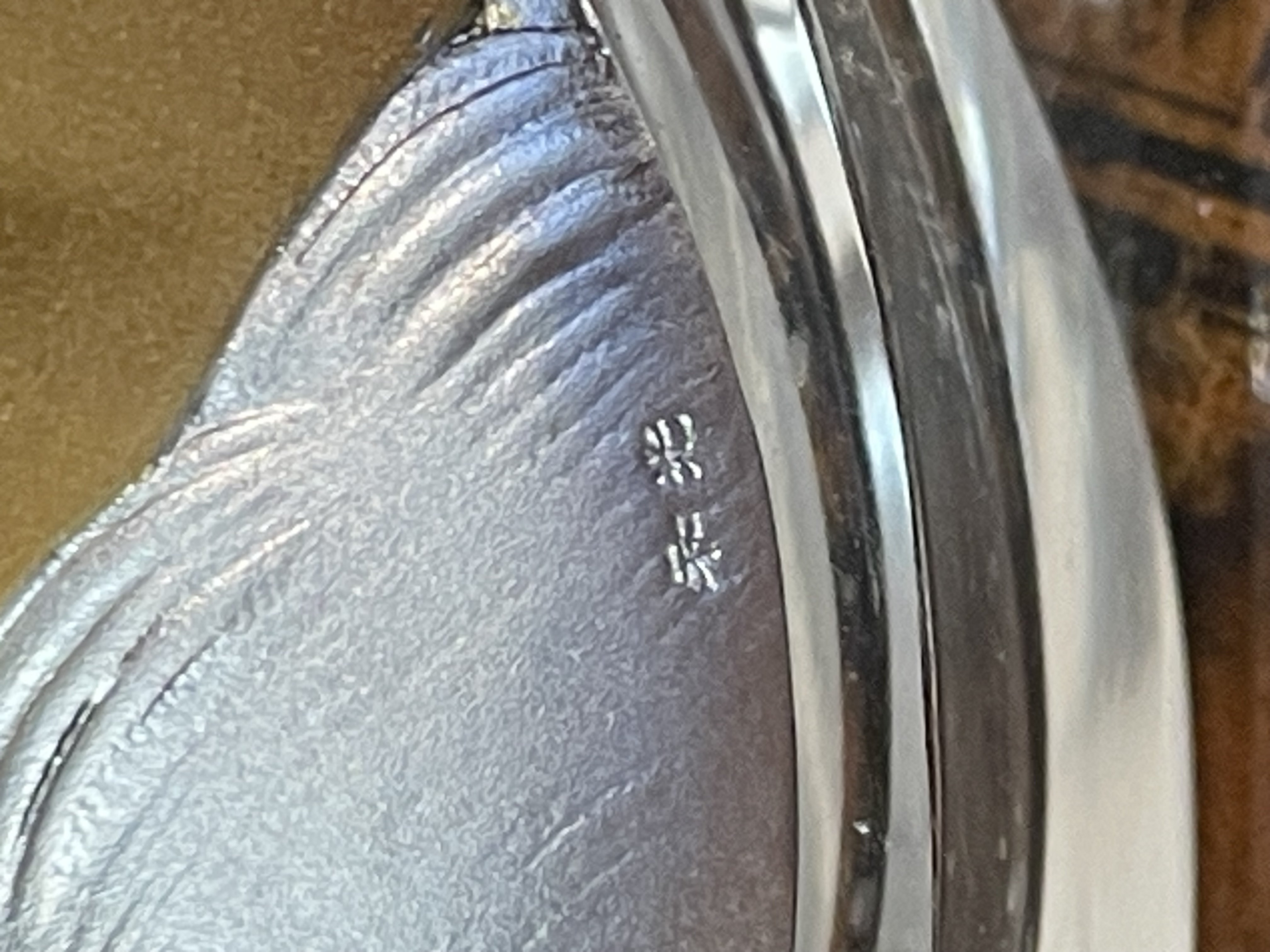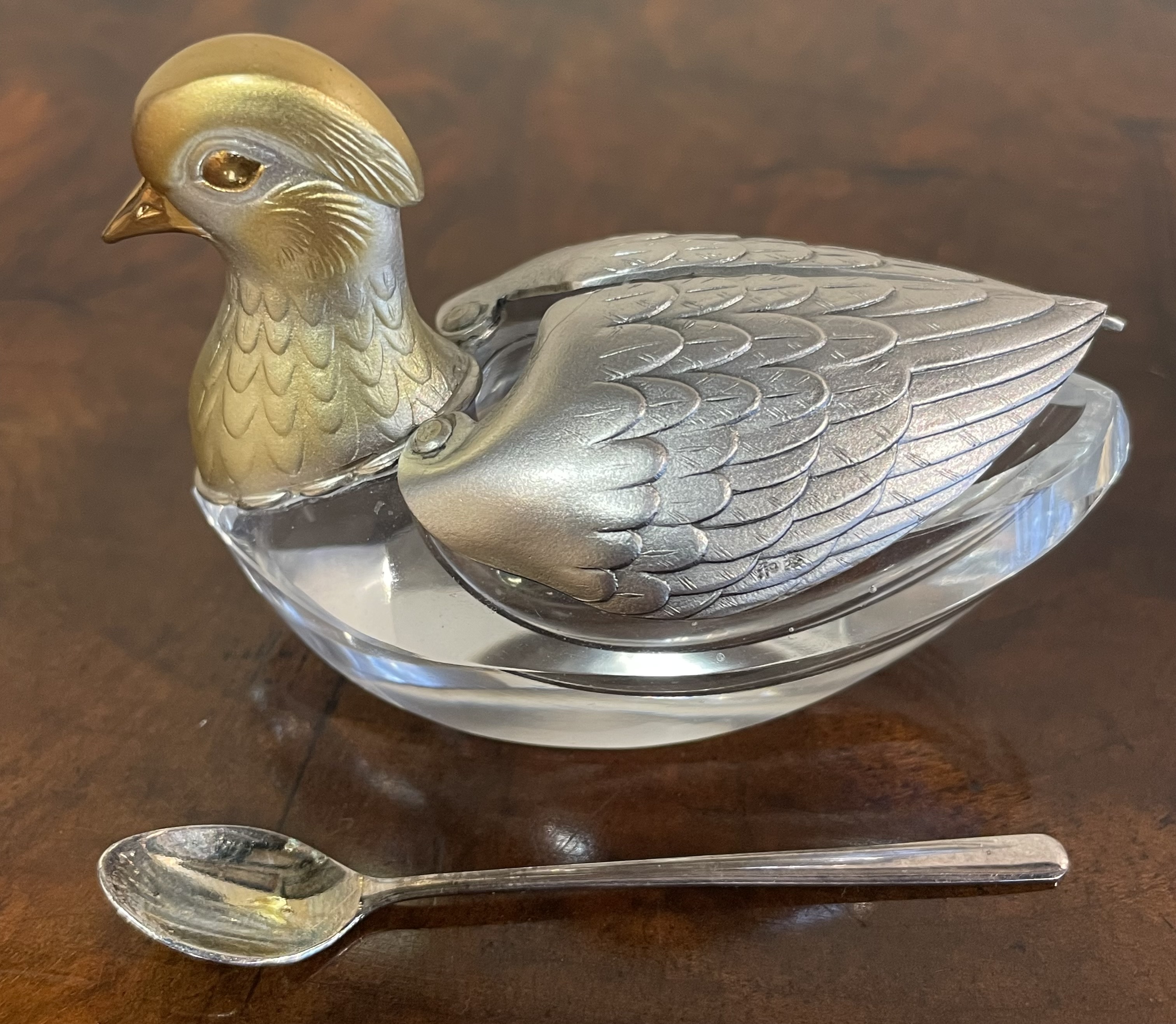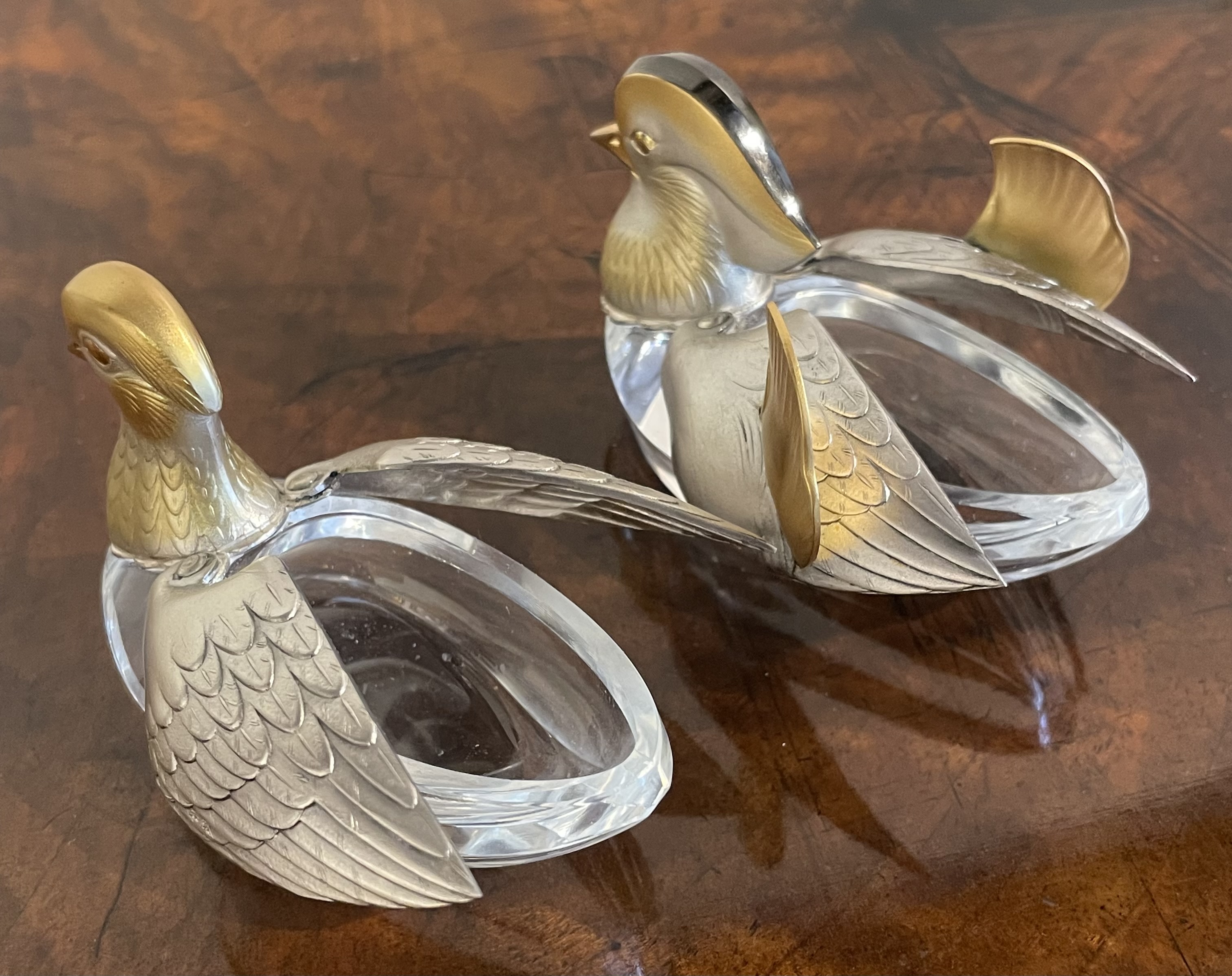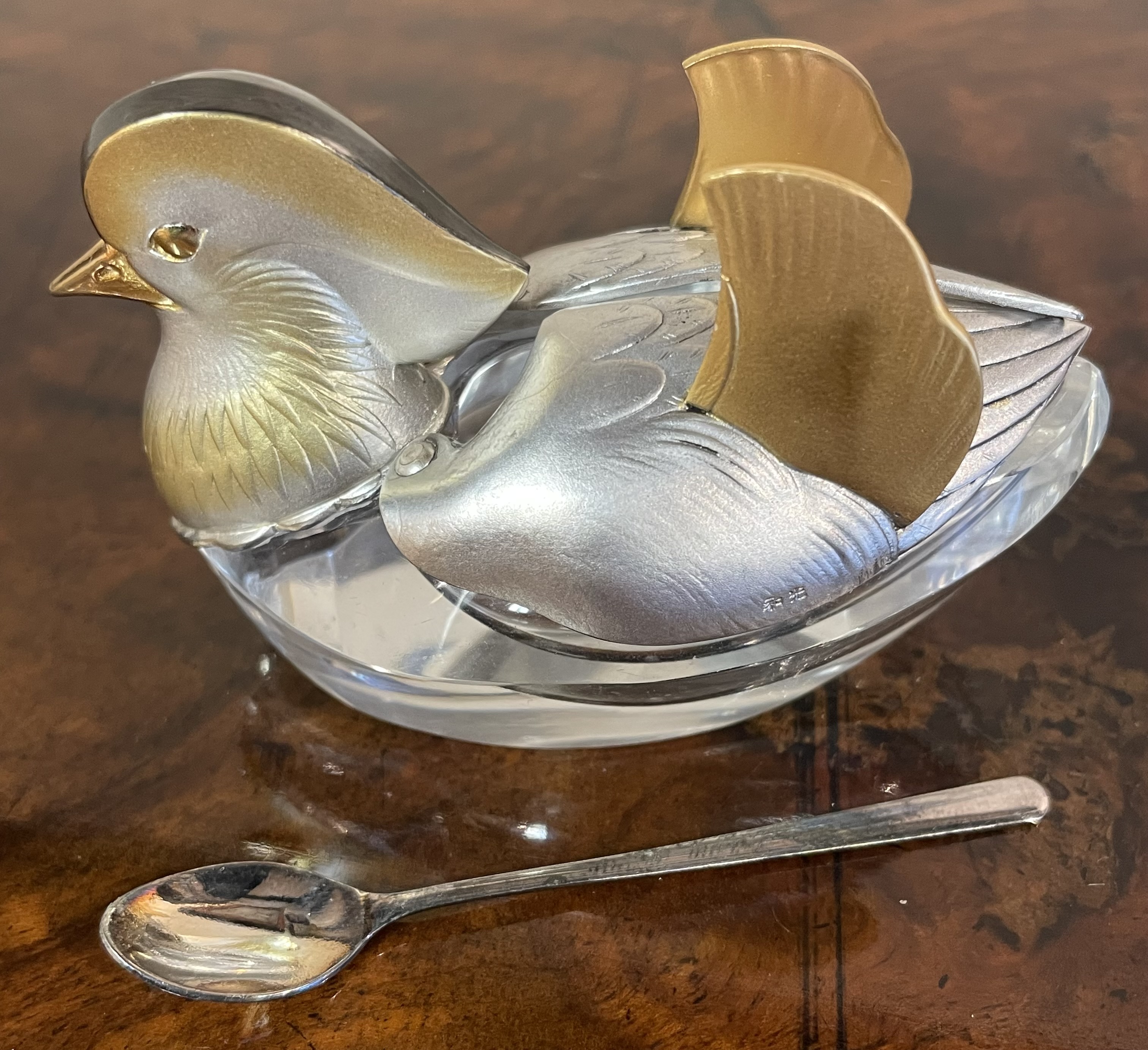 A pair of Japanese salt cellars or condiment containers by Wako, modeled as mandarin ducks. Each piece is constructed with a clear glass boat-shaped base and a hinged metal lid forming the upper body, head, and wings of the bird. The metal lids feature a combination of silver and gold-toned finishes with chased feather textures. The set includes two coordinated metal condiment spoons. A stamped Wako mark is present on the metalwork. The items are presented in the original fabric-lined box with a labeled Wako Ginza ribbon.