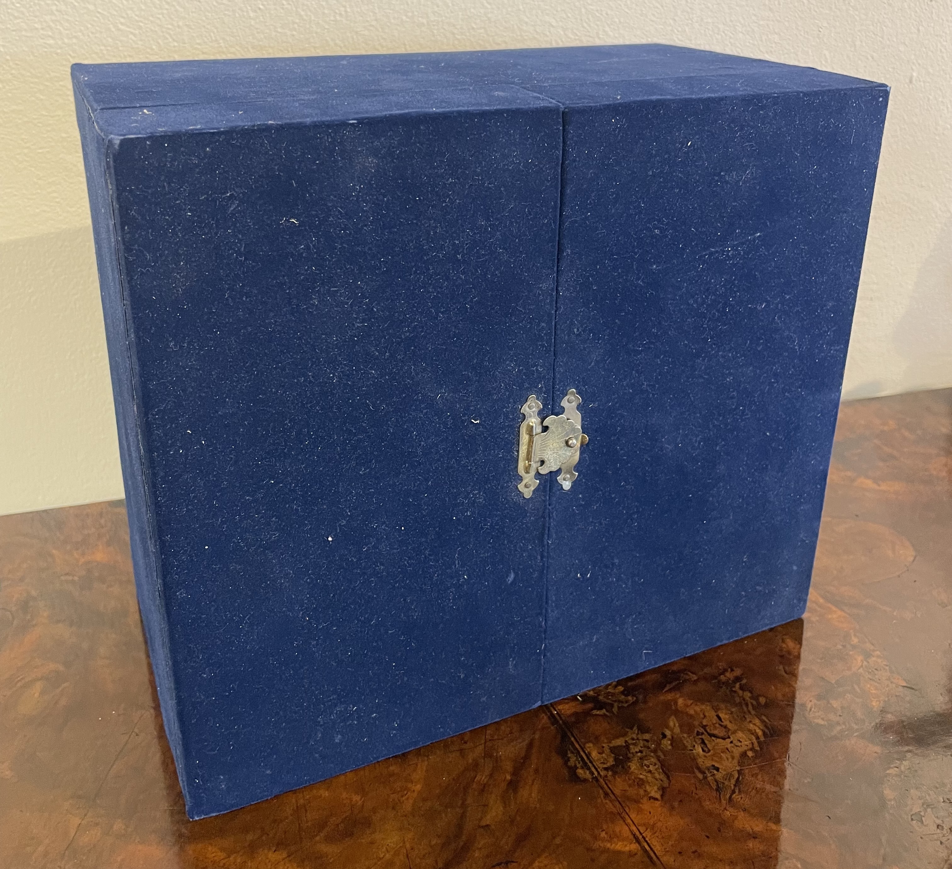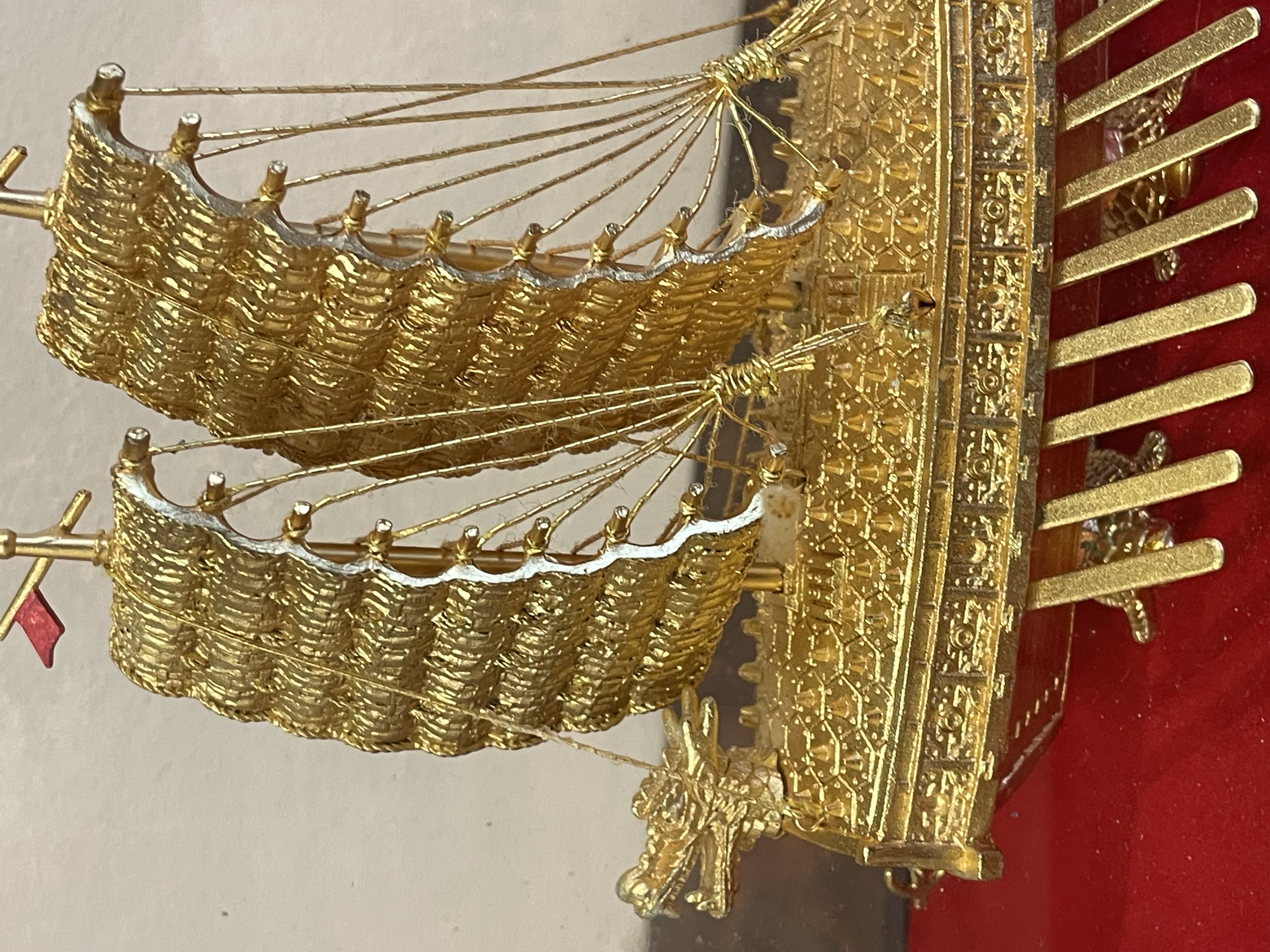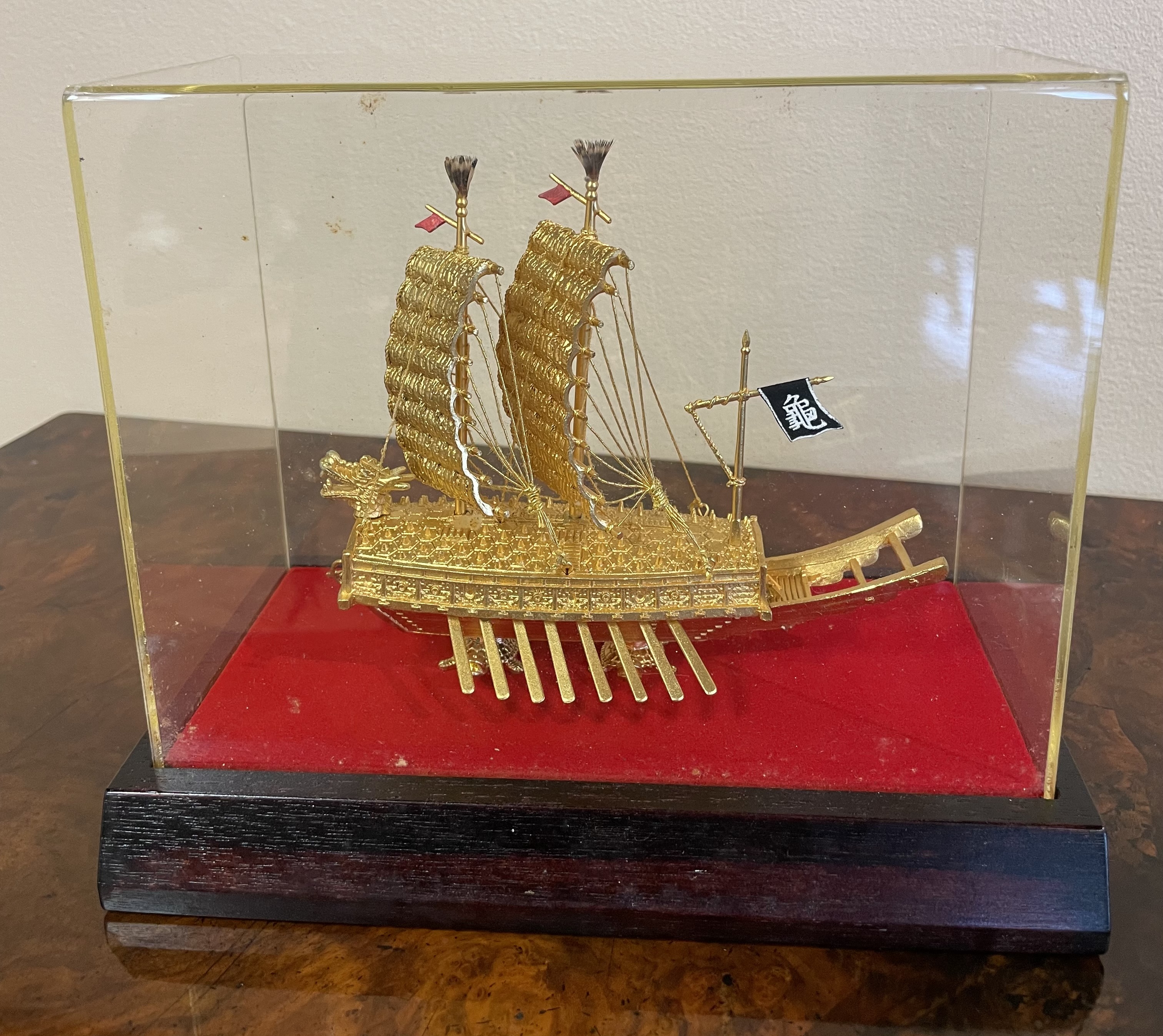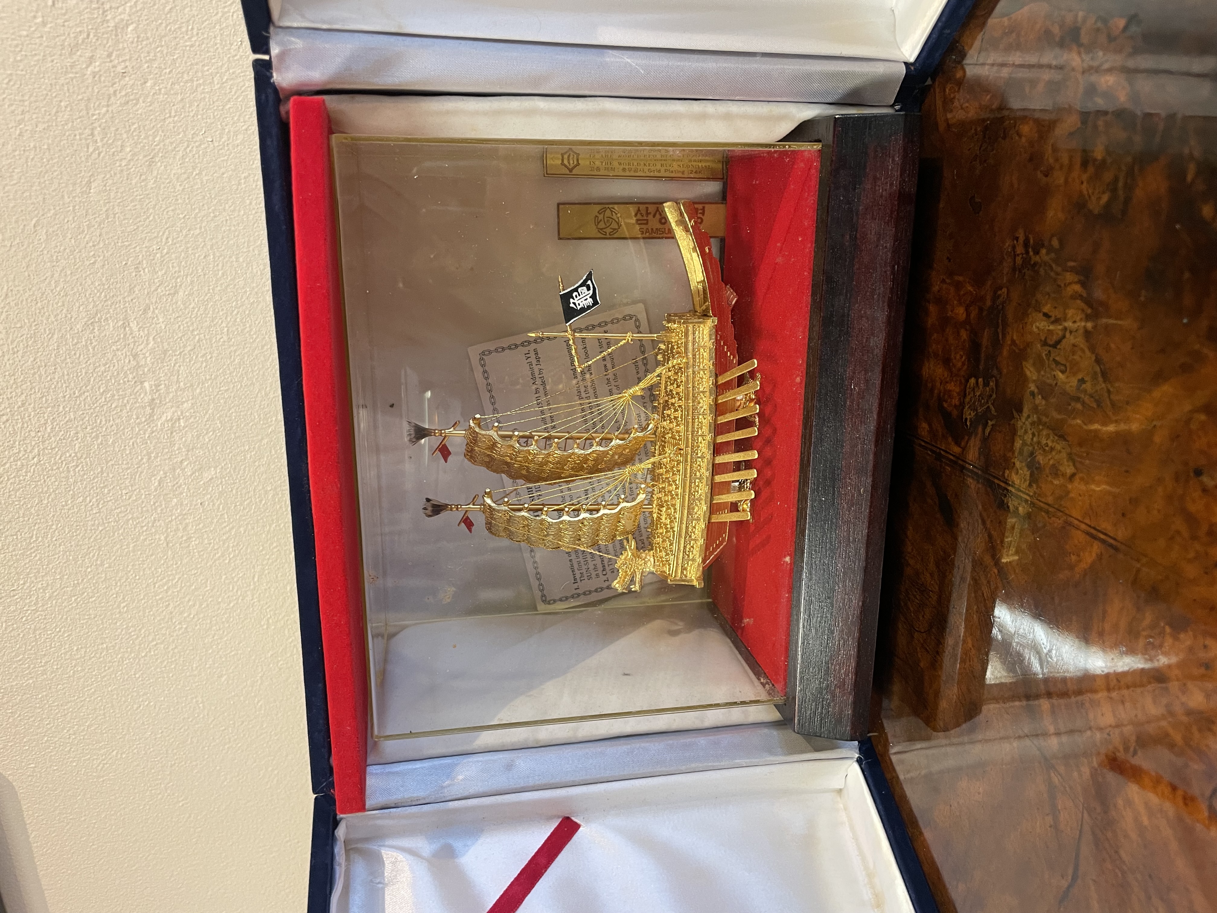 A commemorative 24K gold-plated model of a Korean Turtle Ship, also known as a Geobukseon. The metal model features a dragon-head prow, a deck covered in spikes, two masts with textured sails, and a series of oars along the hull. A black flag mounted on a mast displays the Hanja character 龜. The model is housed in a clear acrylic display case with a red velvet-lined interior and a dark wood base. Two gold-toned plaques are mounted inside the case; one identifies the piece as a Samsung commemorative item and the other provides historical information regarding Admiral Yi Sun-shin and specifies Gold Plating 24K. The set is contained within a blue velvet-covered presentation box with a decorative metal clasp.