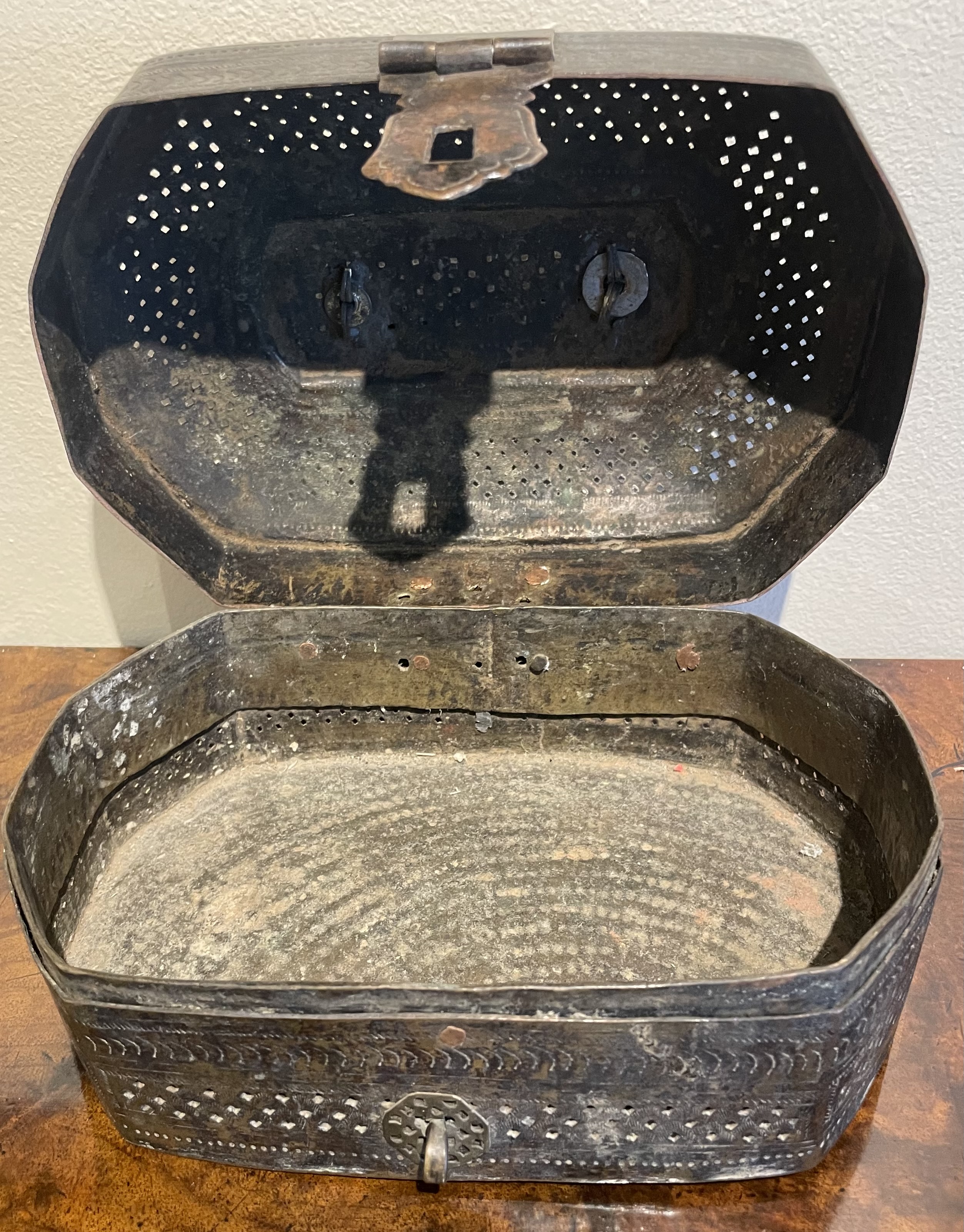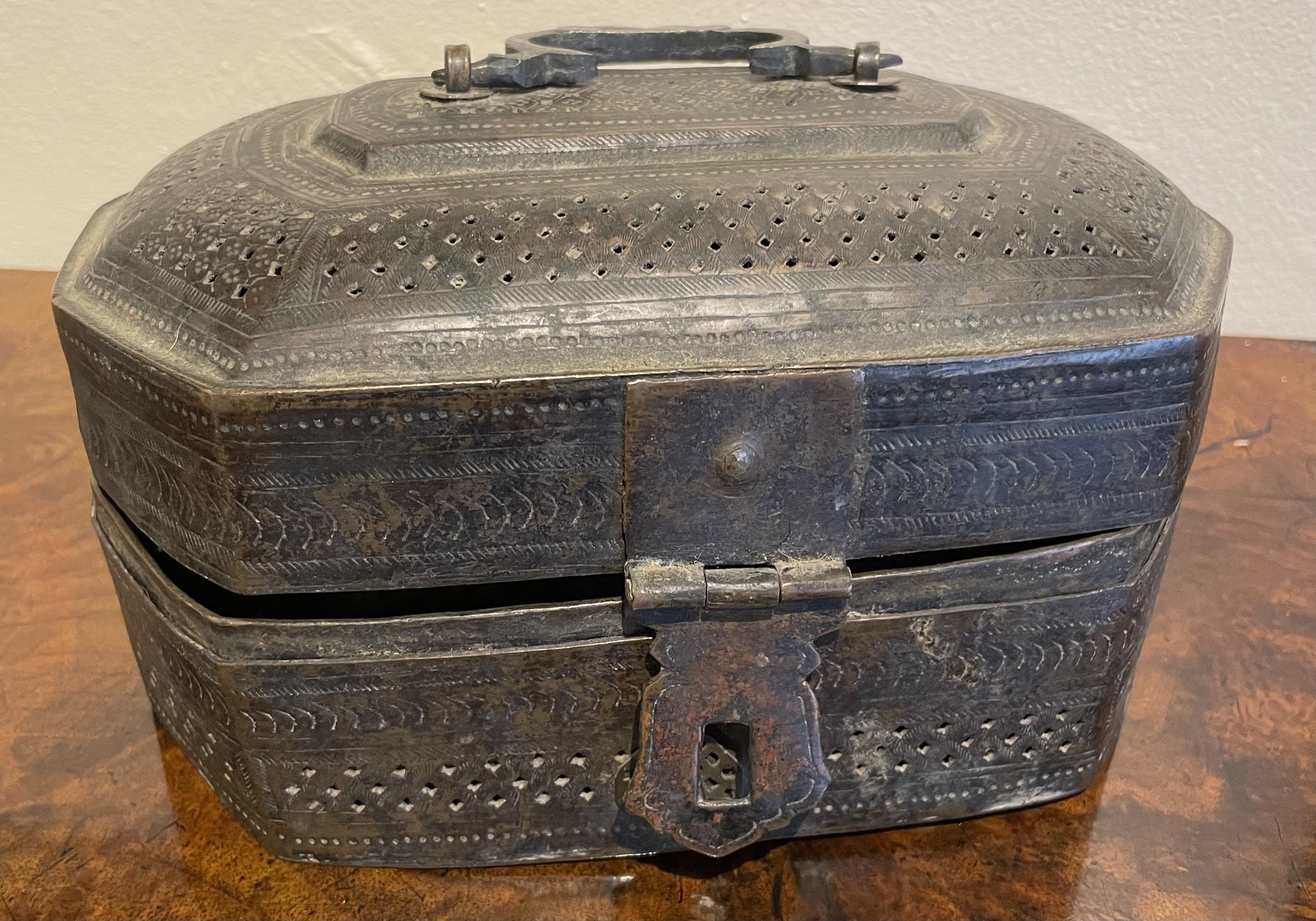 An 18th century Indo-Persian pandan or betel nut box of octagonal form, constructed from a brass copper alloy. The piece features a stepped, domed lid and is decorated throughout with chased and engraved foliate and geometric borders. Bands of pierced diamond-shaped jali perforations are present across the base and the lid. The box is equipped with a hinged lid, a swing-top carrying handle, and a large decorative front latch and hasp. The interior shows evidence of manual hammered construction.