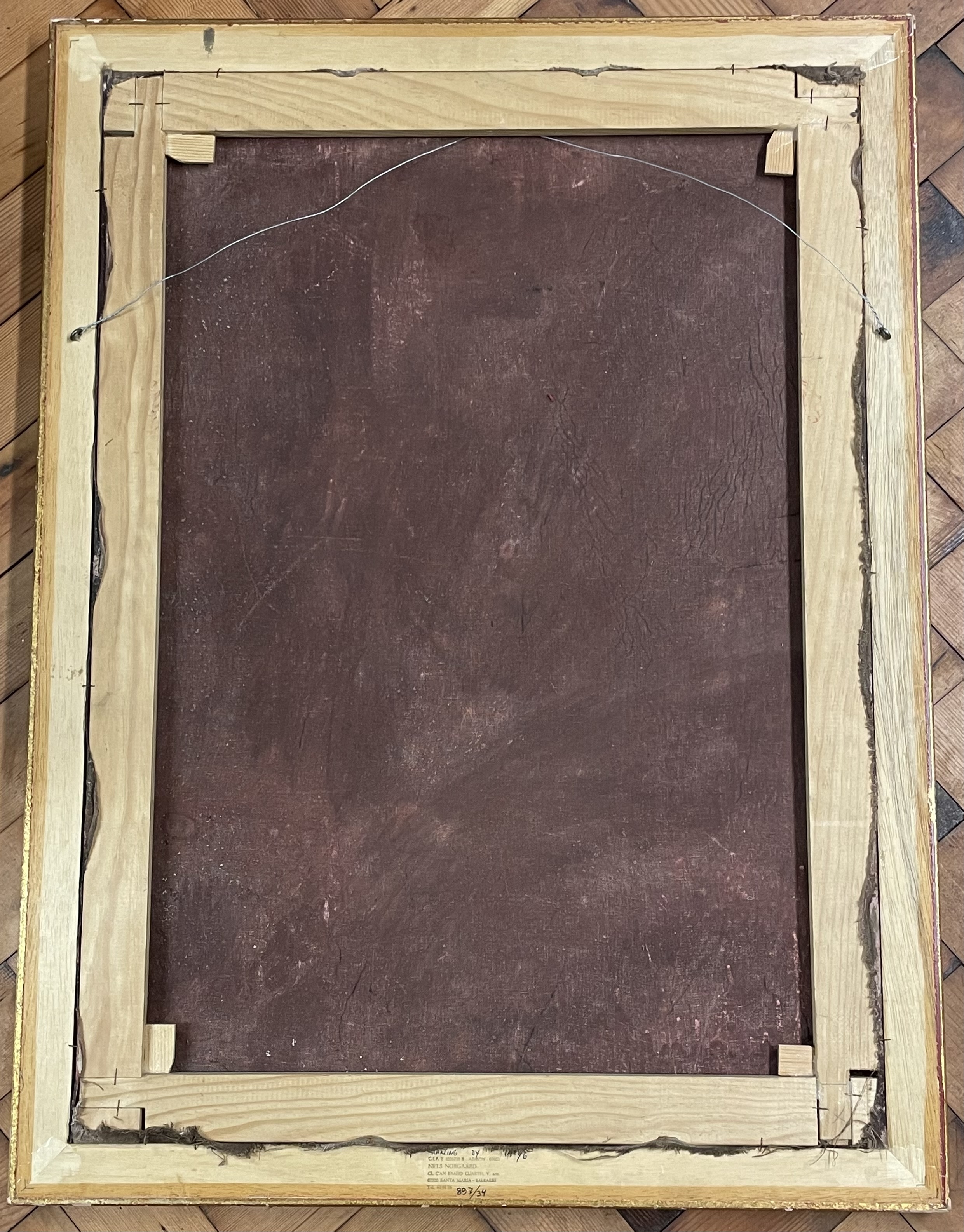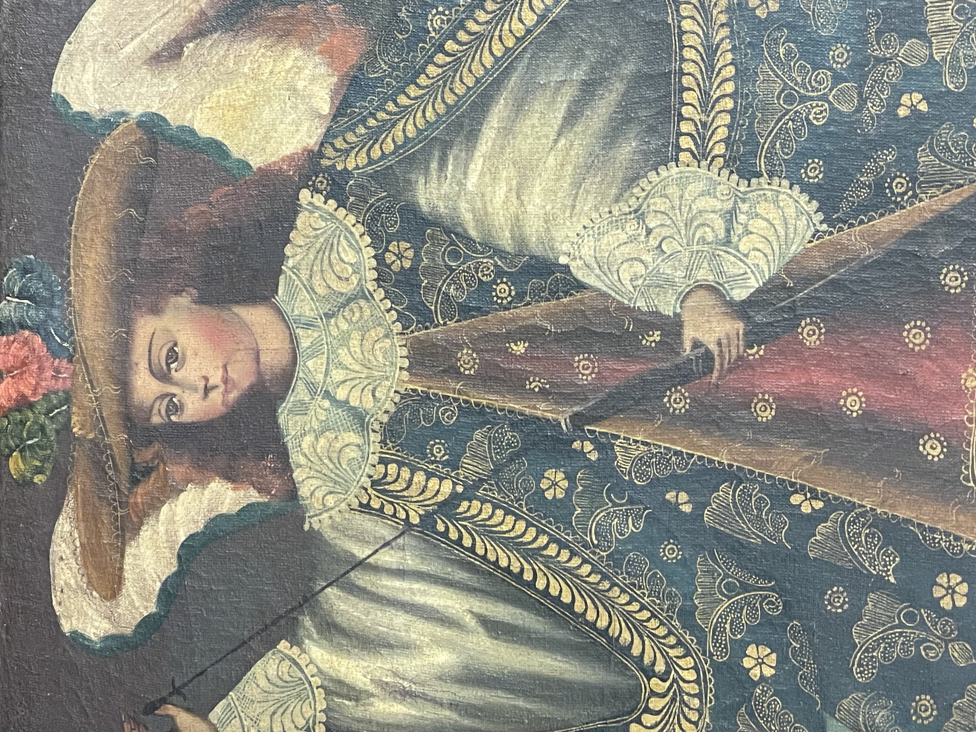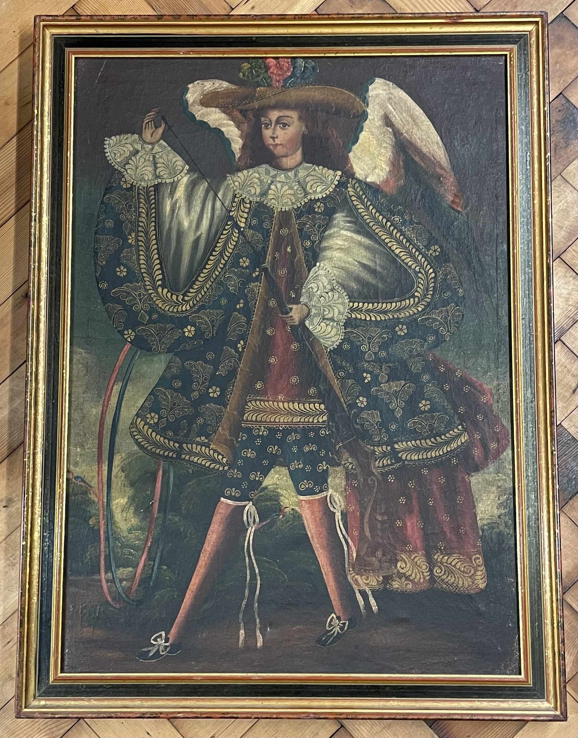 This oil on canvas painting is executed in the Cuzco School style and dates to the 20th century. The work depicts an Angel Arcabucero, or Arquebusier Angel, a subject characteristic of Spanish Colonial art. The winged figure is rendered in ornate seventeenth-century-style garments featuring extensive gold-leaf brocateado detailing and a plumed hat. The figure is shown holding a long-barreled firearm against a muted landscape background. The work is presented in a giltwood frame. A framing label on the reverse identifies the business Cornelius and Andrew Land of Santa Maria, Mallorca, Spain.