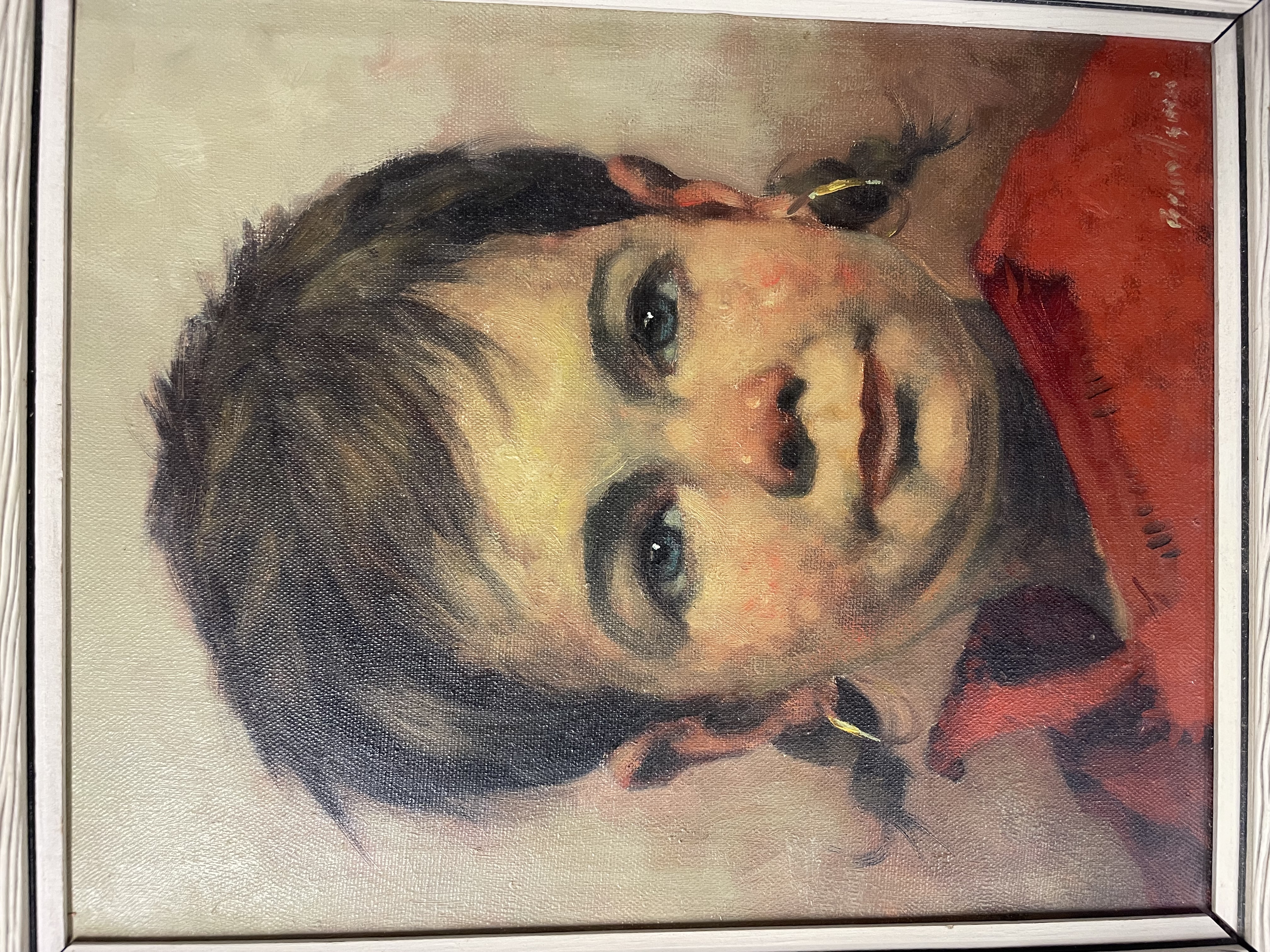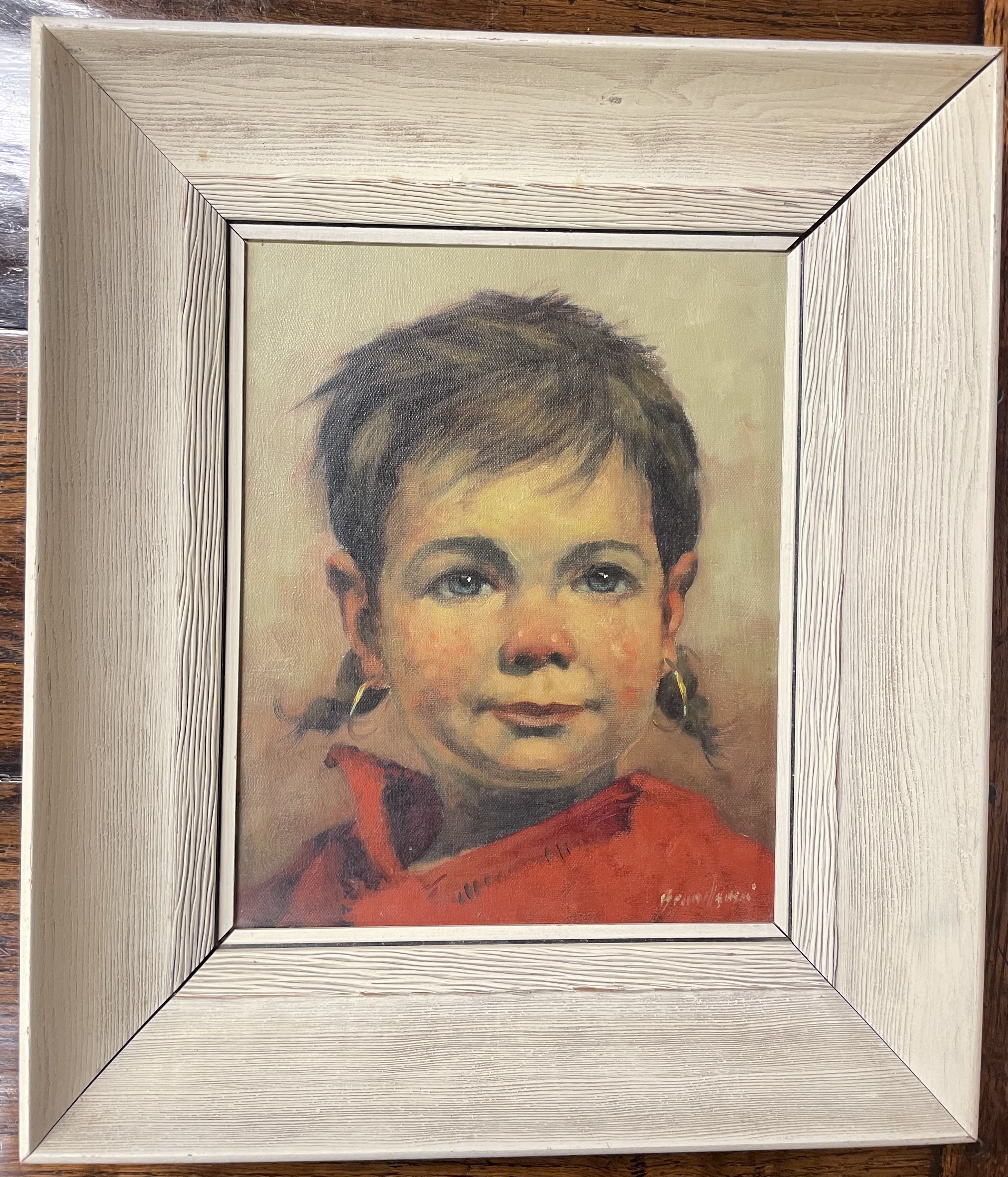 A mid-20th-century oil on canvas portrait depicting a young child with dark hair, blue eyes, and small gold-tone hoop earrings, wearing a red garment. The work is executed in a realistic style with visible impasto and textural brushwork. The piece is signed in the lower right corner. The painting is housed in a deep, textured off-white wooden frame with a dark interior fillet.