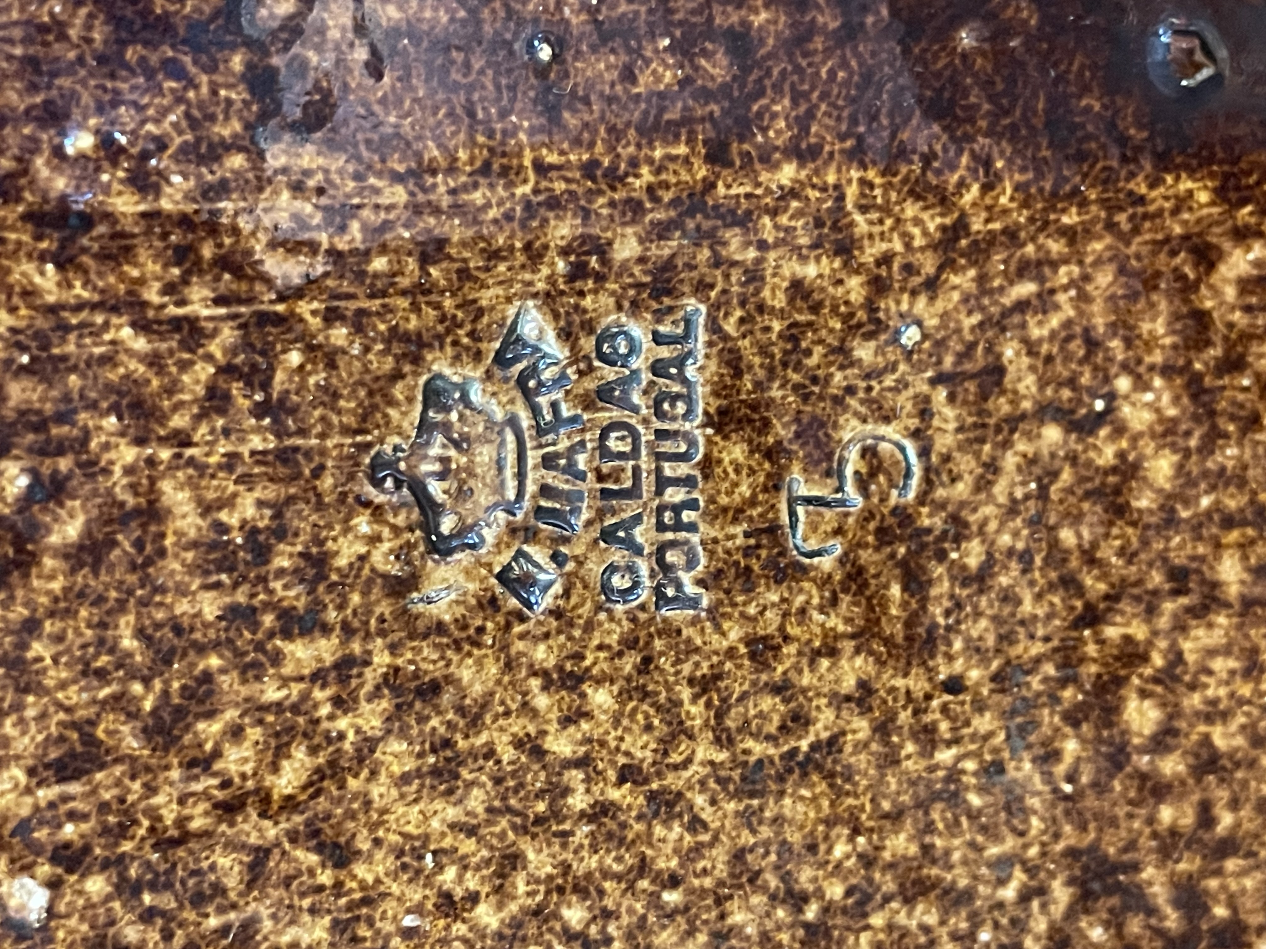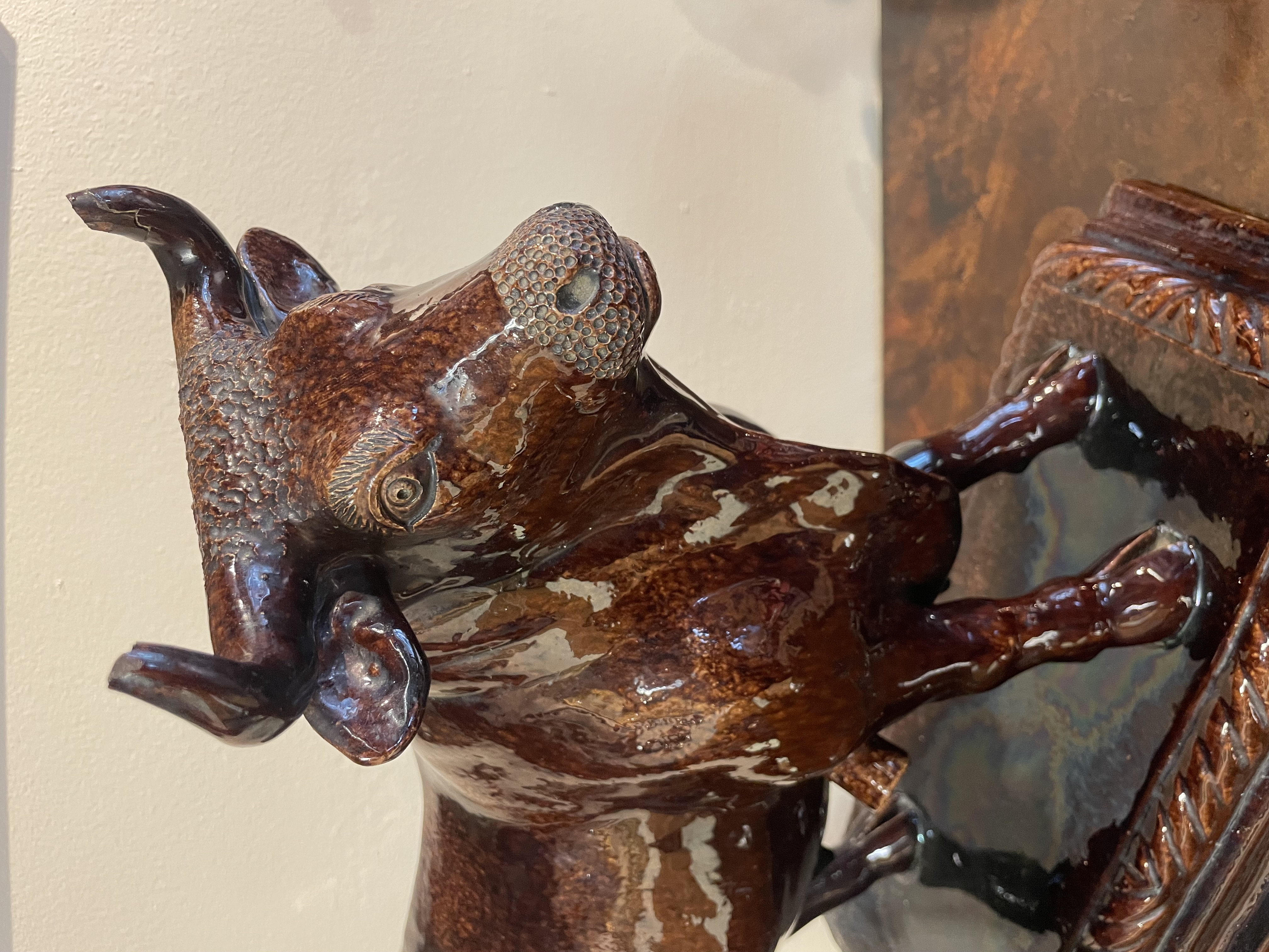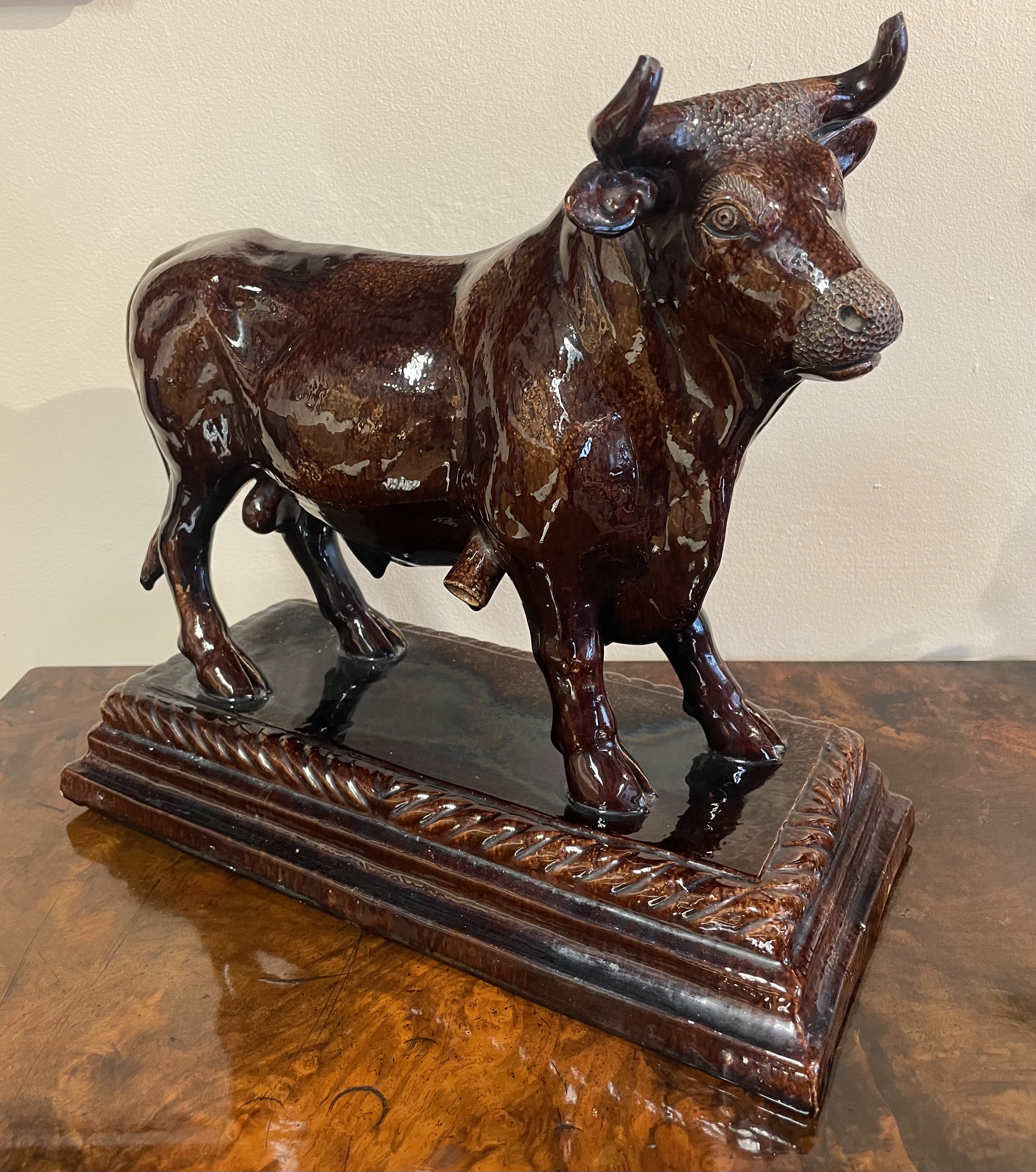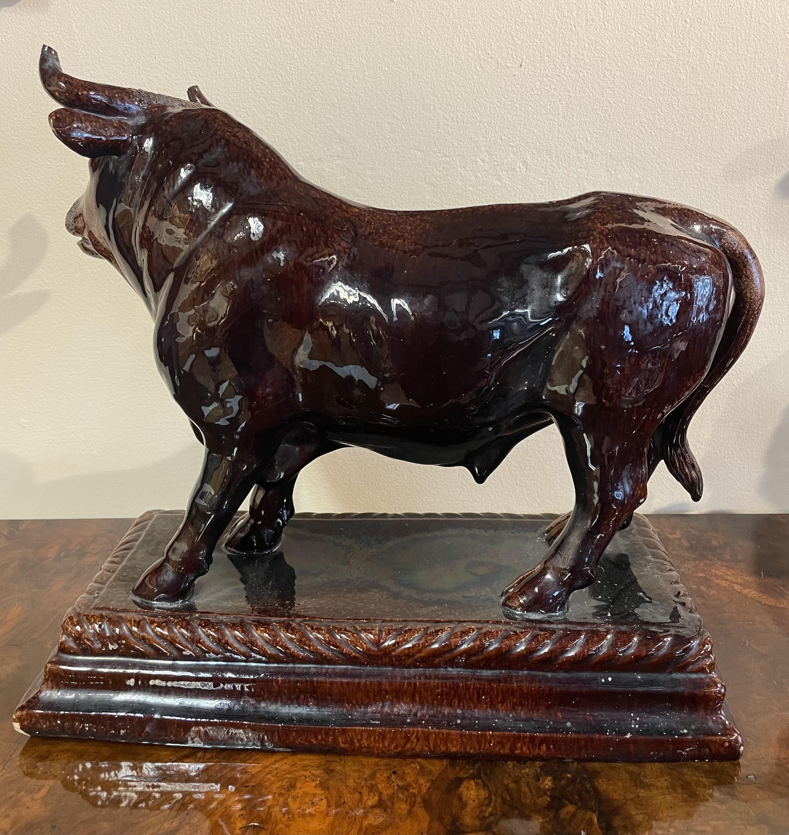 A Portuguese pottery brown glazed model of a bull, dating to the late 19th century. The ceramic figure is modeled in a standing position atop an integral, tiered rectangular pedestal base decorated with a rope-twist border. The piece is finished in a rich, dark brown mottled treacle glaze. Physical features include a textured forehead, dimpled muzzle, and detailed anatomical modeling. Marks stamped on the underside.