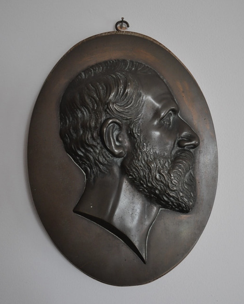 An oval-shaped relief plaque cast in bronze with a dark brown patina, believed to be depicting the profile portrait of James A. Garfield, the 20th US president 1831 – 1881. The high-relief casting shows detailed execution of the hair, full beard, and facial features in a classical commemorative style typical of late 19th-century American political portraiture. The item includes a small integrated metal hanging loop at the top for wall mounting and an oak back.