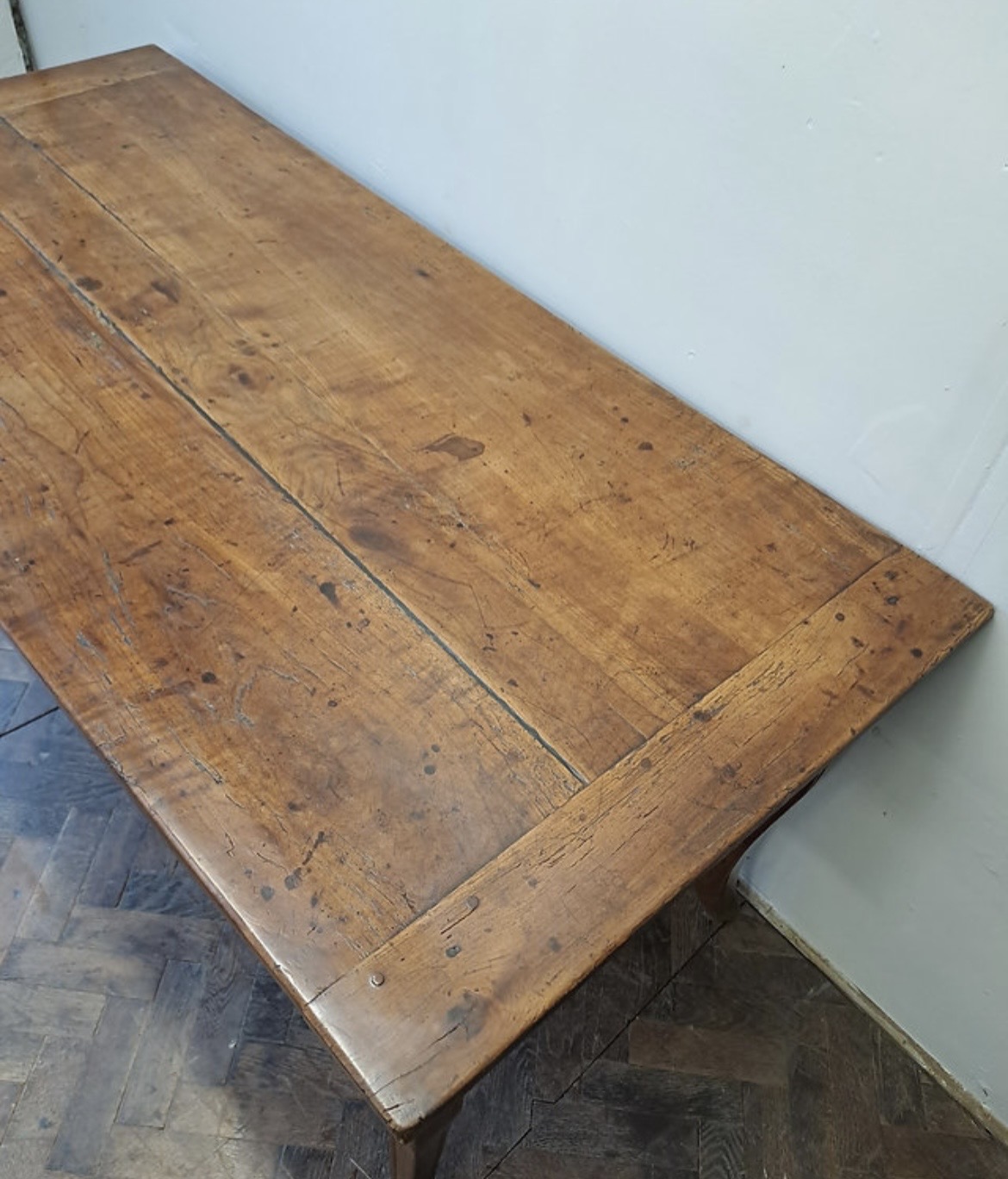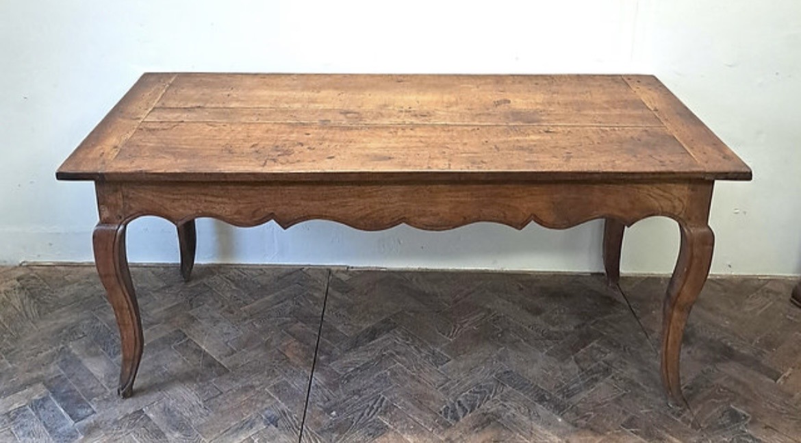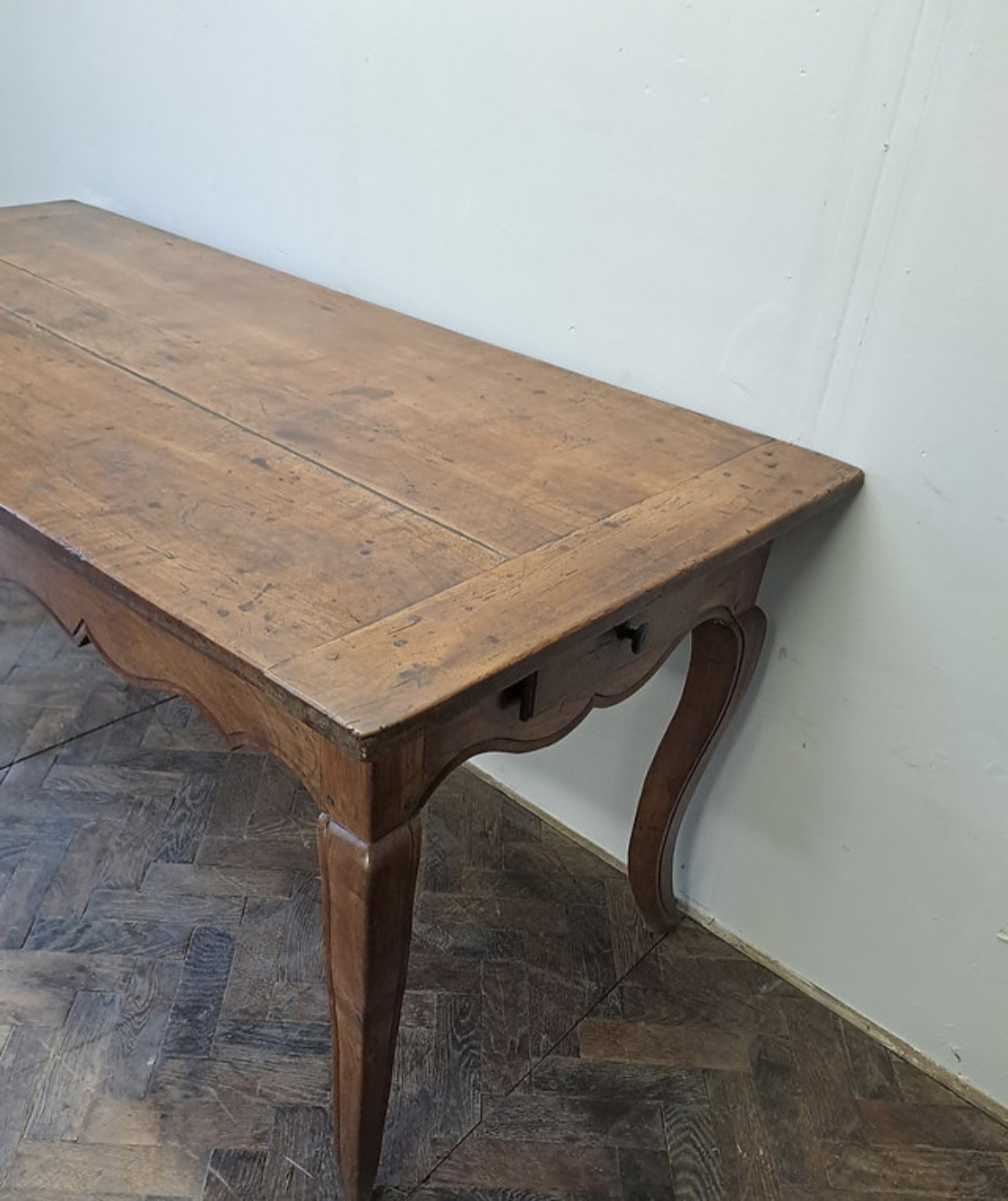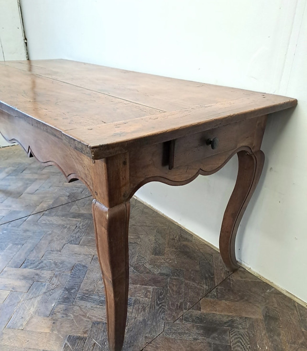 This antique French Louis XV style Provencal dining table is constructed from solid walnut, featuring a rich, honey-toned patina. The rectangular tabletop consists of three wide longitudinal planks with breadboard ends, showing visible pegged mortise-and-tenon joinery. The design includes a decoratively scalloped apron on all sides and is supported by four slender cabriole legs. A single drawer with a simple round pull knob is situated at one end.
