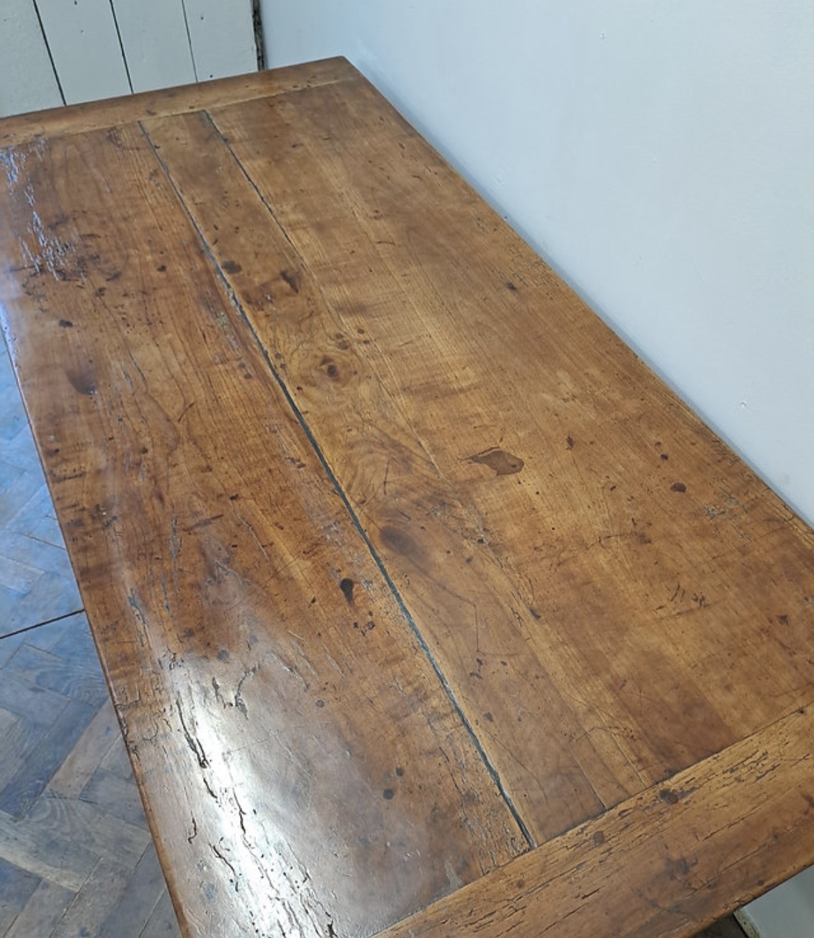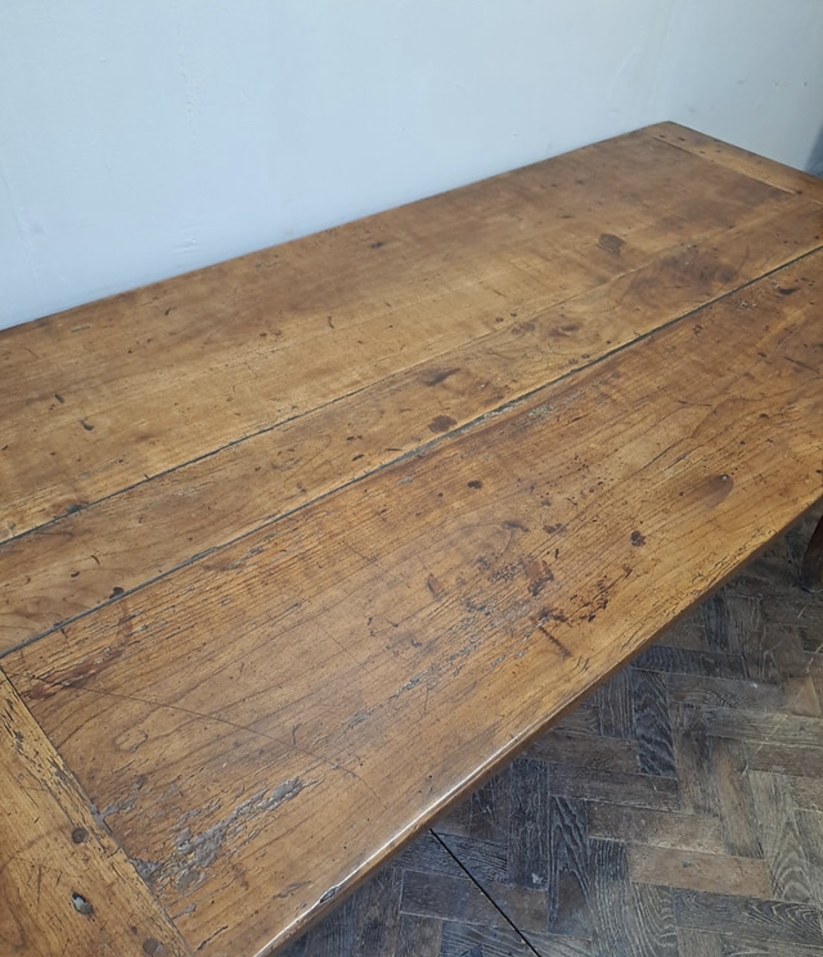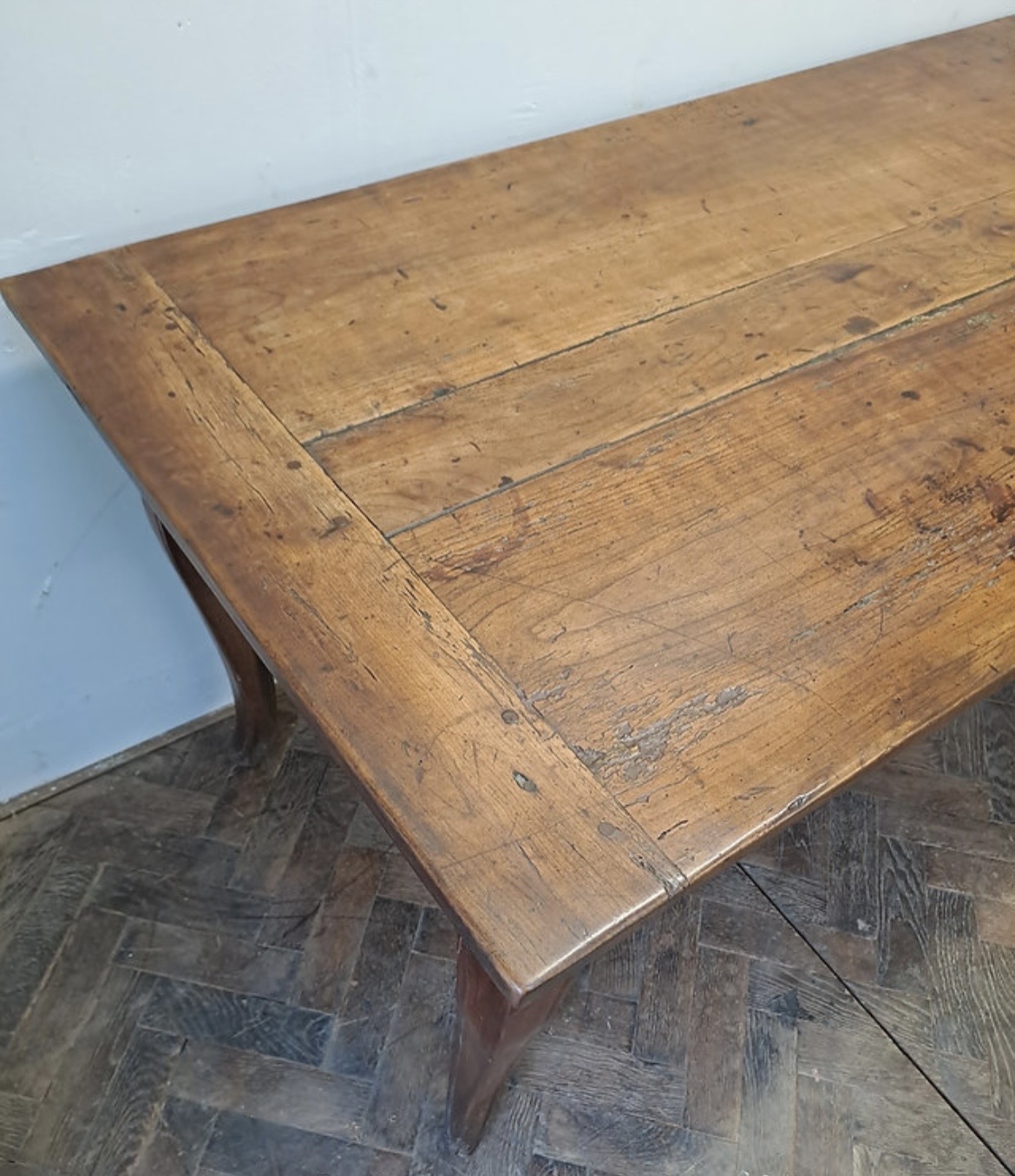 This antique French Louis XV style Provencal dining table is constructed from solid walnut, featuring a rich, honey-toned patina. The rectangular tabletop consists of three wide longitudinal planks with breadboard ends, showing visible pegged mortise-and-tenon joinery. The design includes a decoratively scalloped apron on all sides and is supported by four slender cabriole legs. A single drawer with a simple round pull knob is situated at one end.