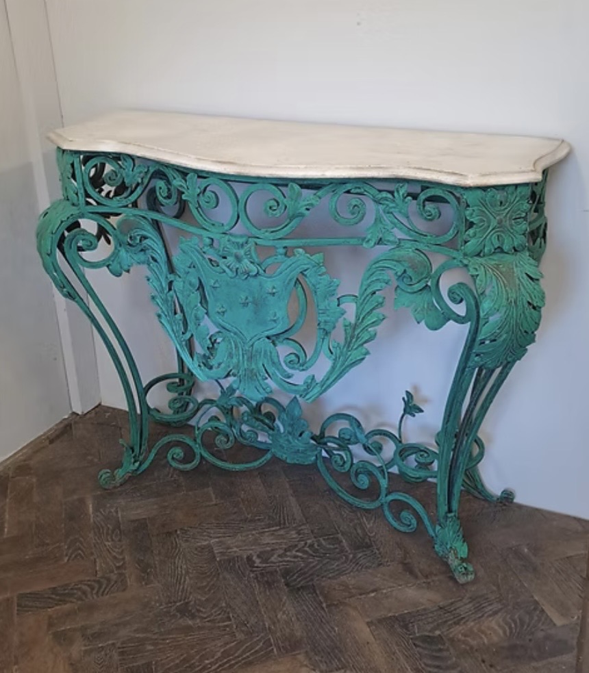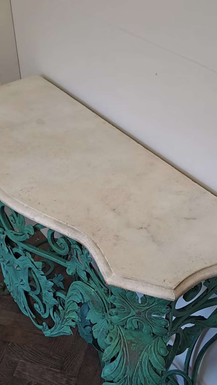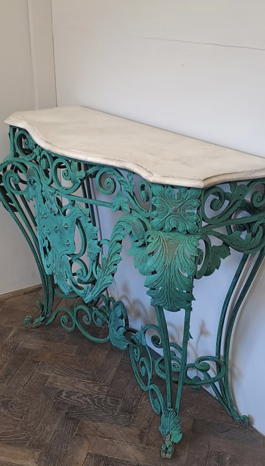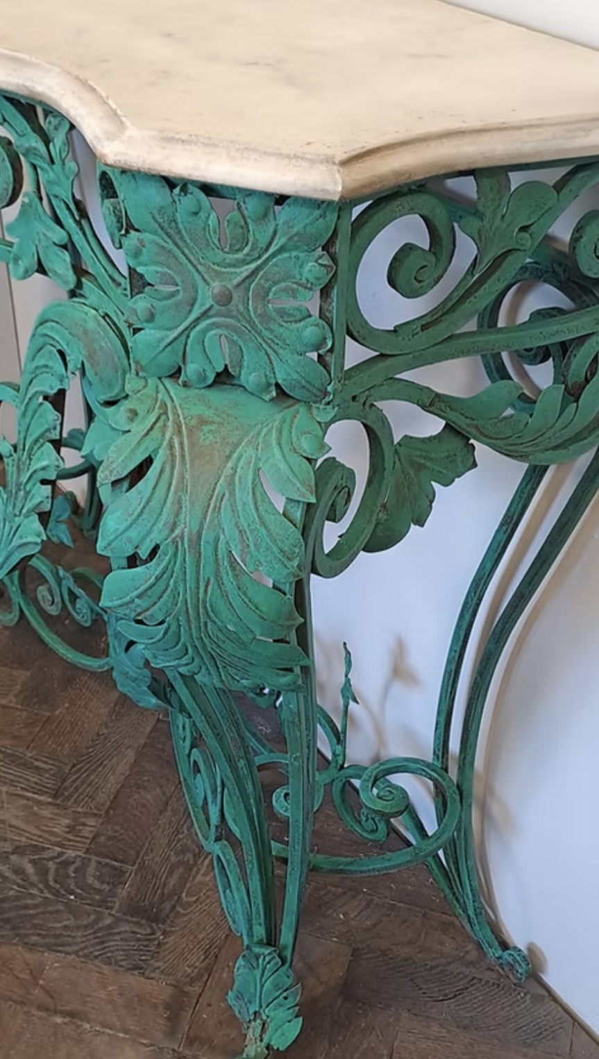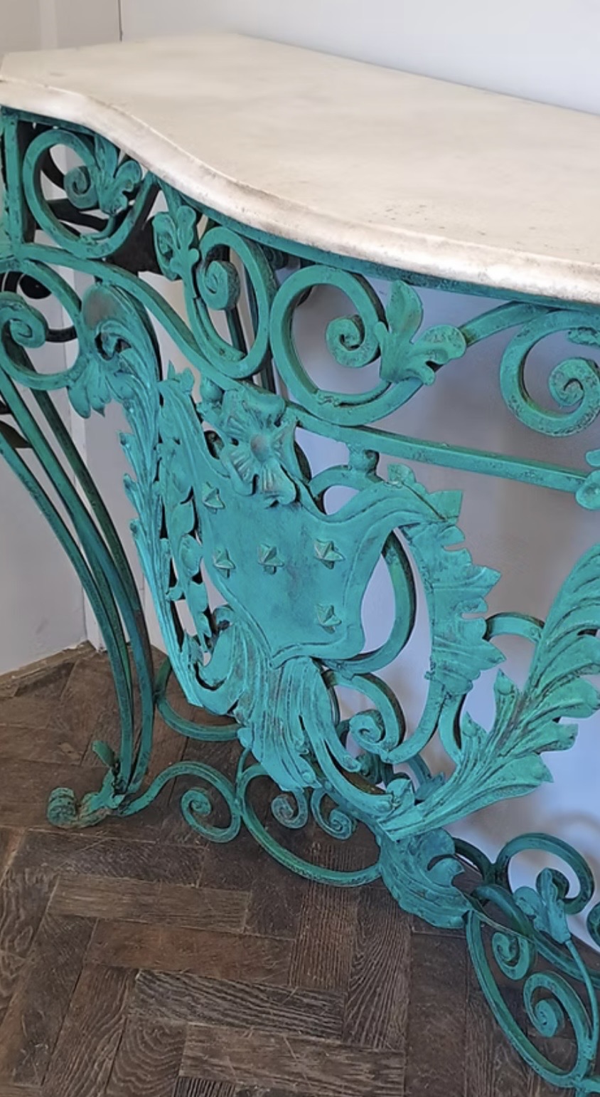 A French style console table featuring a shaped cream colored marble top with a serpentine front and beveled edge. The base is constructed from wrought iron with a textured verdigris green finish. The apron is decorated with acanthus leaf motifs and a central heraldic shield. The structure is supported by cabriole legs with scroll and floral details, terminating in scroll feet. The design incorporates scrolled metalwork throughout the base and lower stretchers.
