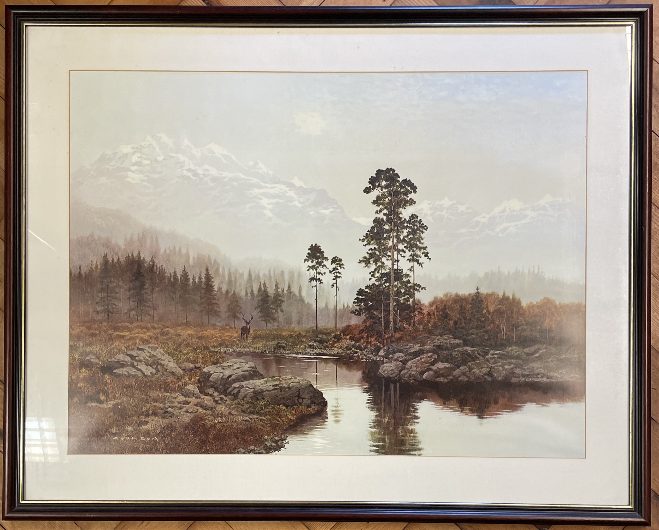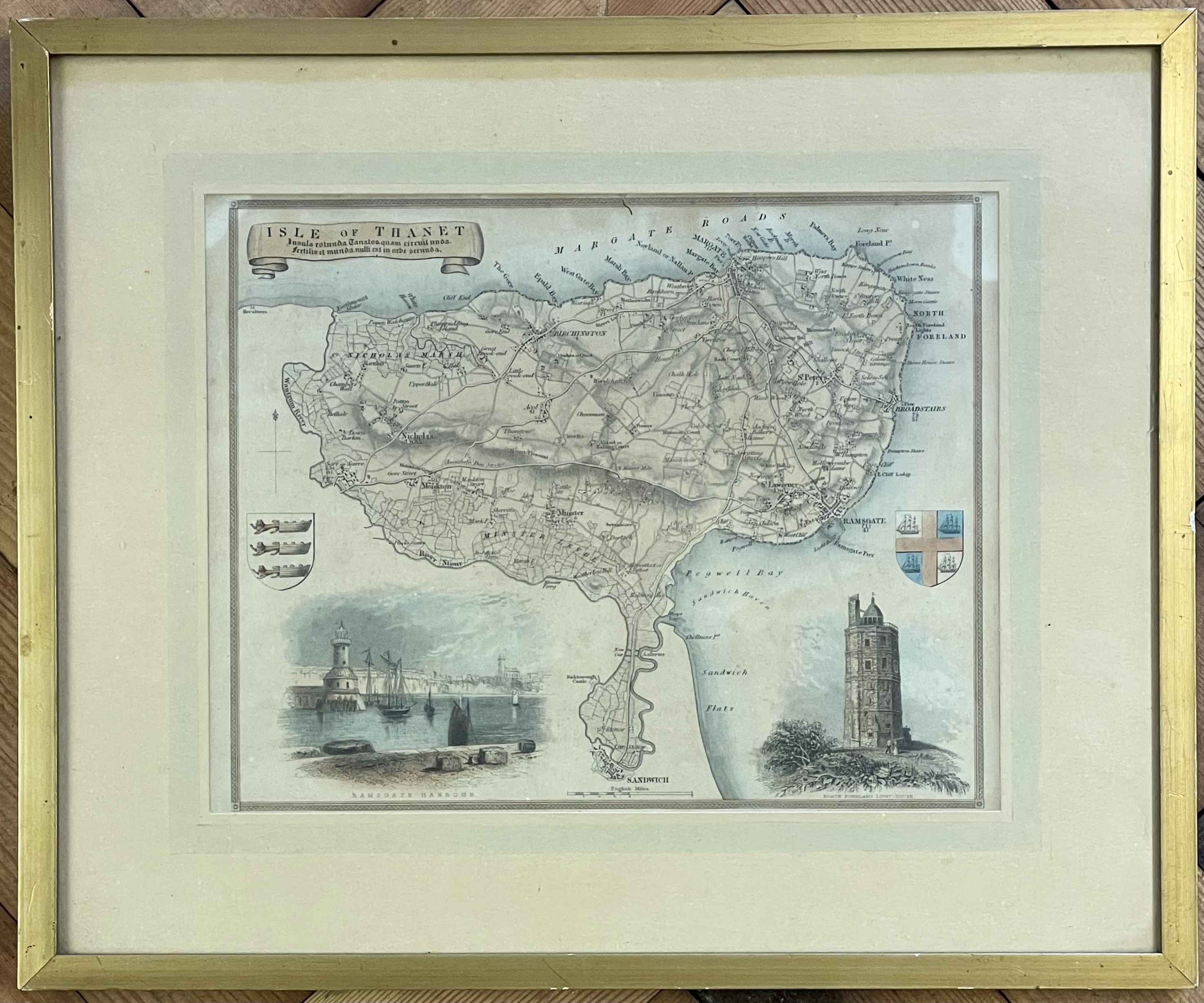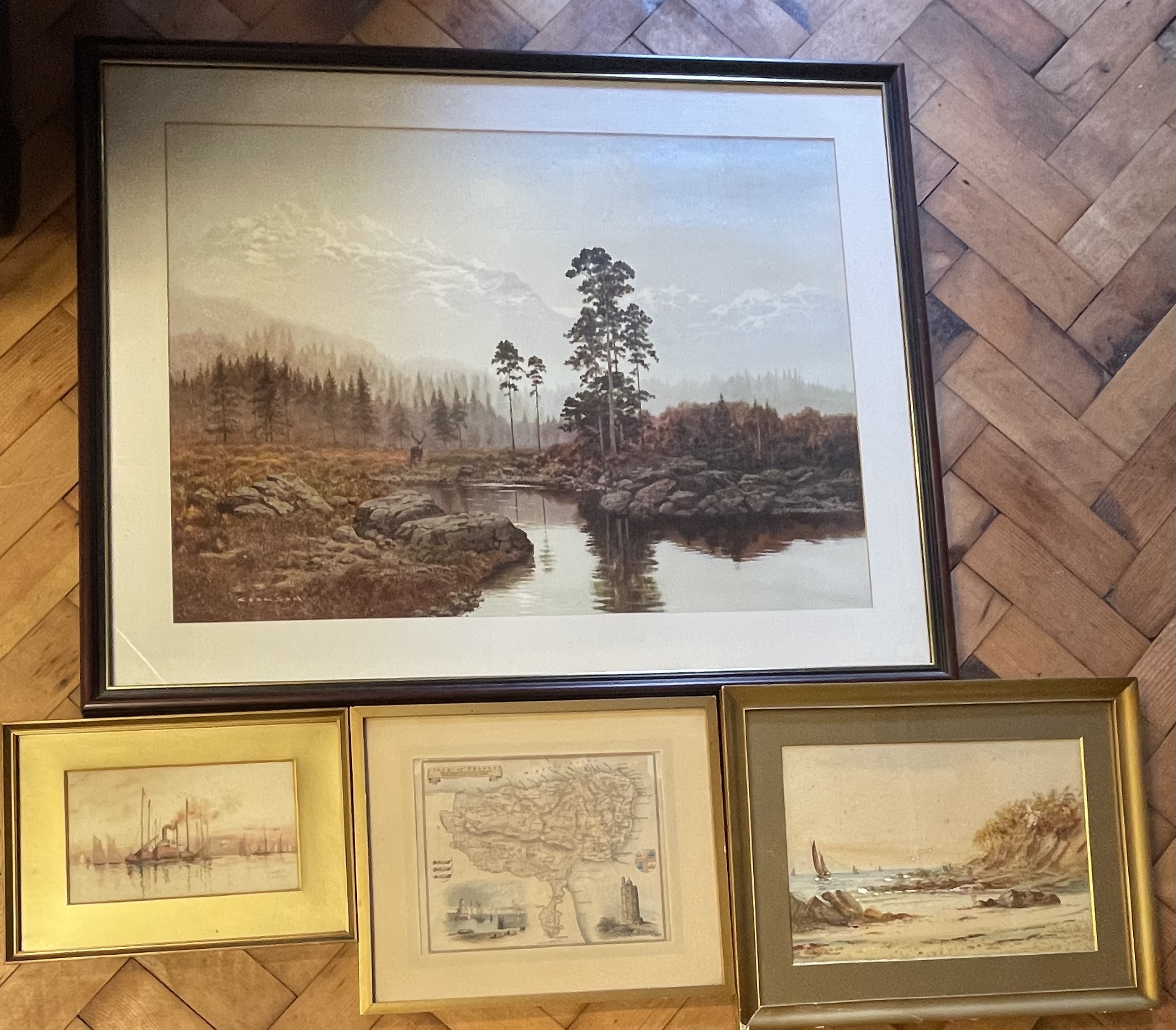 A collection of framed wall art featuring a large landscape print titled Silent Majesty by Gerald Coulson. The primary work depicts a wilderness scene with a stag positioned near a lake and snow-capped mountains in the distance, signed COULSON in the lower left. It is housed in a dark wood frame with a white mount. The collection also includes two smaller watercolor paintings in matching gilt-finish frames with wide gold-toned mounts. One watercolor is a coastal scene titled ENTRANCE TO FALMOUTH HARBOR and signed N.E. BRETON, while the other depicts a group of sailing vessels and a steam ship in a harbor. Additionally, the lot contains a framed, colored topographical map titled ISLE OF THANET, featuring inset illustrations of Ramsgate Harbor and the North Foreland Lighthouse. The map includes a Latin inscription translating to The round island of Thanet, which the wave encircles. Fertile and clean, it is second to none in the world.
