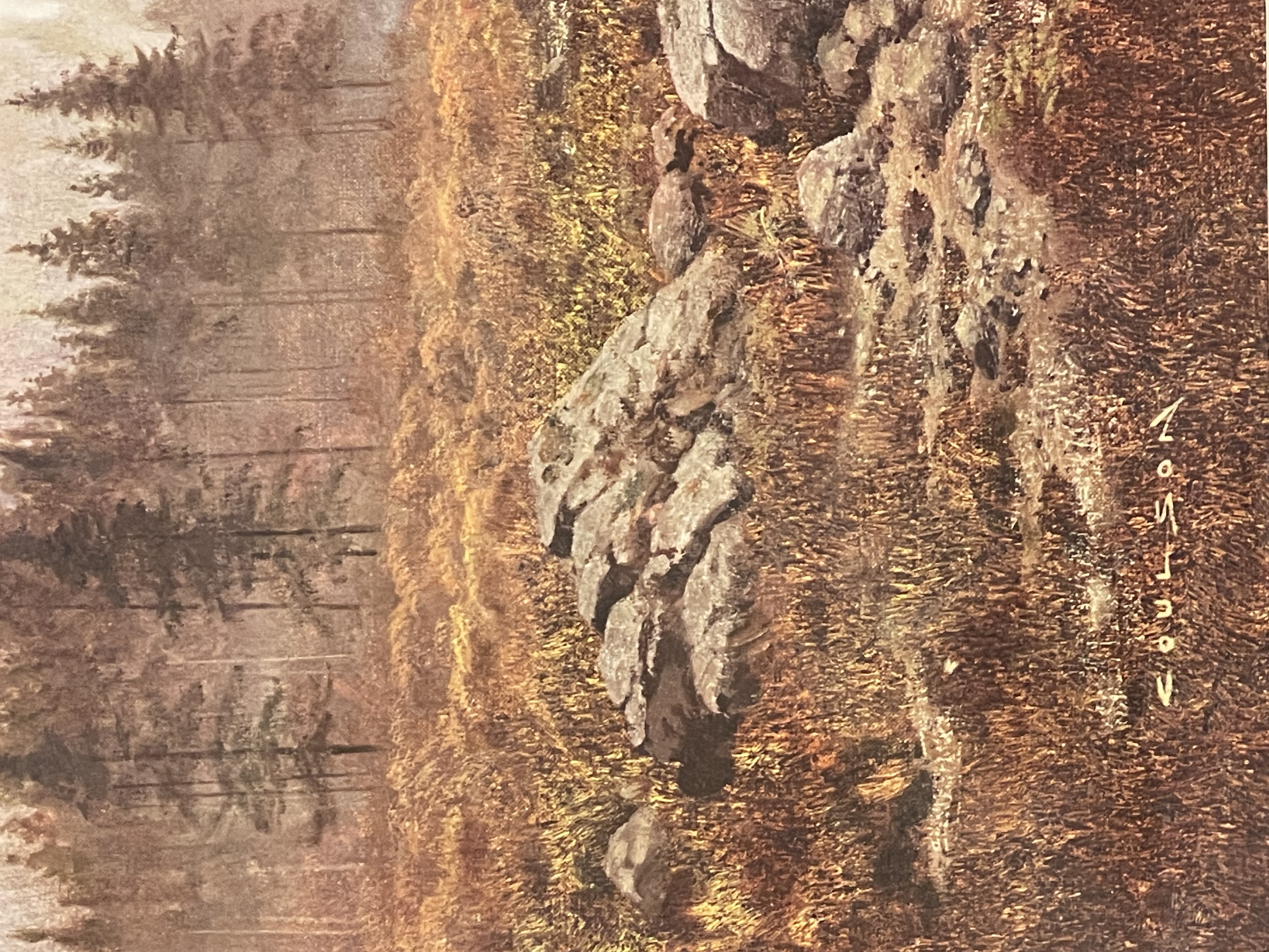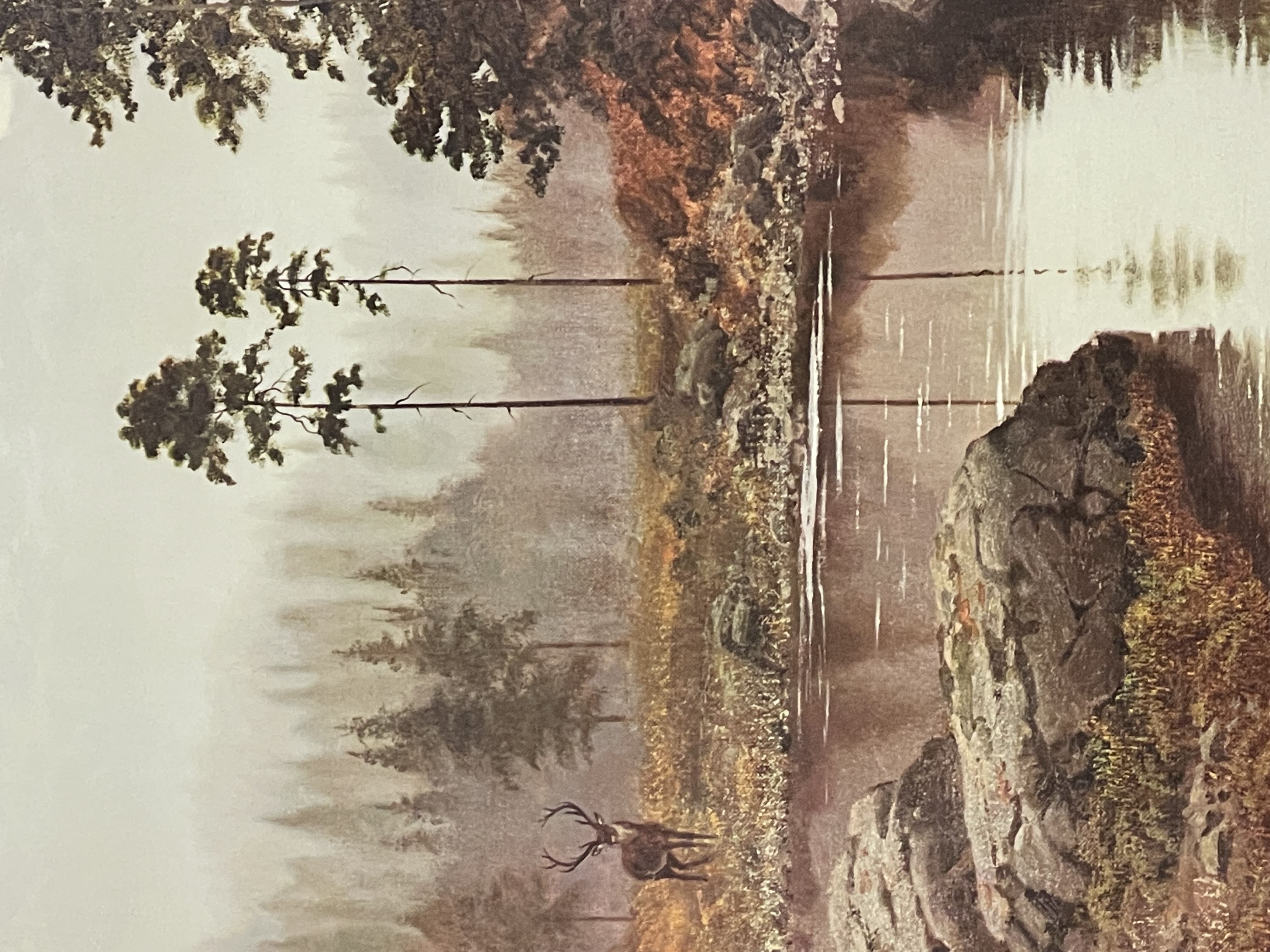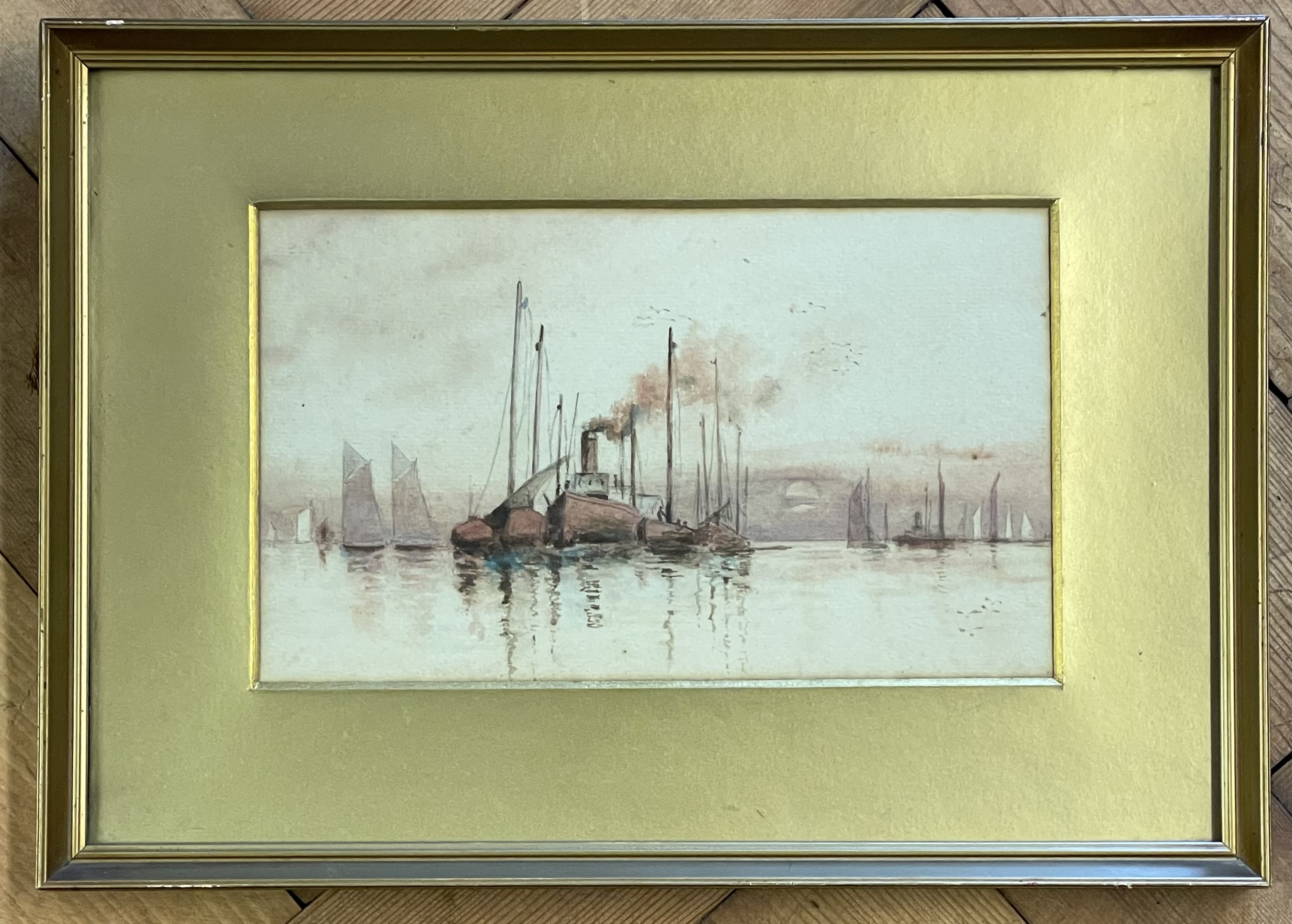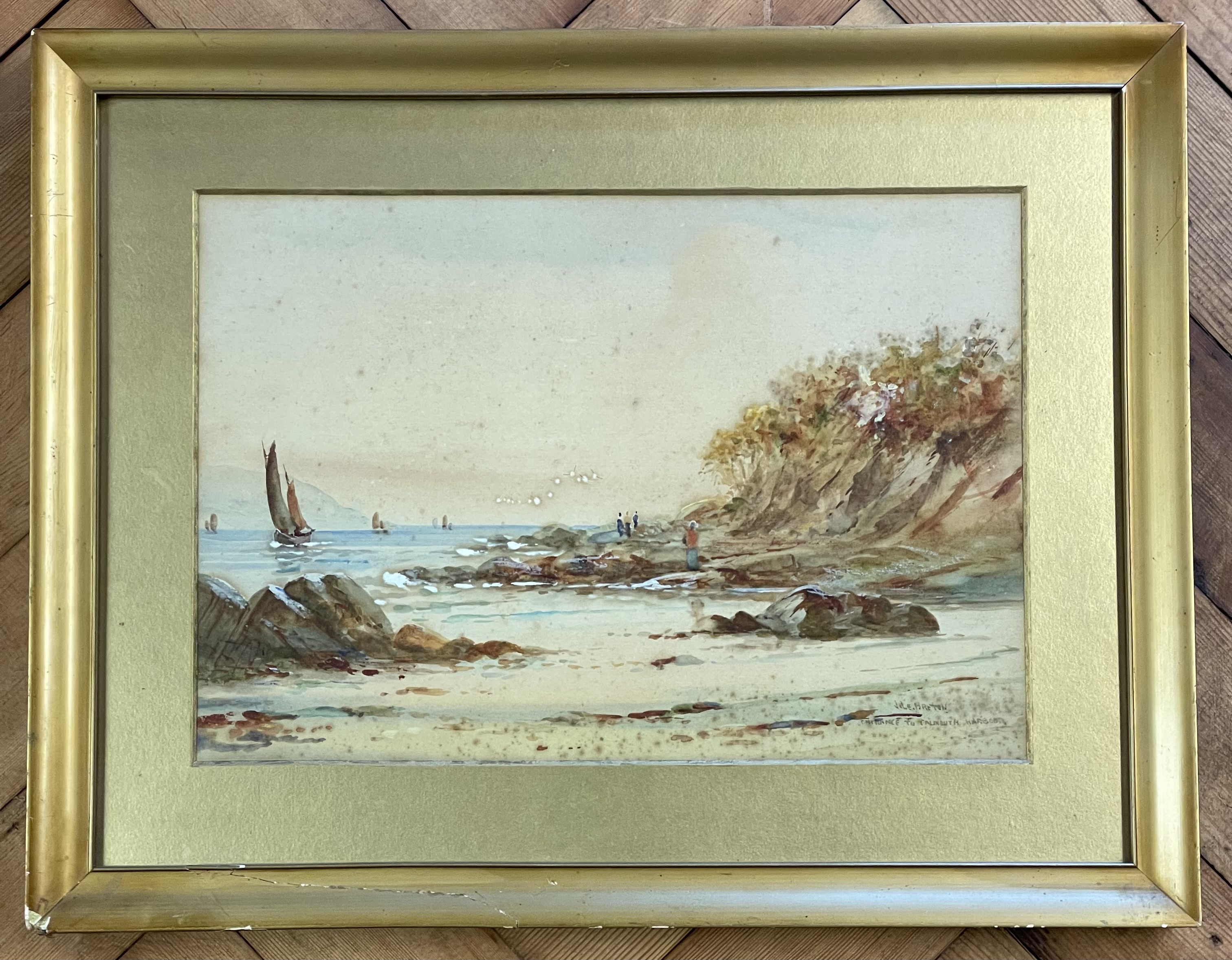 A collection of framed wall art featuring a large landscape print titled Silent Majesty by Gerald Coulson. The primary work depicts a wilderness scene with a stag positioned near a lake and snow-capped mountains in the distance, signed COULSON in the lower left. It is housed in a dark wood frame with a white mount. The collection also includes two smaller watercolor paintings in matching gilt-finish frames with wide gold-toned mounts. One watercolor is a coastal scene titled ENTRANCE TO FALMOUTH HARBOR and signed N.E. BRETON, while the other depicts a group of sailing vessels and a steam ship in a harbor. Additionally, the lot contains a framed, colored topographical map titled ISLE OF THANET, featuring inset illustrations of Ramsgate Harbor and the North Foreland Lighthouse. The map includes a Latin inscription translating to The round island of Thanet, which the wave encircles. Fertile and clean, it is second to none in the world.