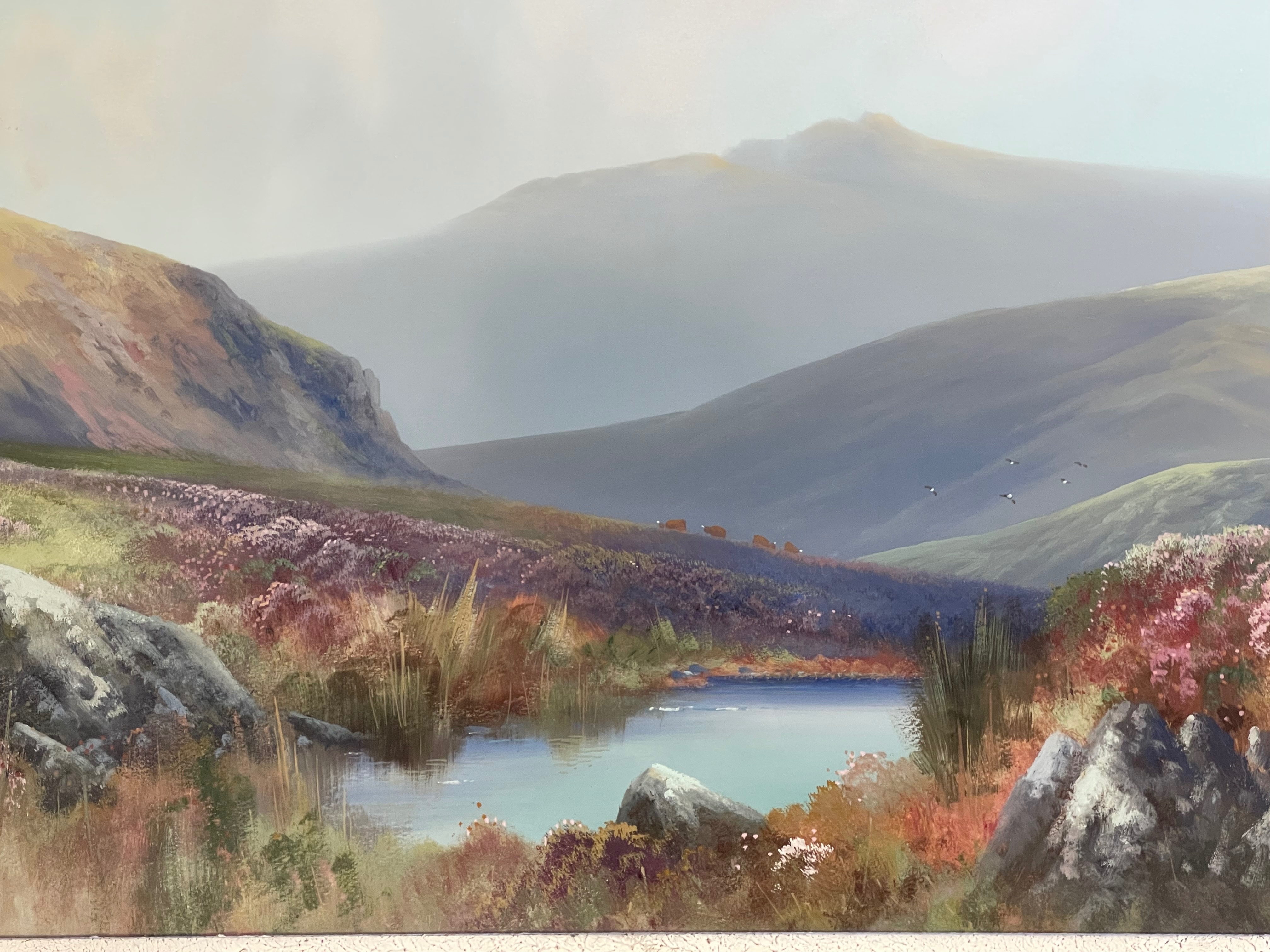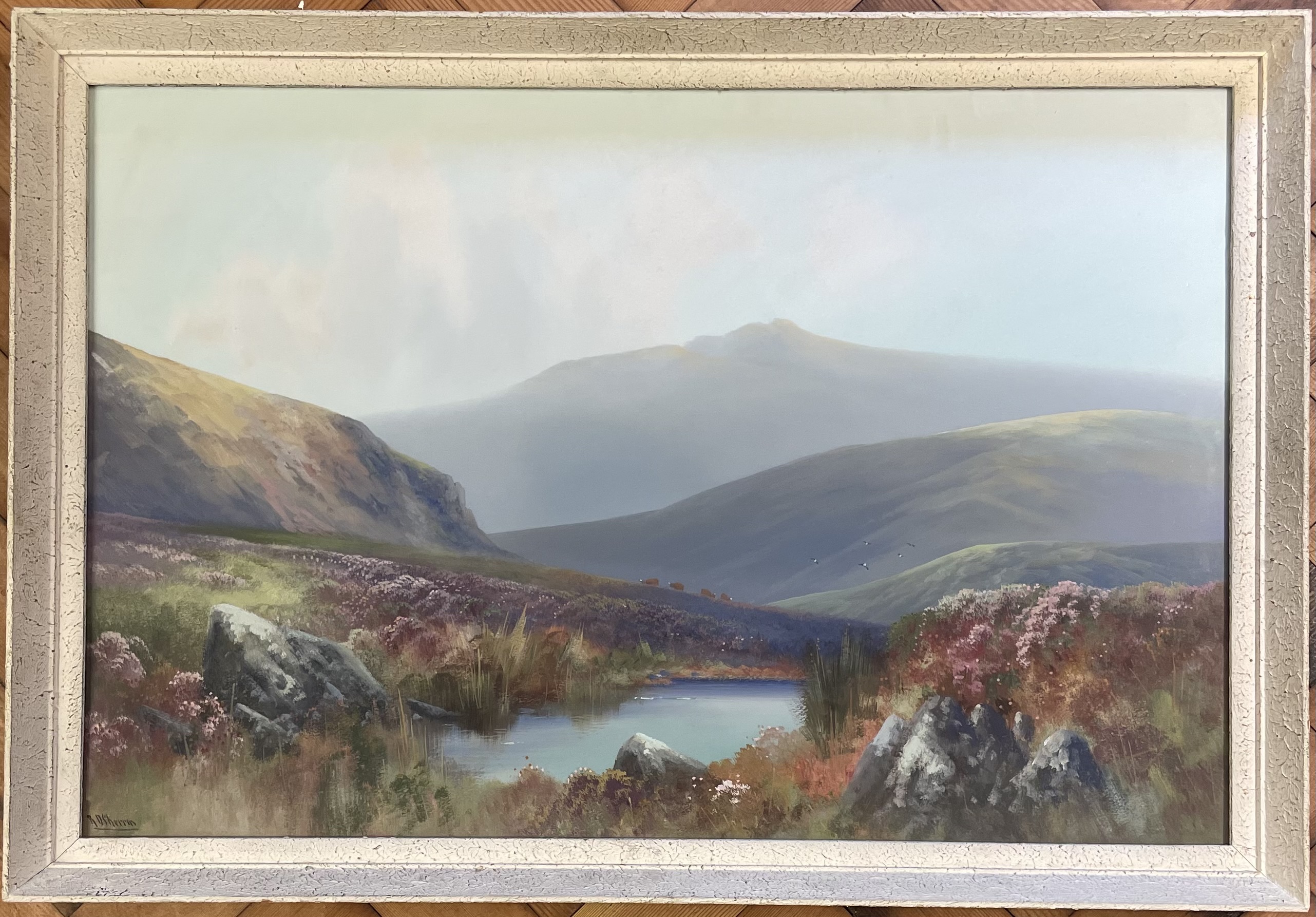 A landscape painting depicting a moorland scene with a pond in the foreground surrounded by rocks and purple heather. The composition includes a rolling hillside with a small herd of cattle and birds in flight, set against a backdrop of hazy mountains under an overcast sky. The work is executed in a naturalistic style and is signed R.D. Sherrin in the lower-left corner. The painting is housed in a wide, light-colored wooden frame with a crackled finish.