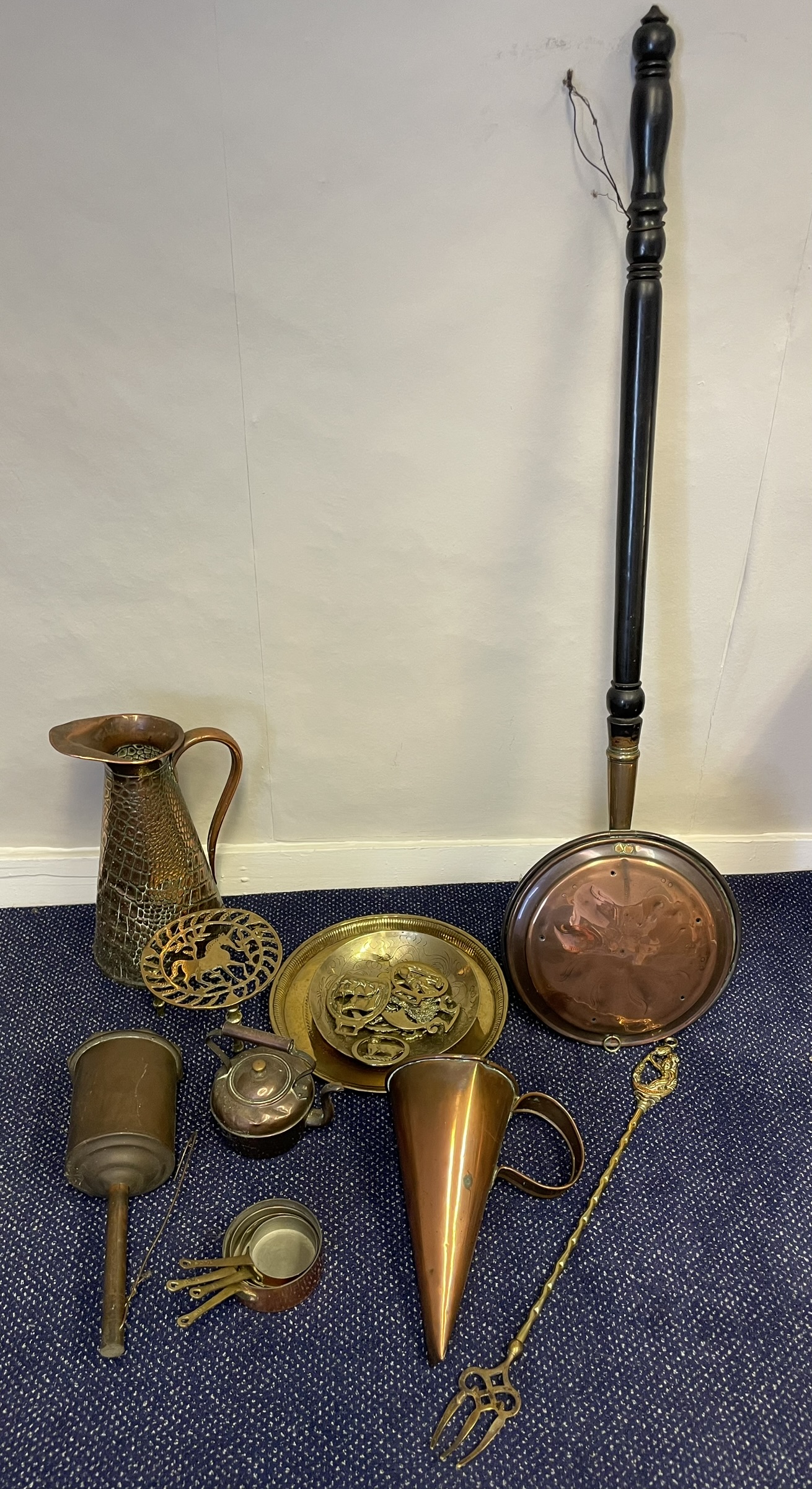 A Selection Of Brass And Copper – including a meat jack, trivet and bed warmer