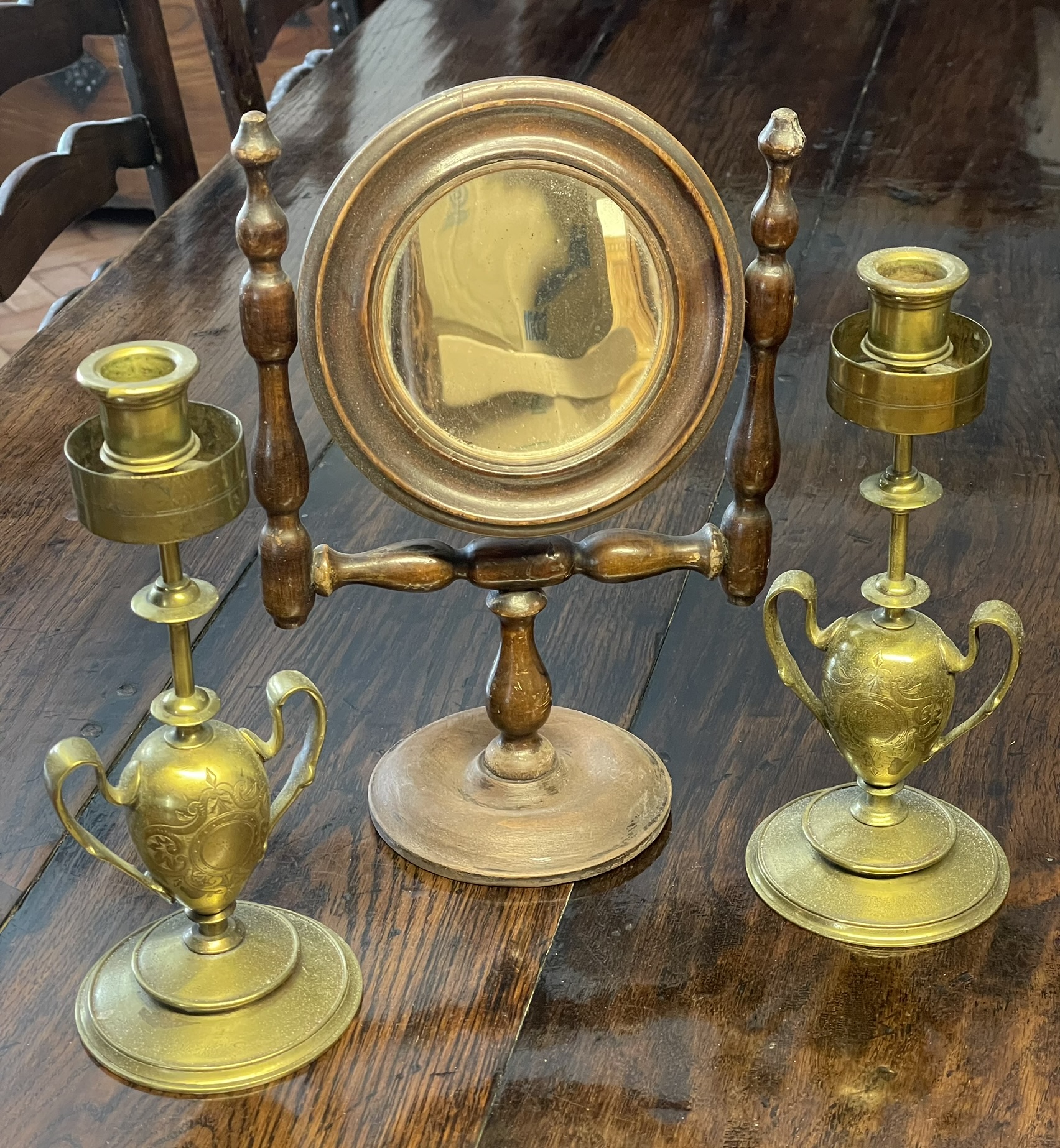 A Pair Of Brass Candlesticks And Dressing Mirror