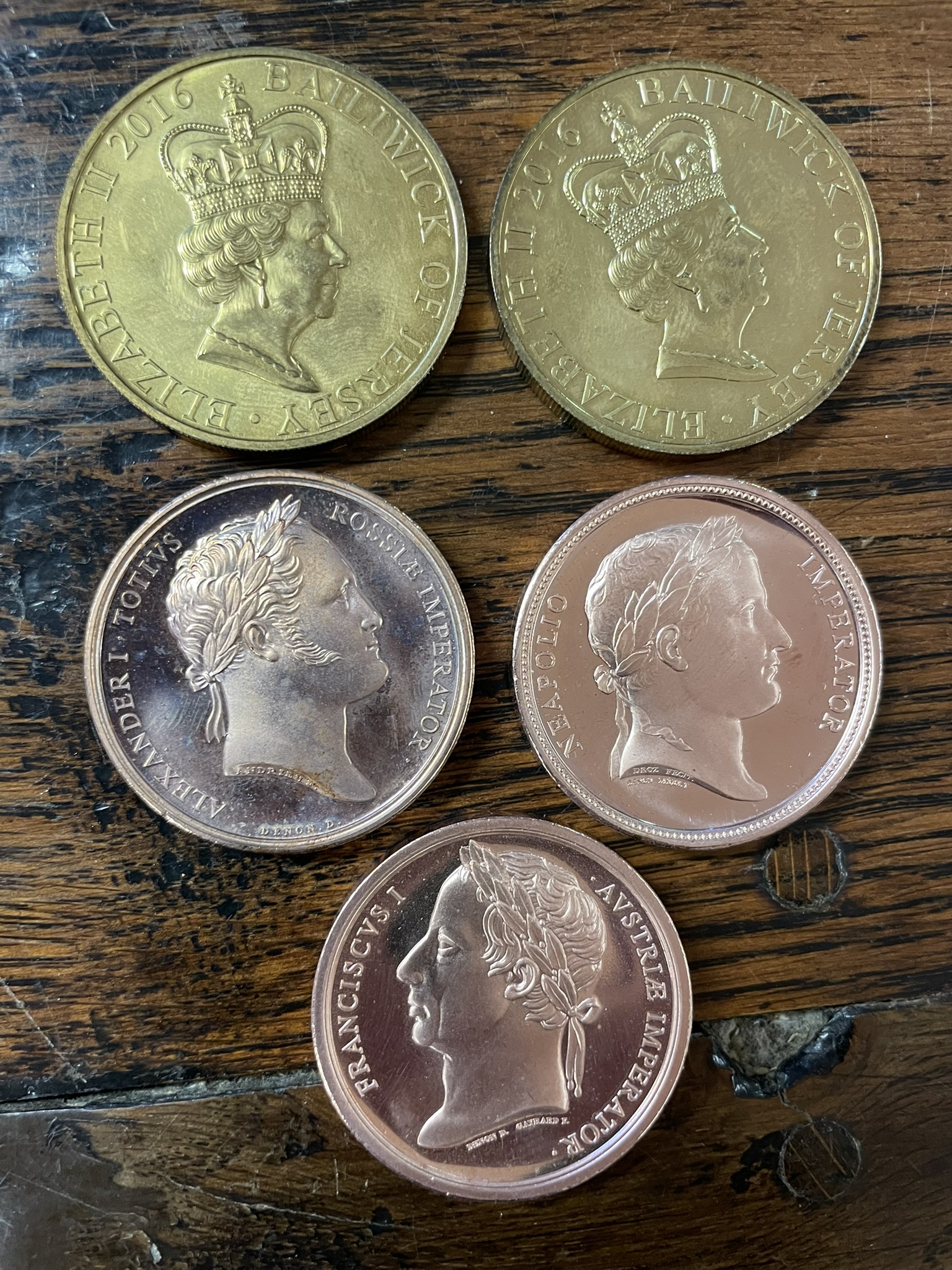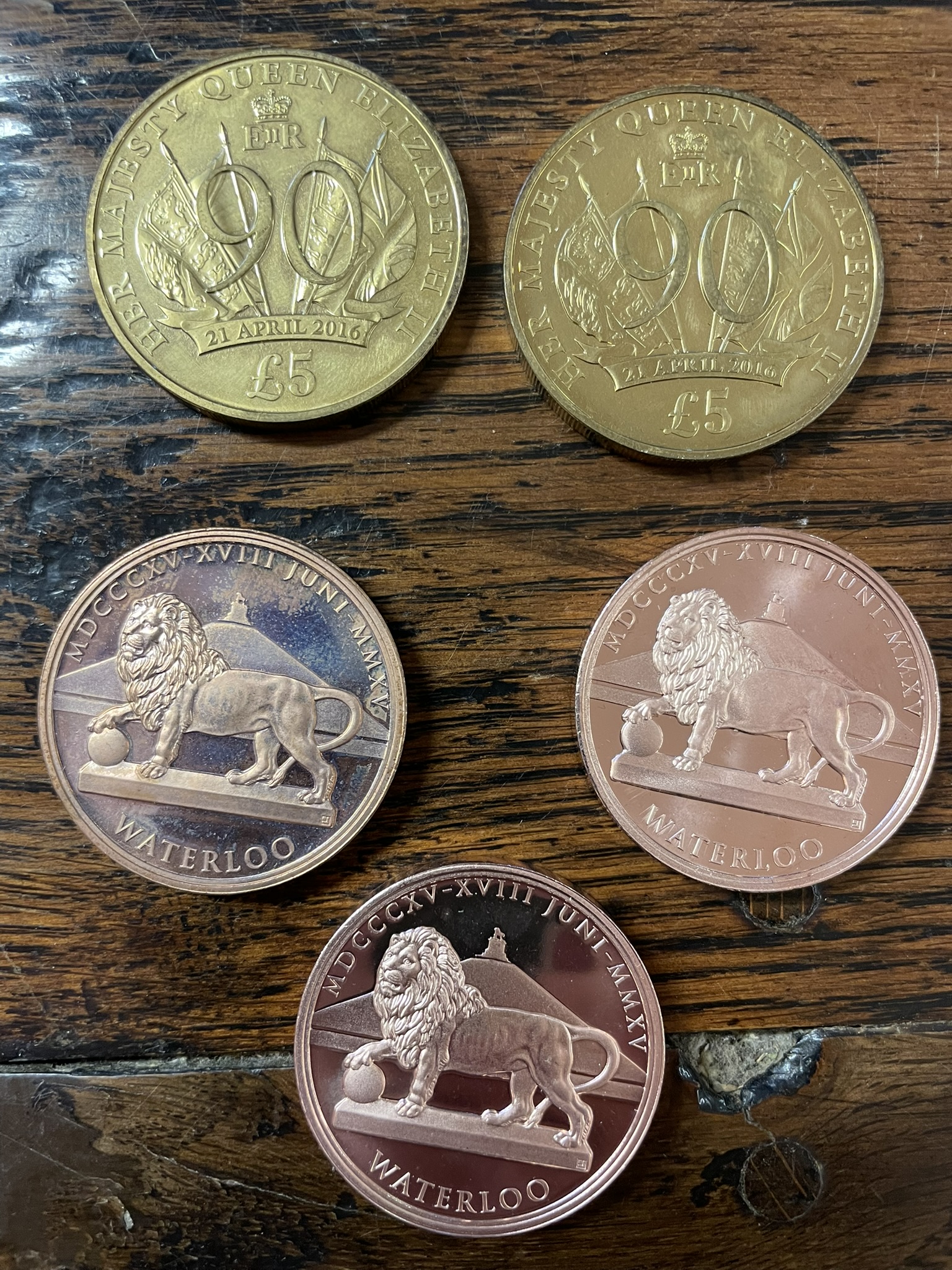 Two 5 Pound Coins & 3 Medals consisting two Jersey £5 coins commemorating Queen Elizabeth II’s 90th birthday and three commemorative medals for the Battle Of Waterloo.