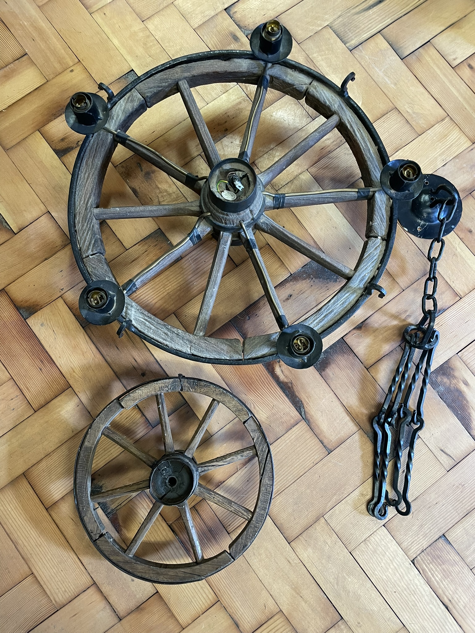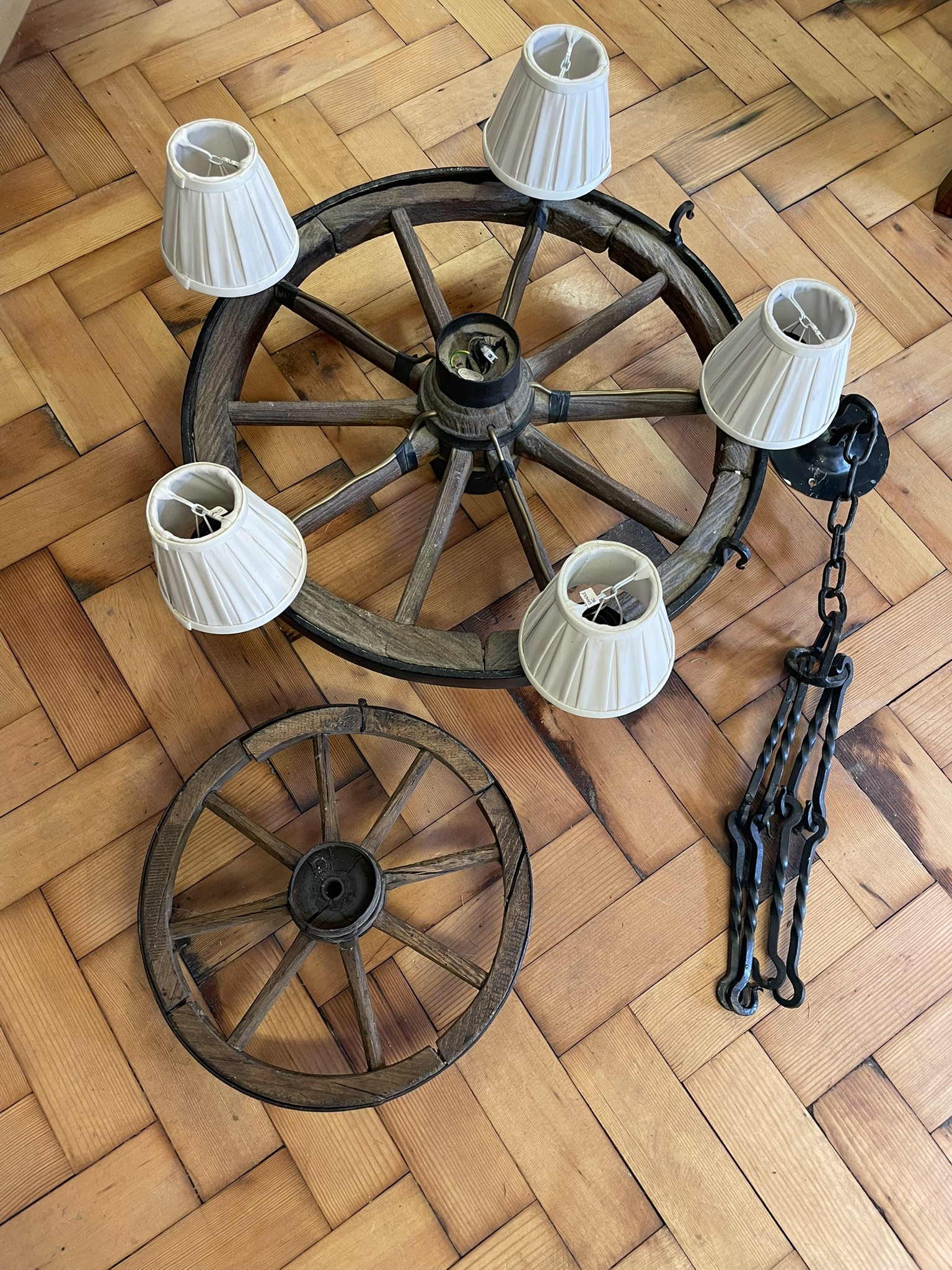 A Cartwheel Chandelier With One Other Wheel