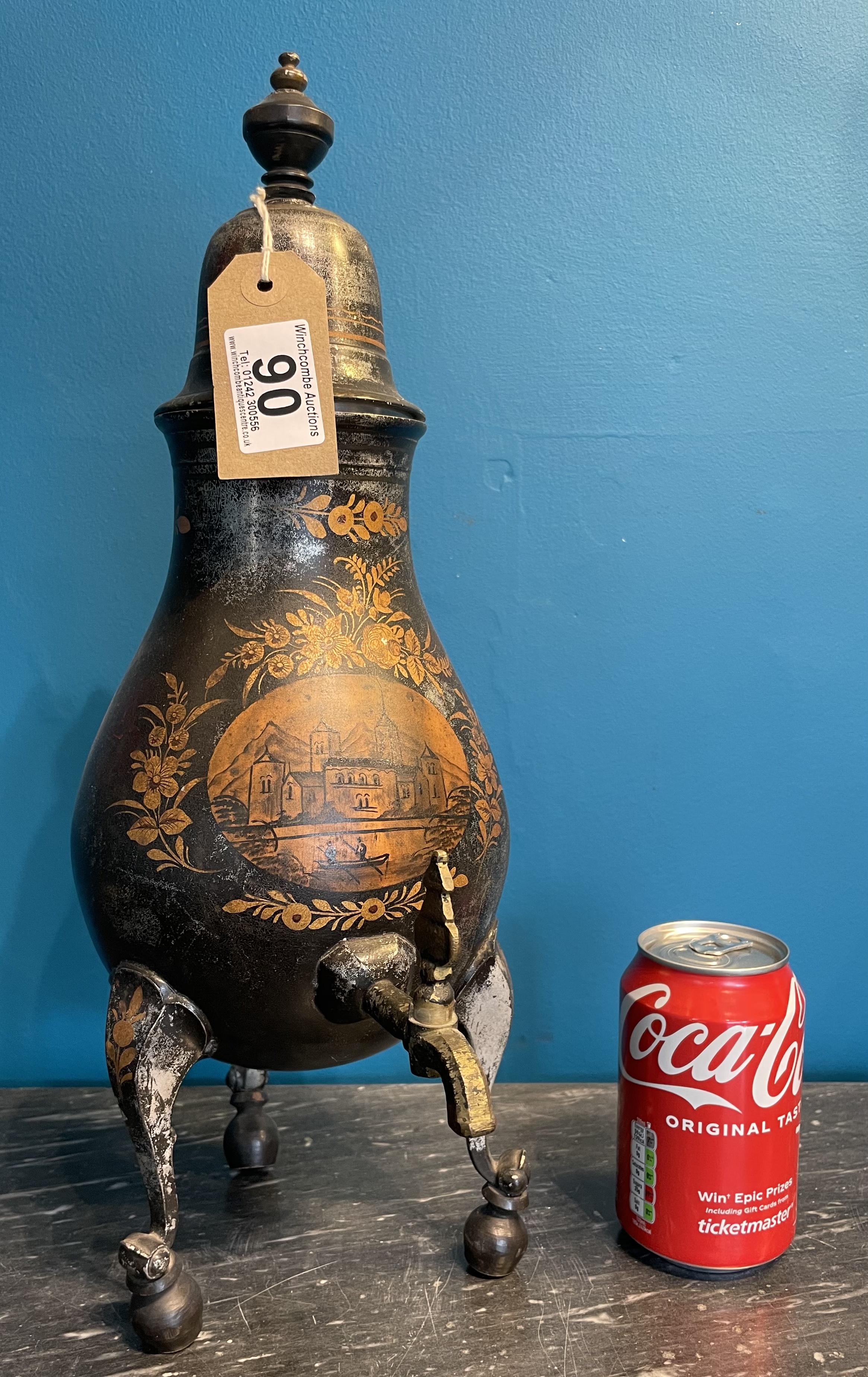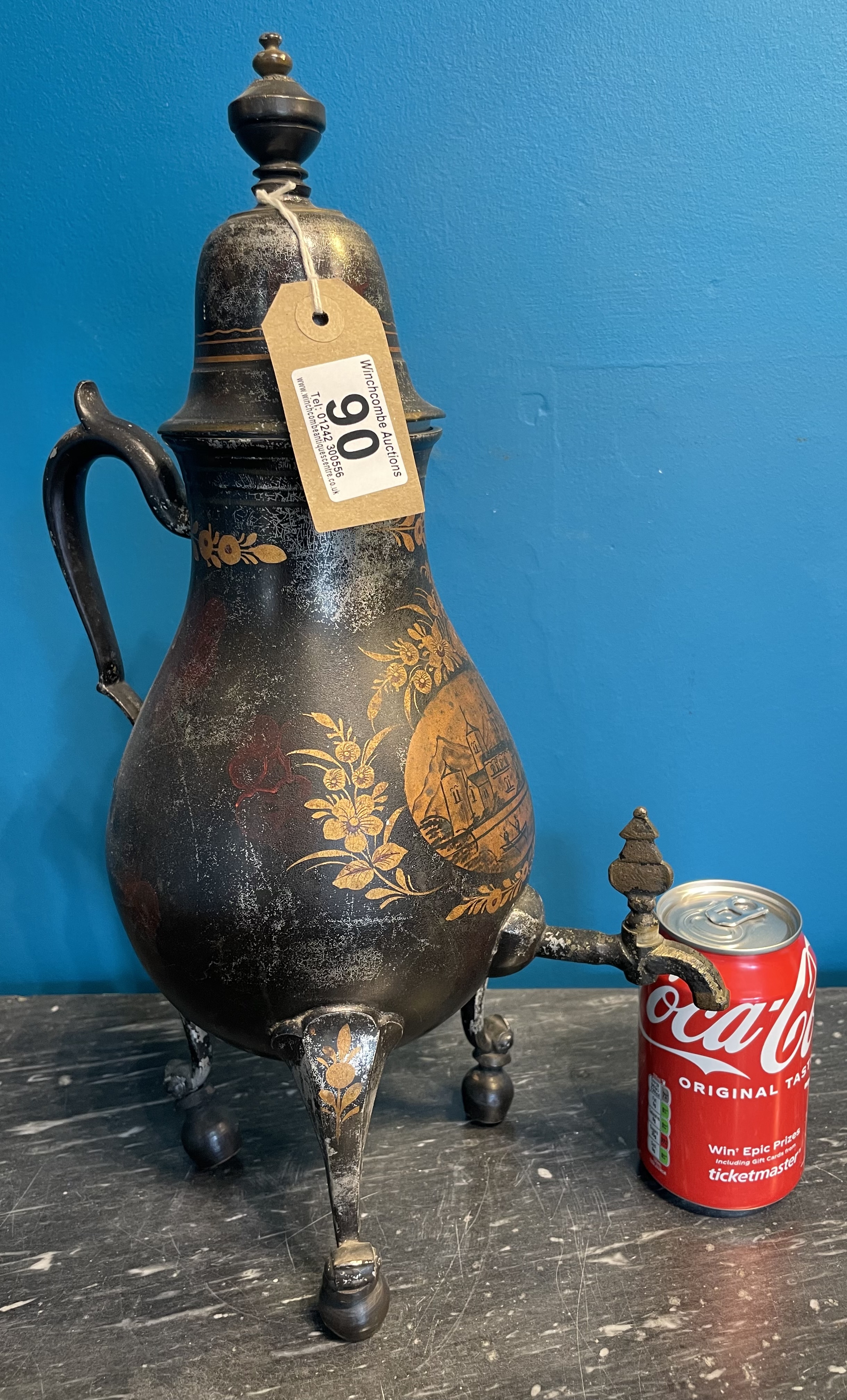 A 19th Century Rare Dutch Pewter Coffee Pot With Painted Castle Scene