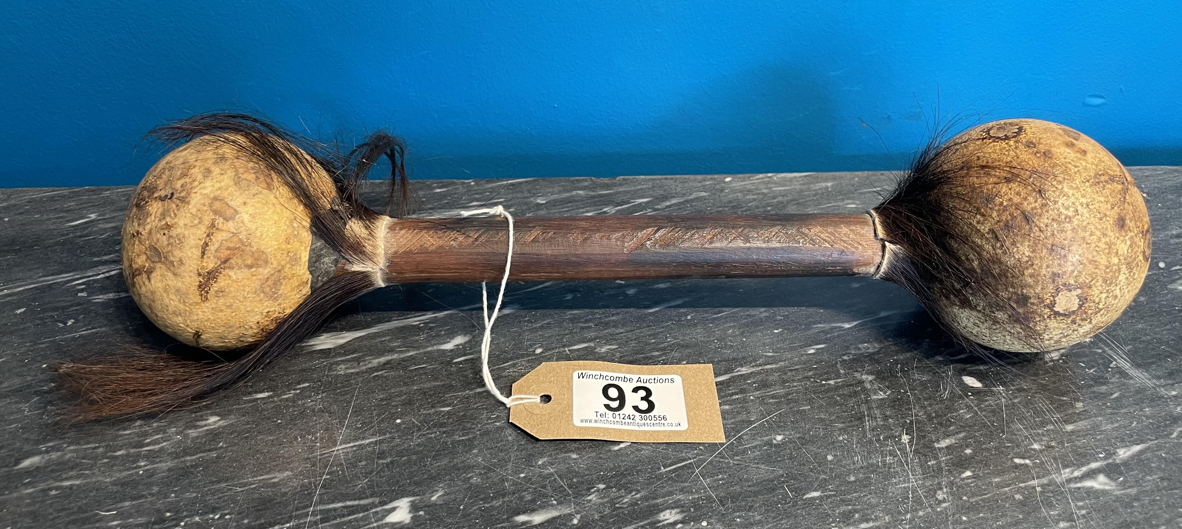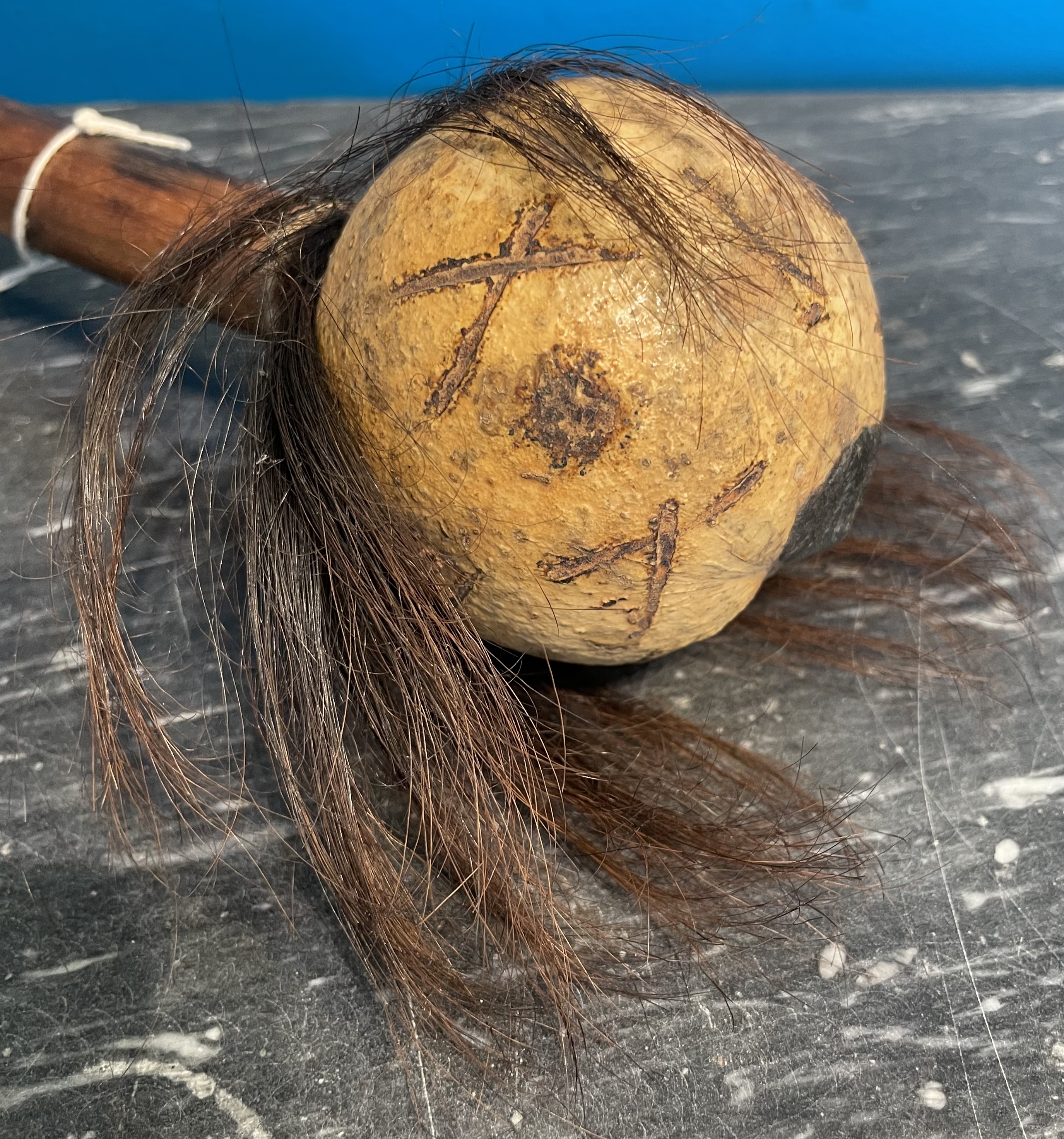 A Shaman Rattle With Wooden Shaft And Rattles Either Side With Hair Around